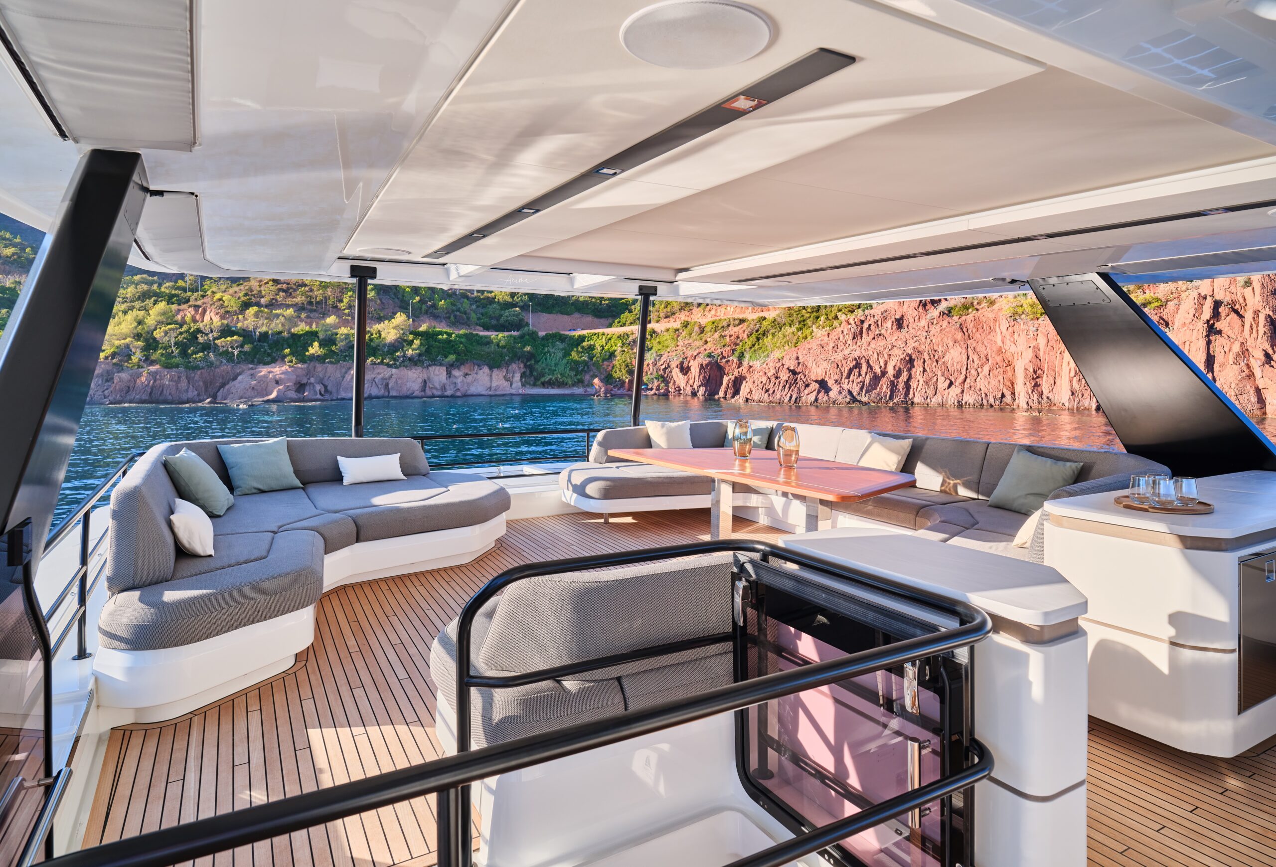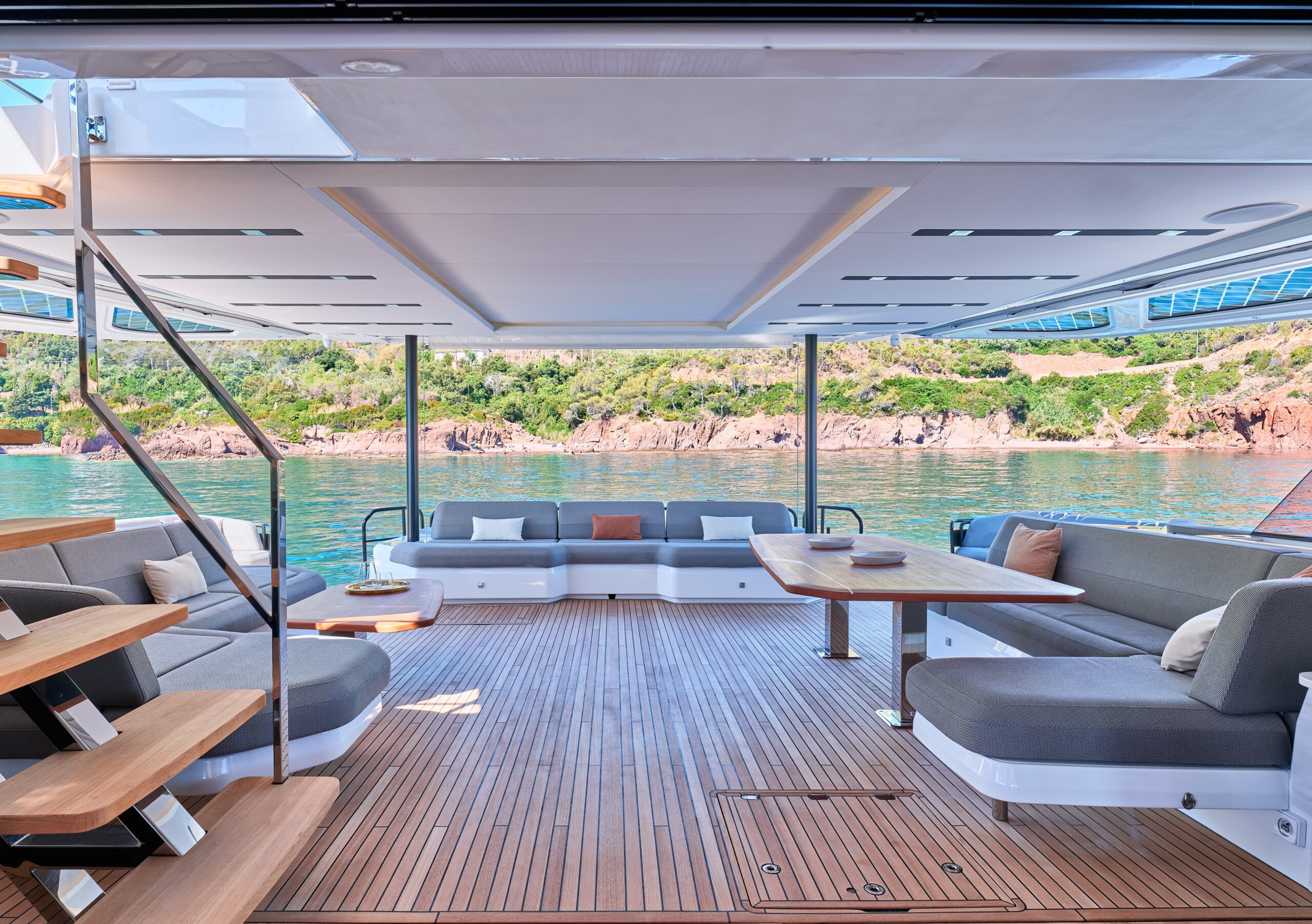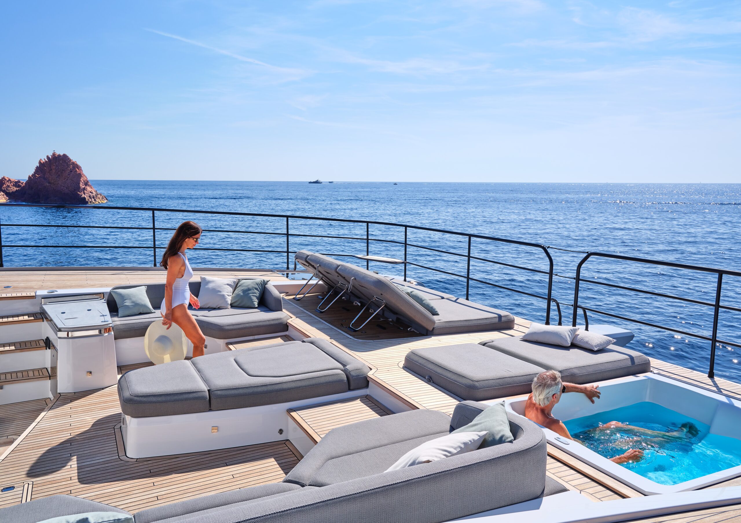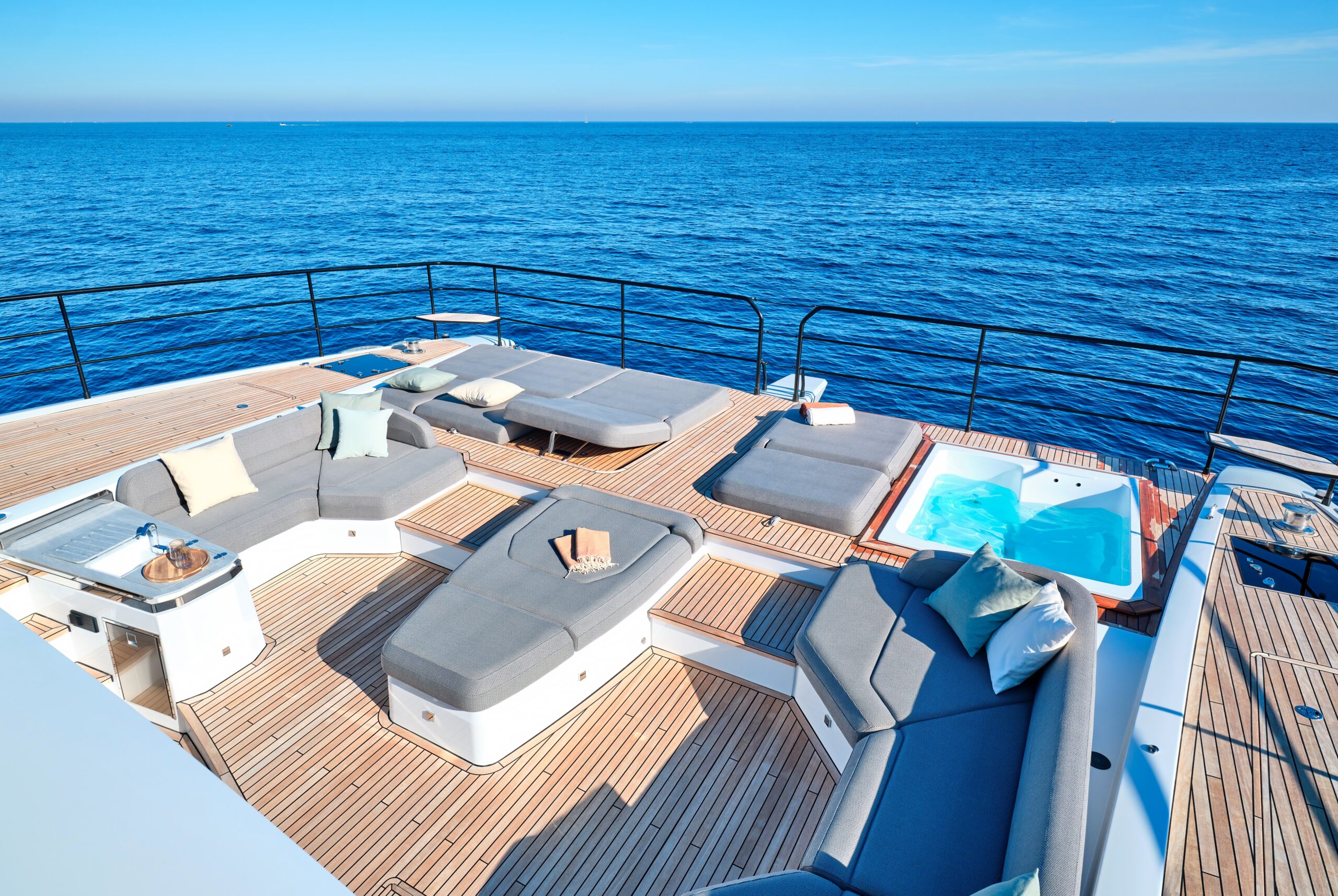 The remarkable deck areas span 250m² of entertaining space, all finished with the finest materials, while the immersible rear deck is ergonomically designed to make sea access safe and easy. The Power 80 affords all the features of an exclusive beach club, so you can take full advantage of the sea with the many water toys on offer.