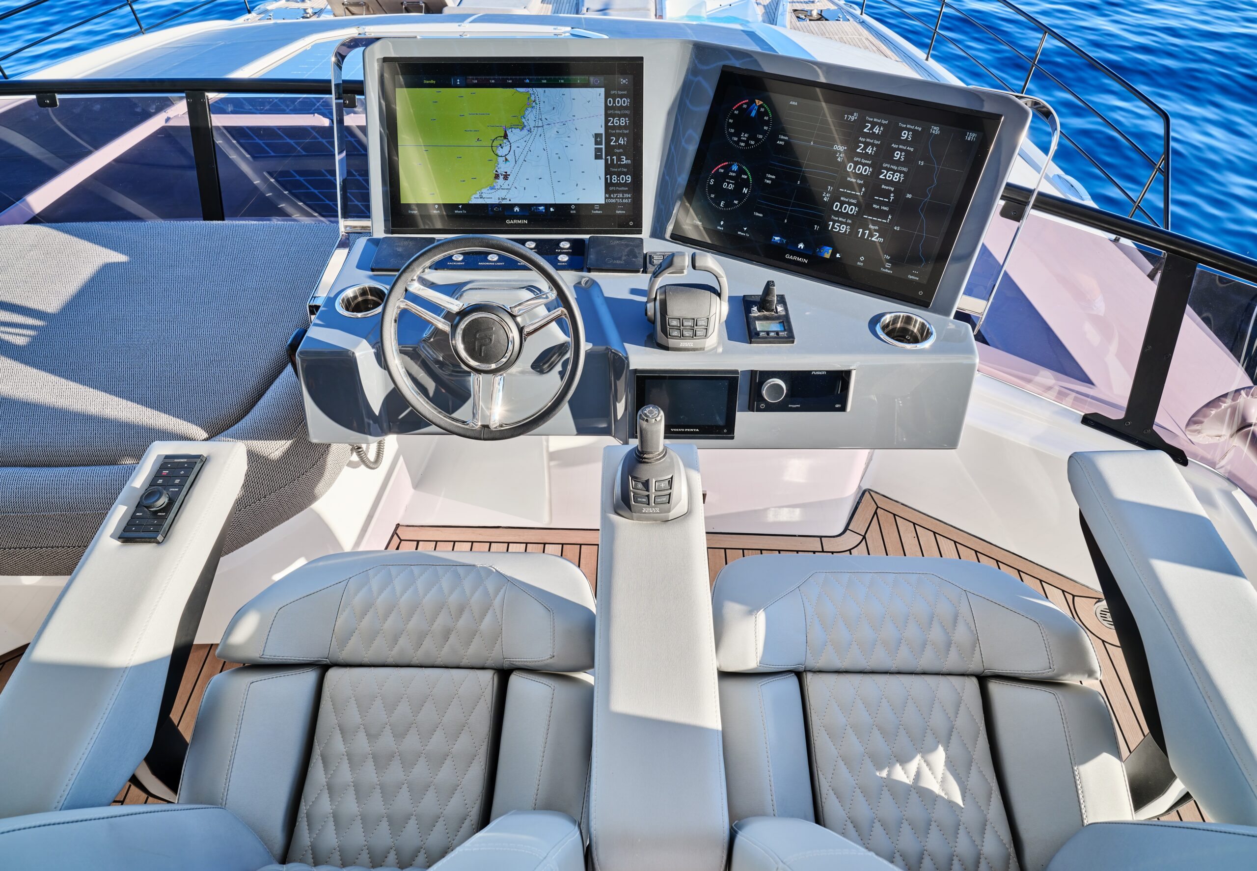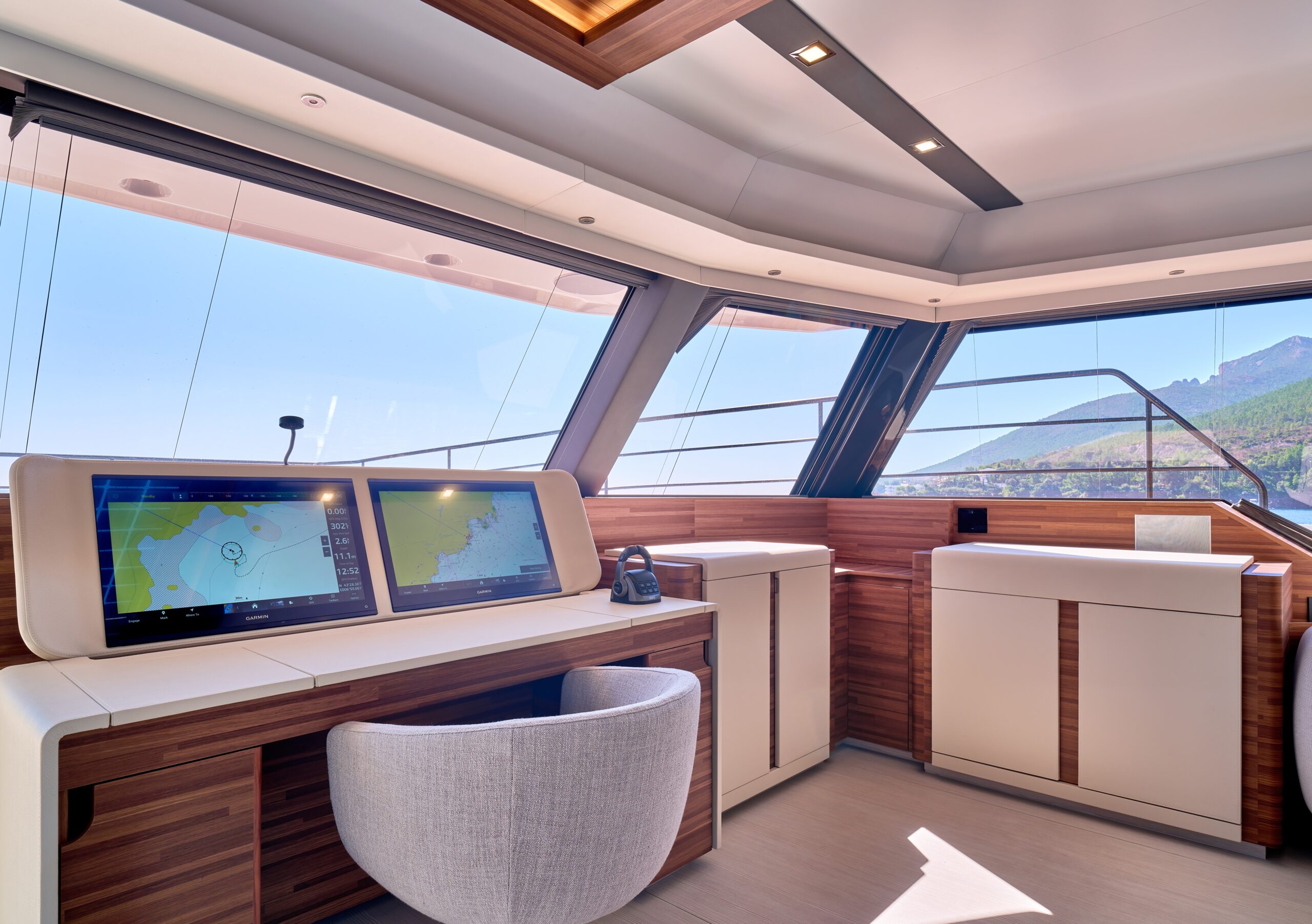 The interior is bathed in natural light courtesy of the expansive glass and retractable wings, which deliver stunning views. Her plush carpets and topstitched leather will impress the most discerning cruisers. With the flexibility to choose a lounge/dinette or a galley kitchen layout, clients can customise their Power 80 to suit their particular lifestyle and cruising needs.