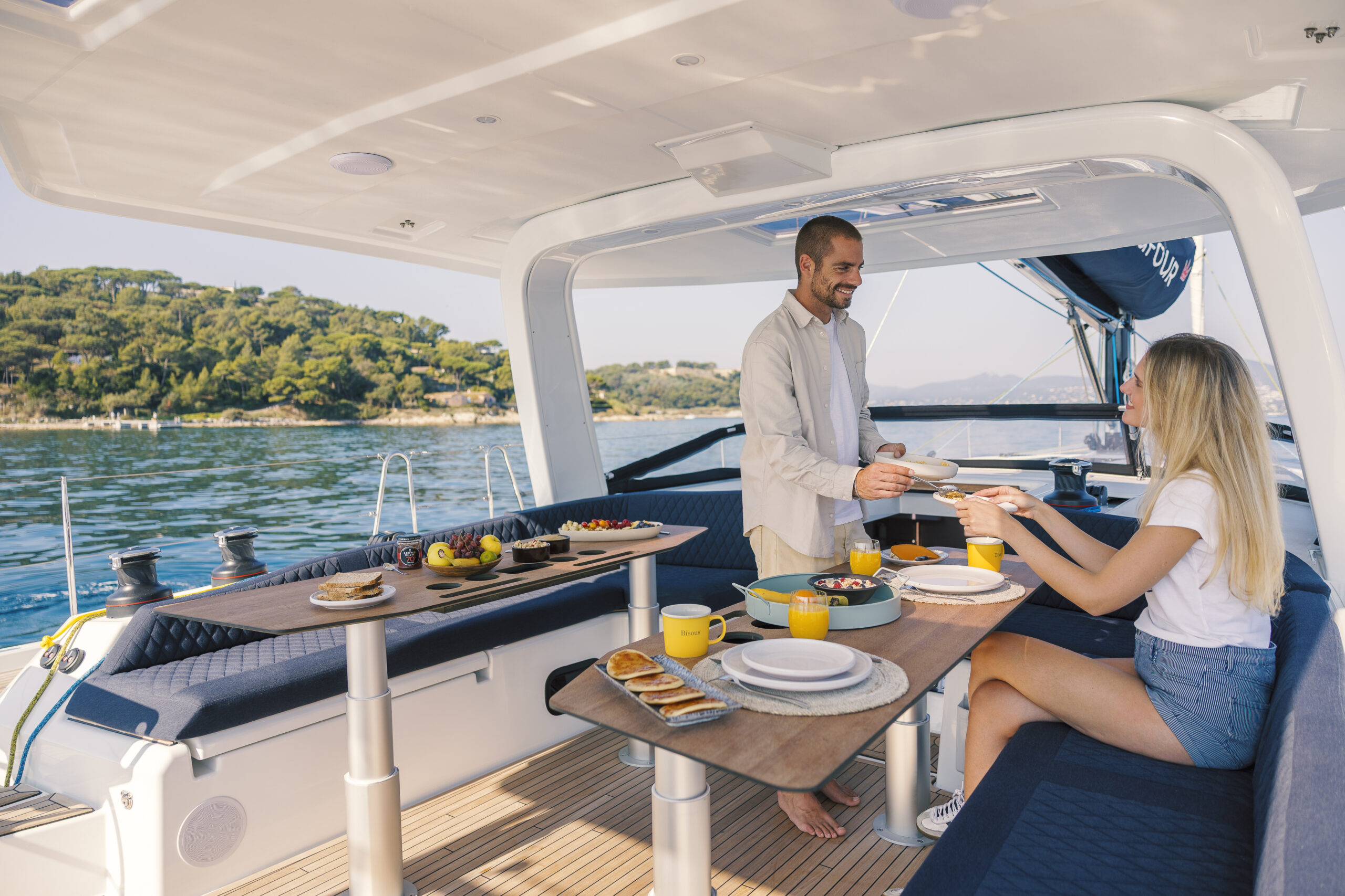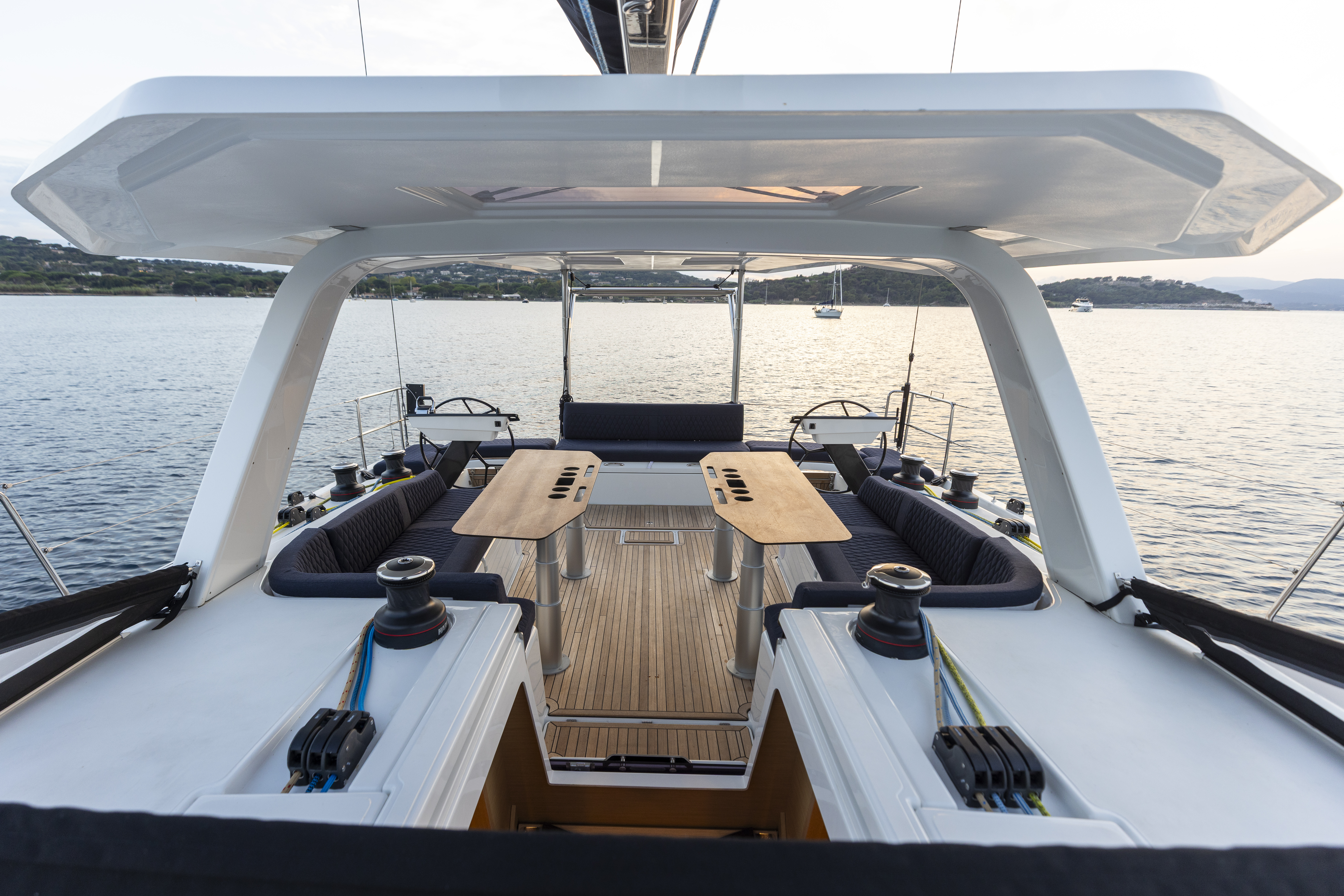 The innovative U-shaped Sky Lounge Cockpit allows for comfortable socialising and interaction. The cockpit tables can be easily converted into sun loungers, providing a versatile space to relax at anchor or underway.