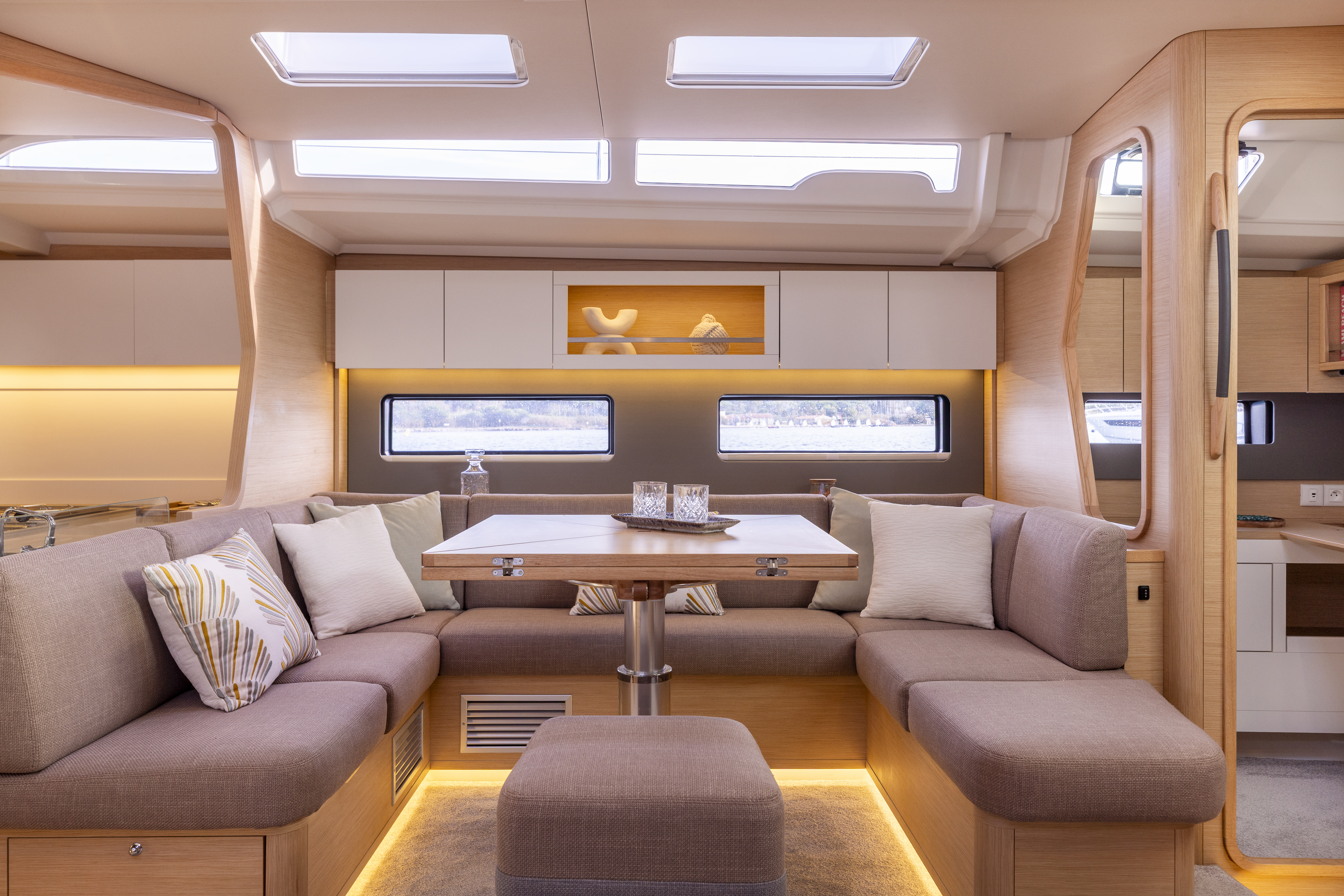 The saloon features flexible seating arrangements to suit the number of guests aboard. The saloon table is designed for social dining and can accommodate a range of guest configurations.