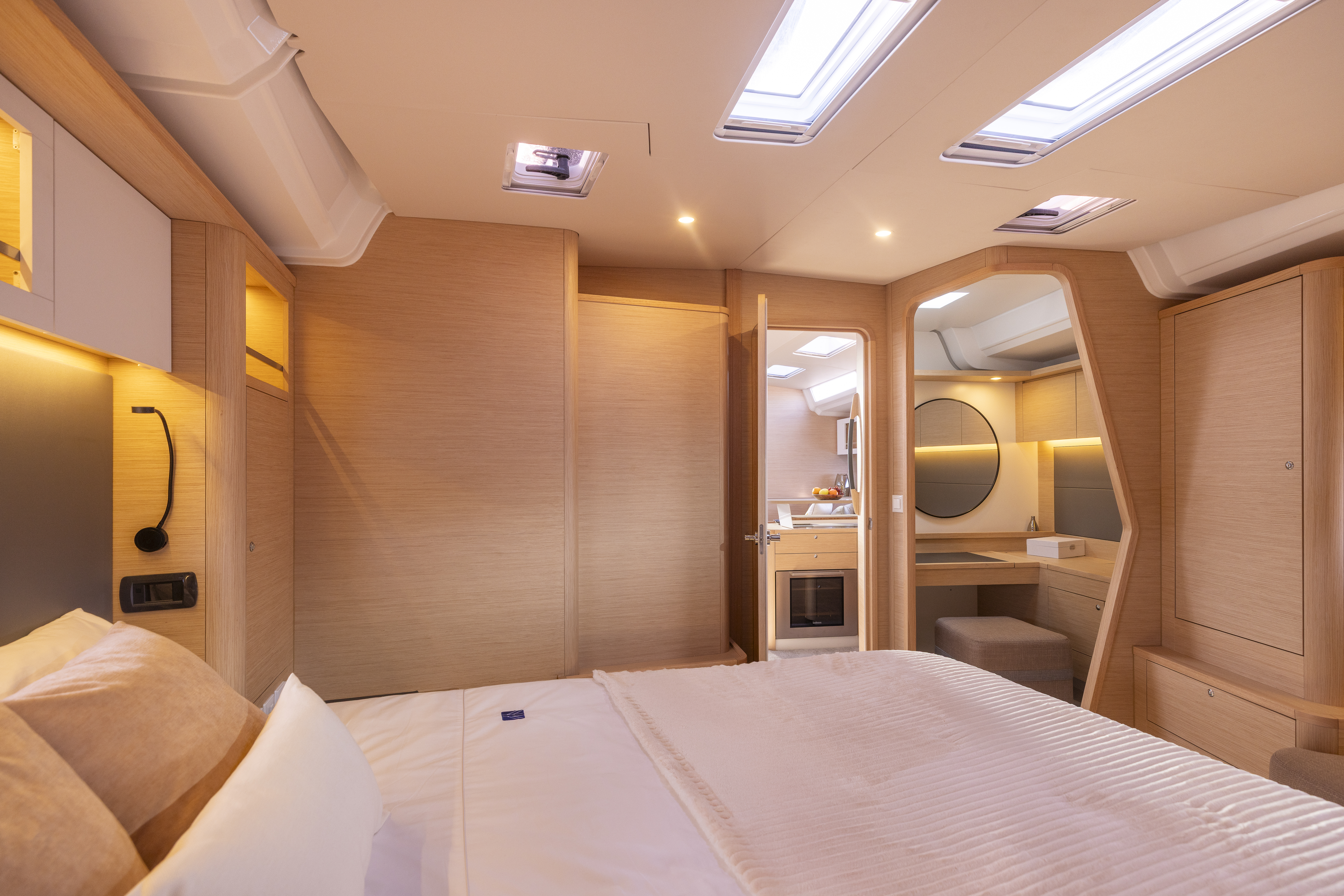 The forward cabin, illuminated by large coachroof windows, ensures absolute privacy and offers a peaceful setting with sky views and ambient lighting that contributes to the overall comfort of the space.