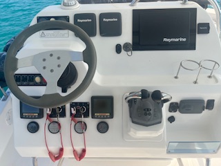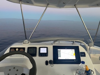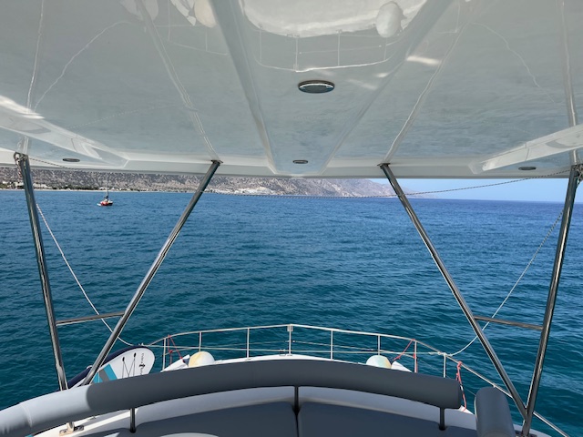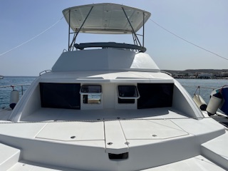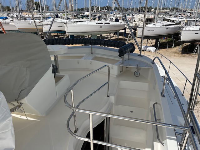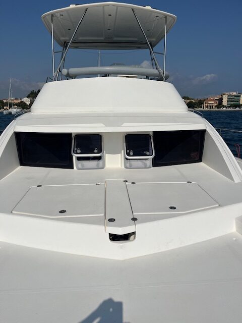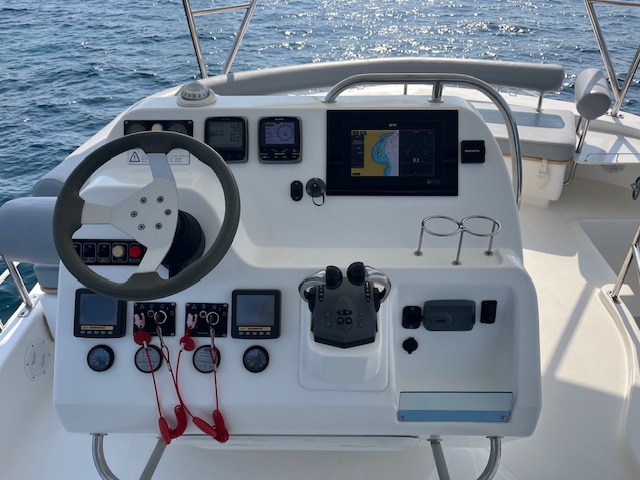 On deck, a spacious aft cockpit features custom cushions and a large dining table under a solid bimini. Wide side decks ensure safe movement forward. The helm station is fully equipped with a new 2024 Raymarine Axiom 9 display, providing clear and reliable navigation.