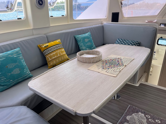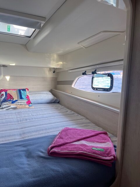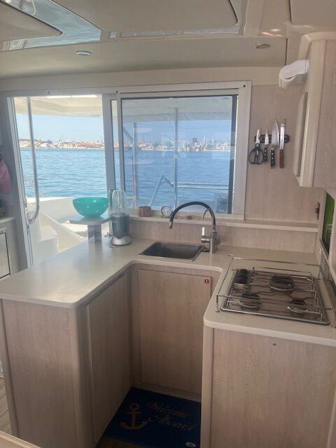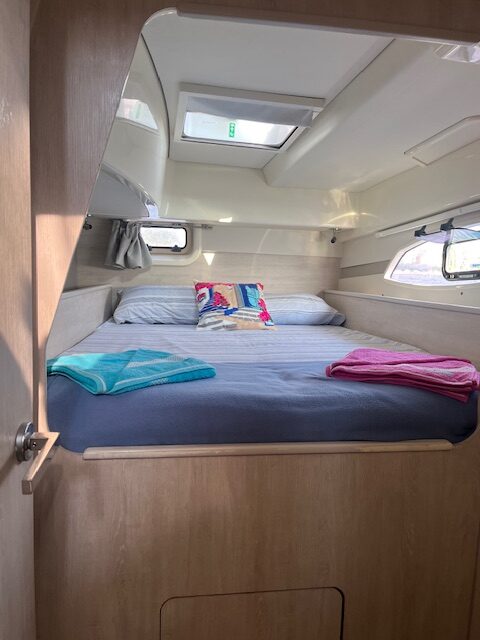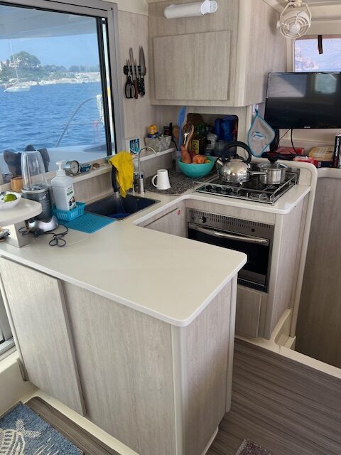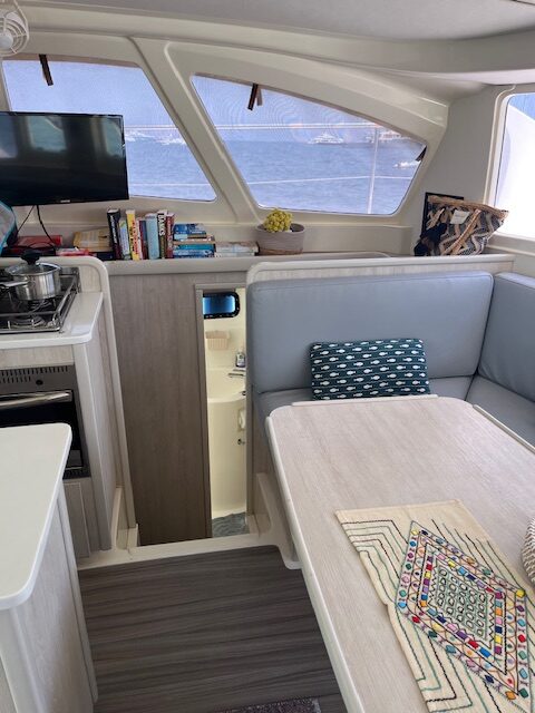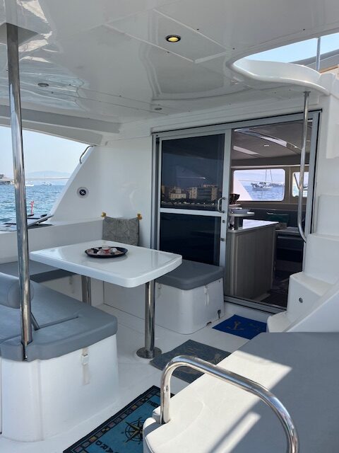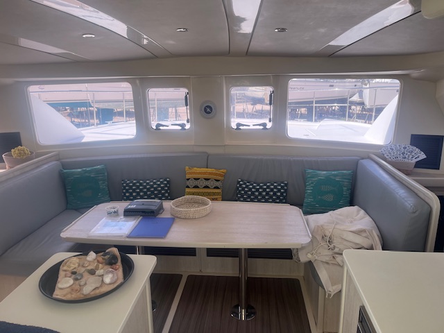 The layout includes four double cabins, two heads with separate showers, and single bow berths—making her ideal for families or guests. The saloon is light-filled, with panoramic windows, U-shaped seating, and a well-equipped galley to port. The nav station sits opposite. Air conditioning is fitted throughout.