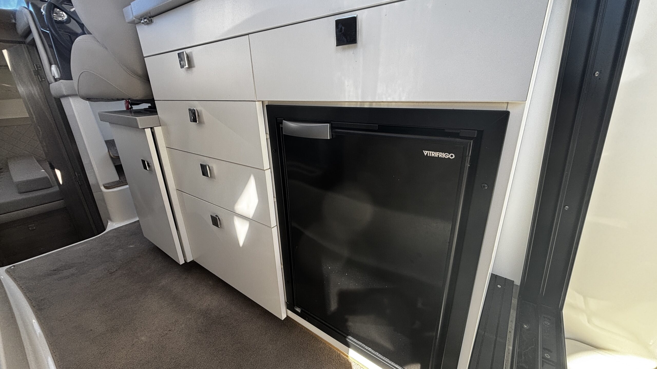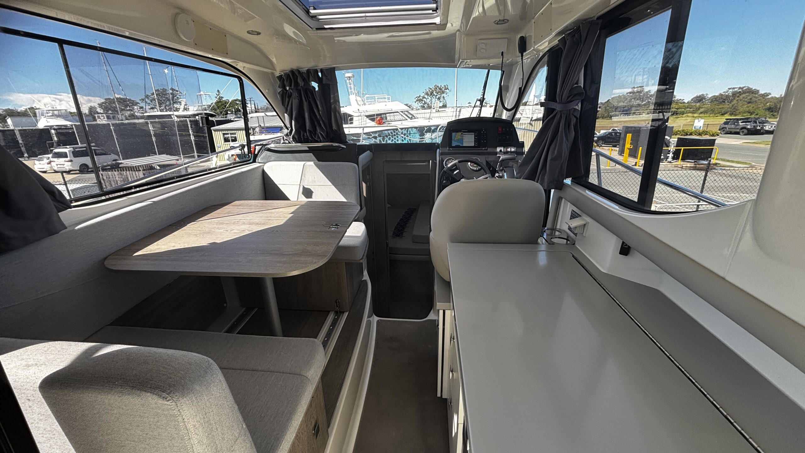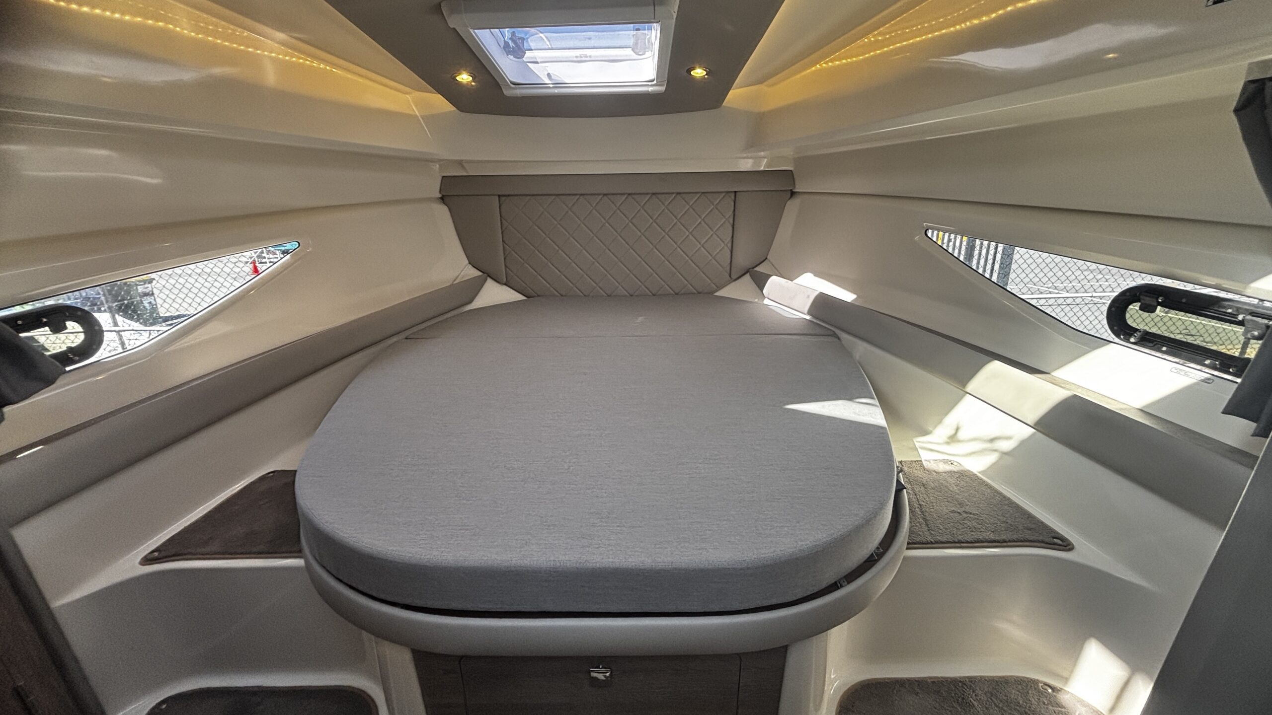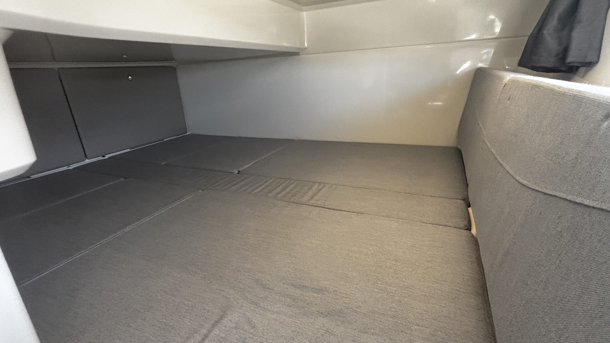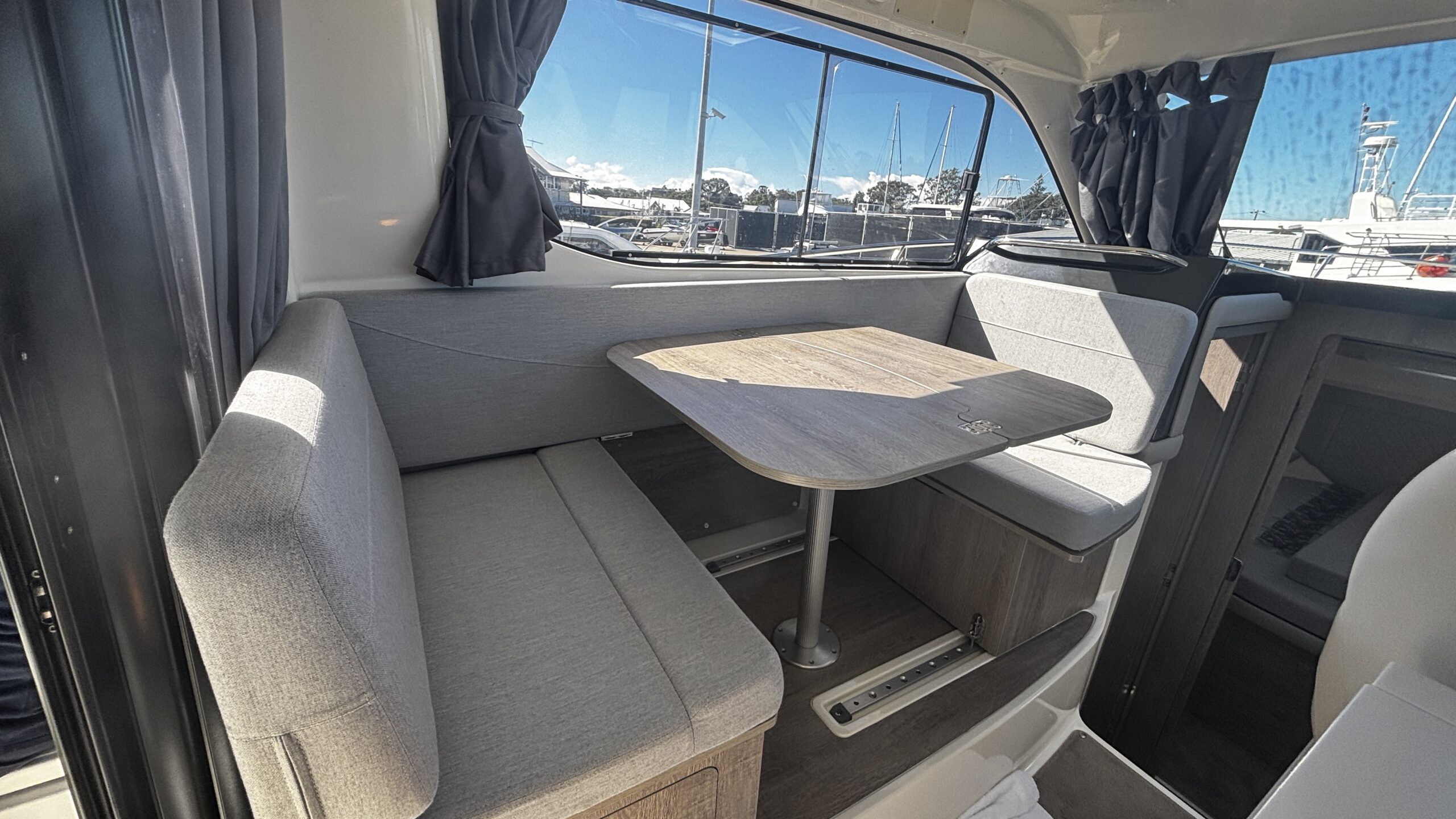 Designed for both relaxation and practicality, the interior layout includes a spacious island berth forward, a double berth beneath the main deck, and a convertible dinette that transforms into a U-lounge or forward-facing seat. The modern galley is equipped with a stove, sink and refrigerator, finished with contemporary materials and attention to detail.