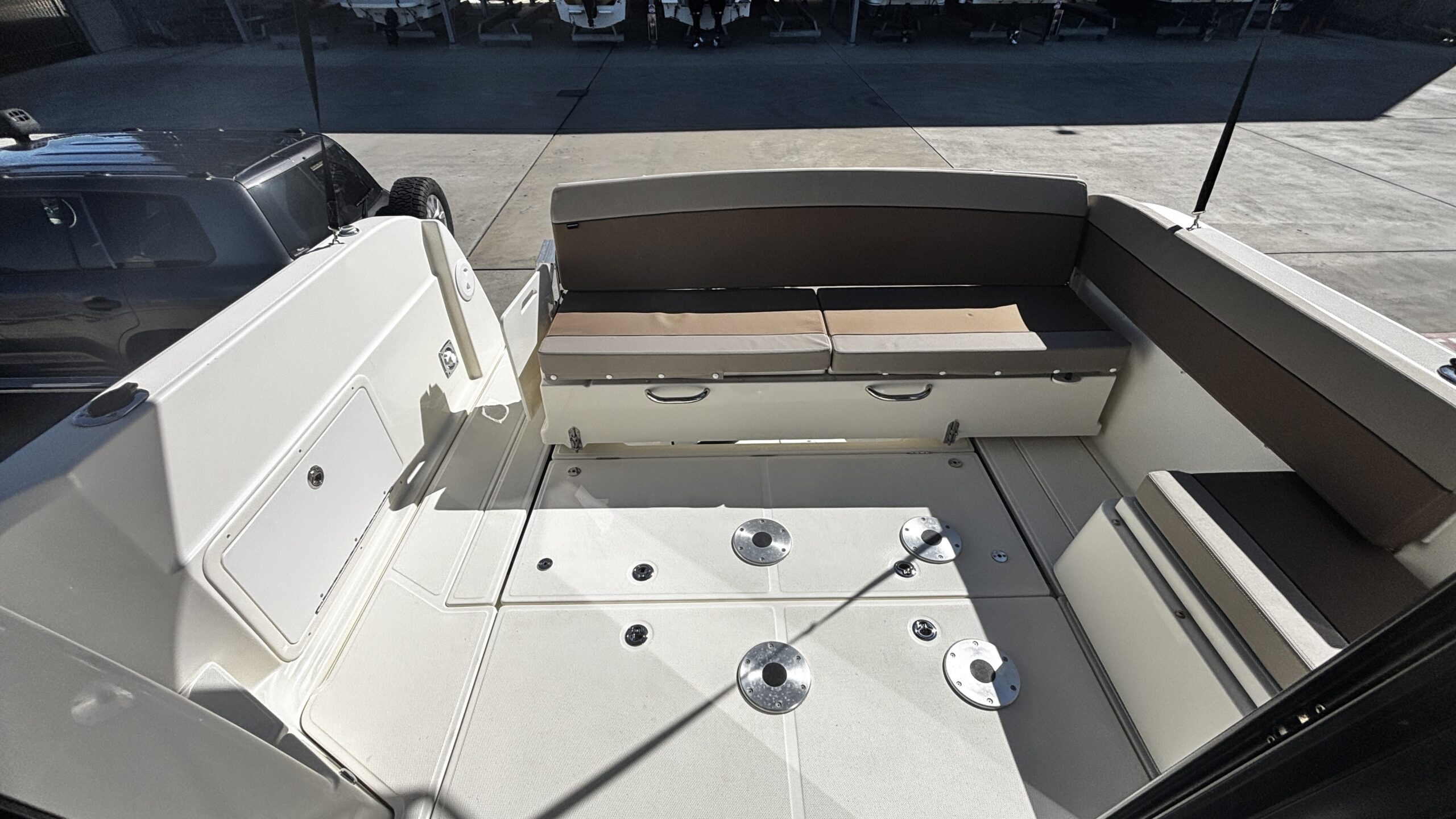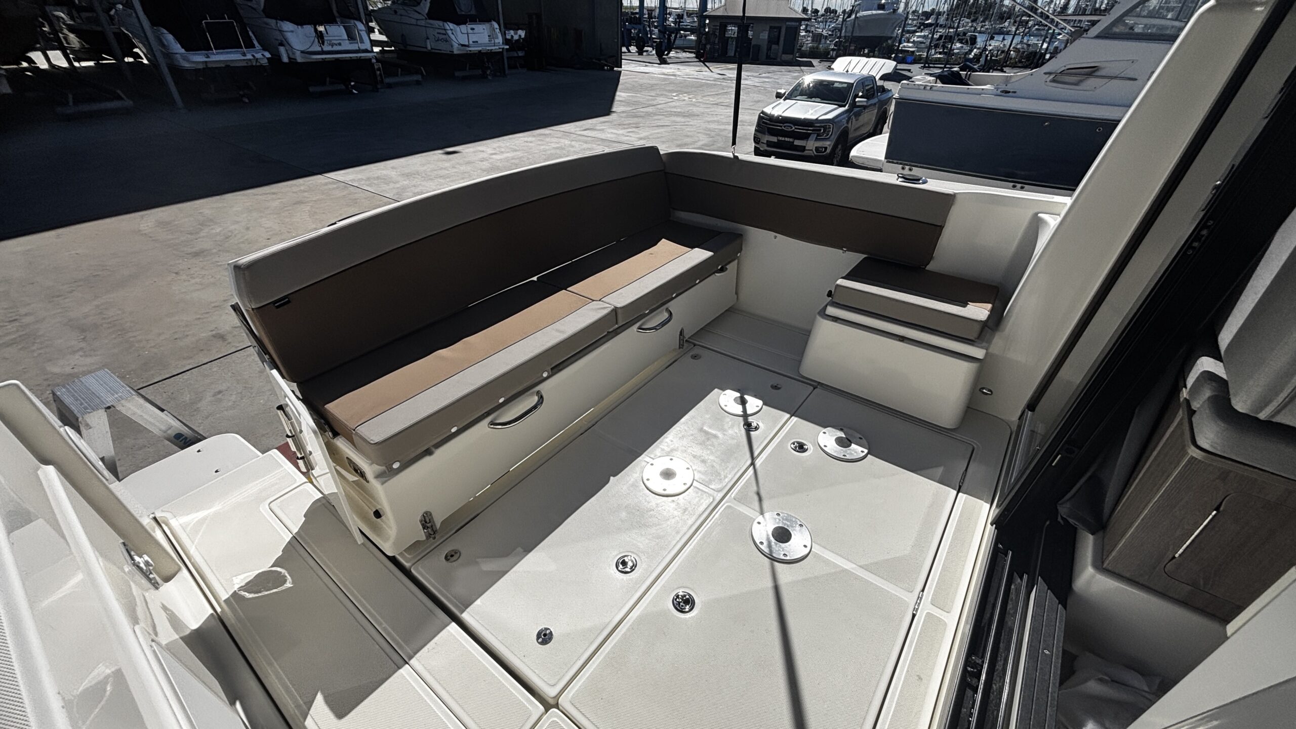 Large 360-degree windows flood the cabin with natural light, while sliding side and rear doors allow for excellent ventilation and seamless access throughout. Wide side decks, a walk-through transom, and dual swim platforms with an integrated swim ladder and transom deck shower provide safe, effortless movement onboard and into the water.