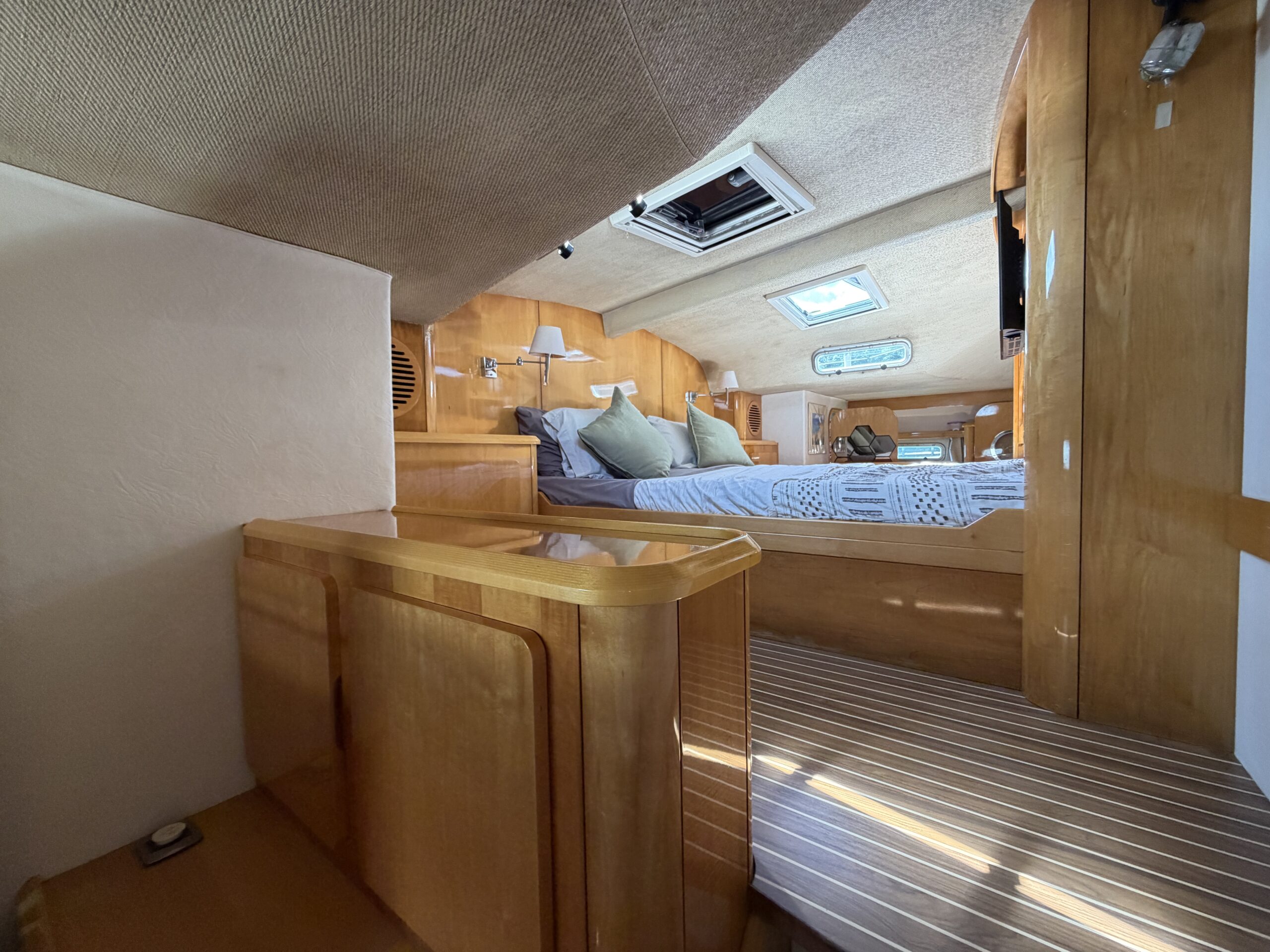 On the port side, the galley connects directly to the owner’s suite, allowing easy access at all hours. Aft of the galley is a second queen guest cabin with ensuite.