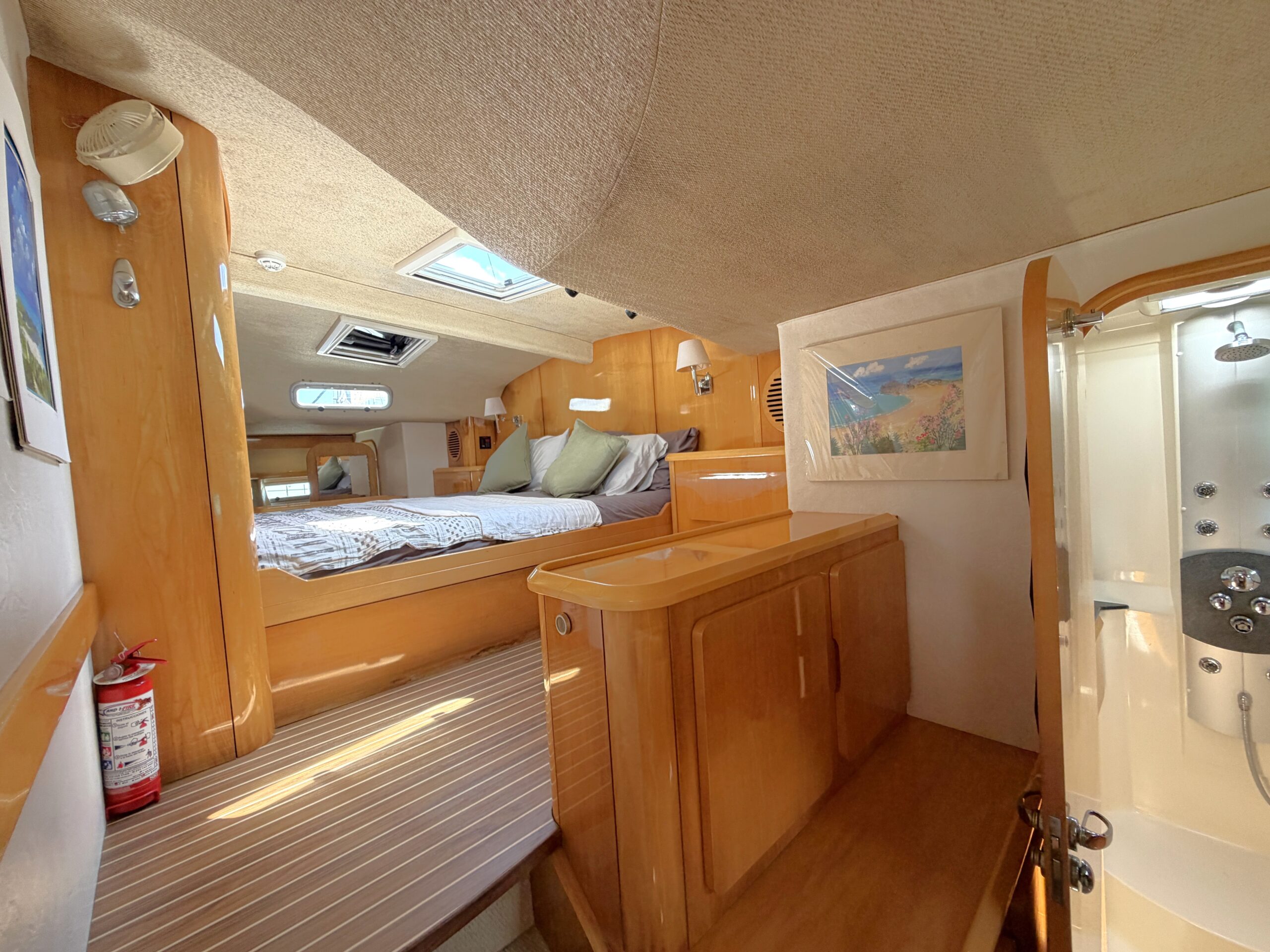 Forward, the impressive owner’s suite spans both hulls and the central nacelle, featuring a full-width king-size berth. Each hull includes private washing facilities – port with toilet and basin, starboard with a rain-style multisport shower. Aft on the starboard side is a spacious inboard pilot berth, additional storage outboard and a queen-size guest cabin with ensuite.