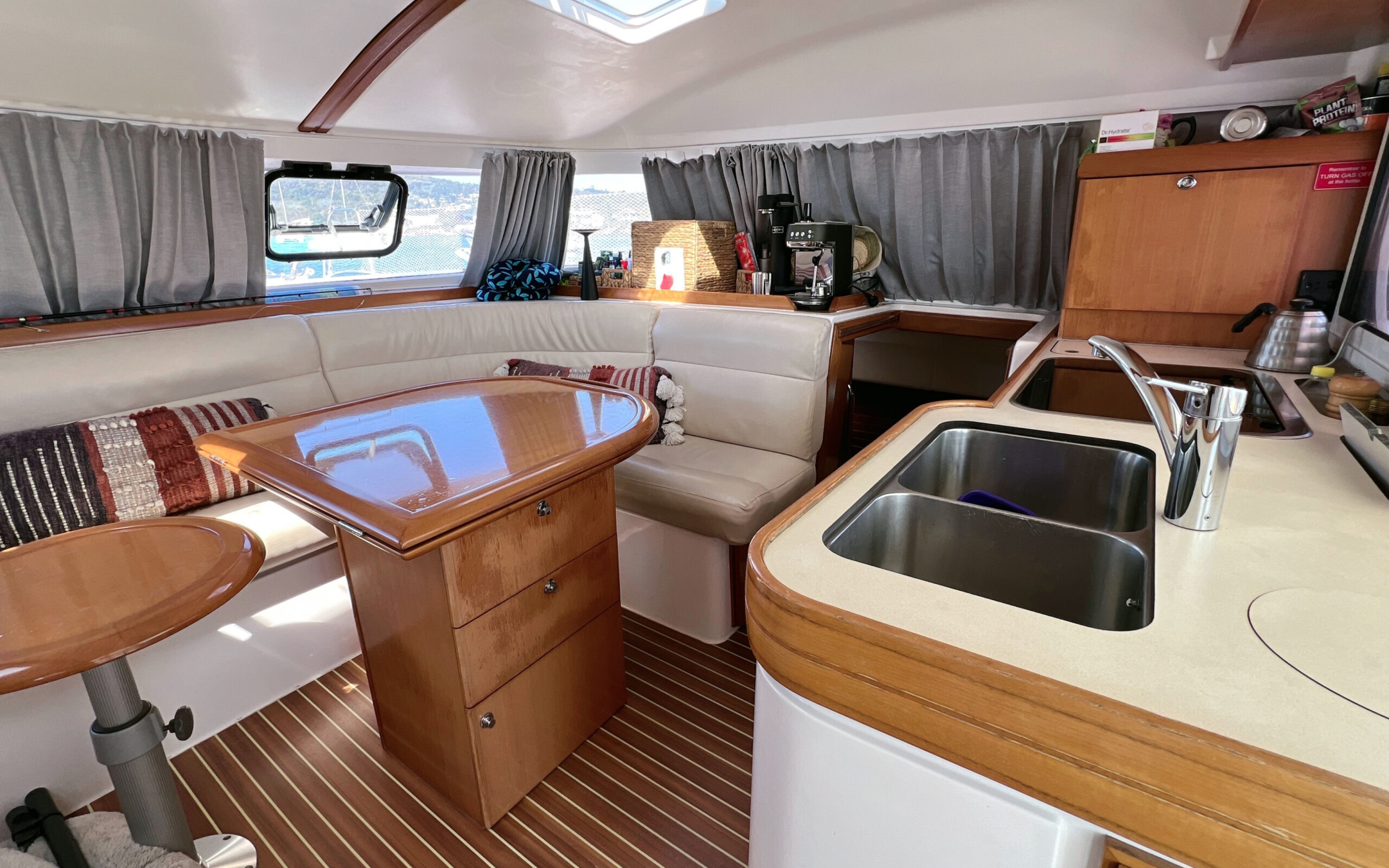 Designed for both coastal cruising and offshore passages, Tonic boasts wide decks, a GRP polyester hull, a mini keel and a large, secure cockpit, perfect for alfresco dining and entertaining. The efficient sail plan combined with shaded twin helm stations ensures smooth sailing and easy handling. The open plan gallery and saloon offer panoramic views and a generous u-shaped lounge with a cleverly designed table that converts from coffee table to dining table.
