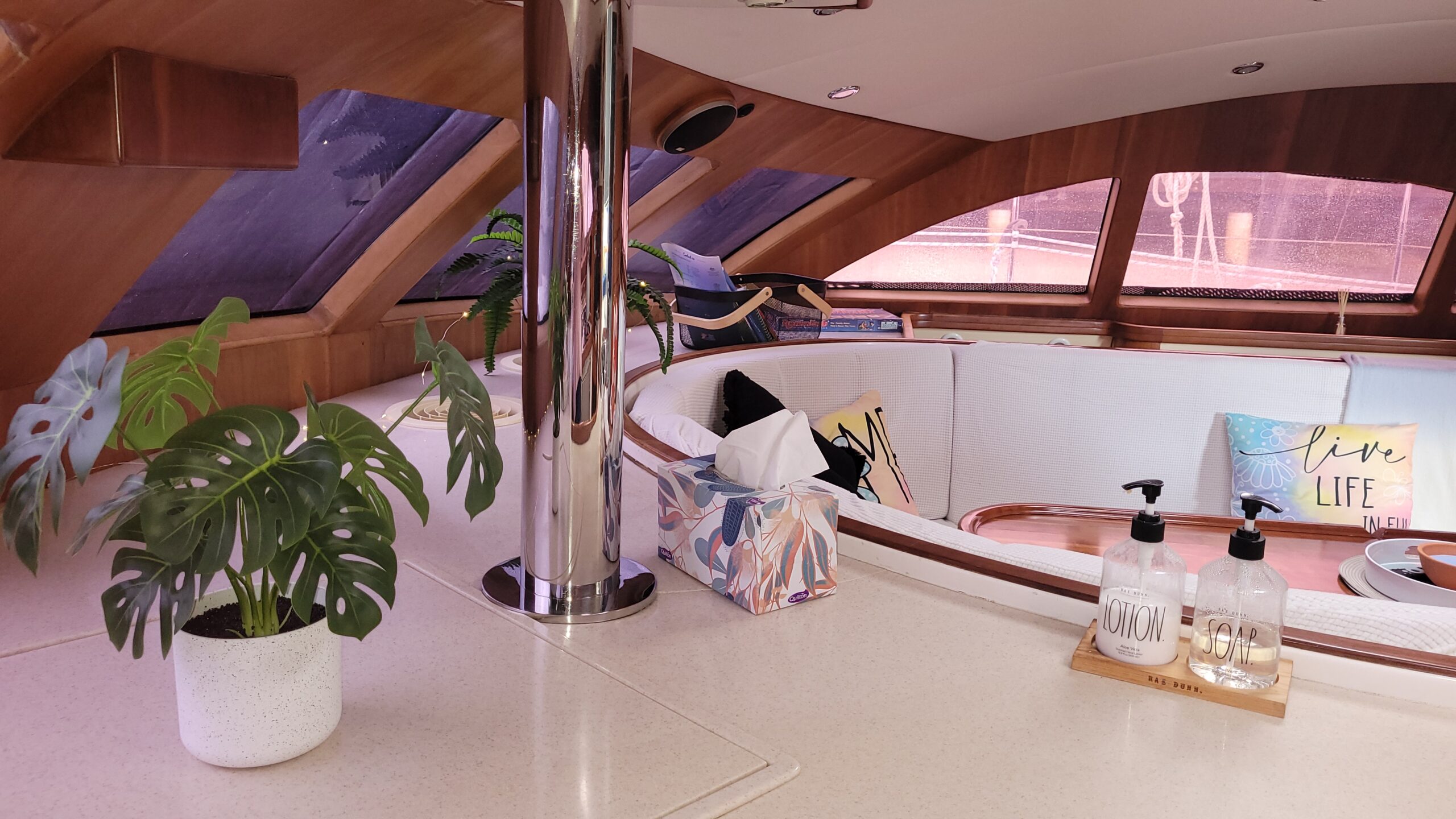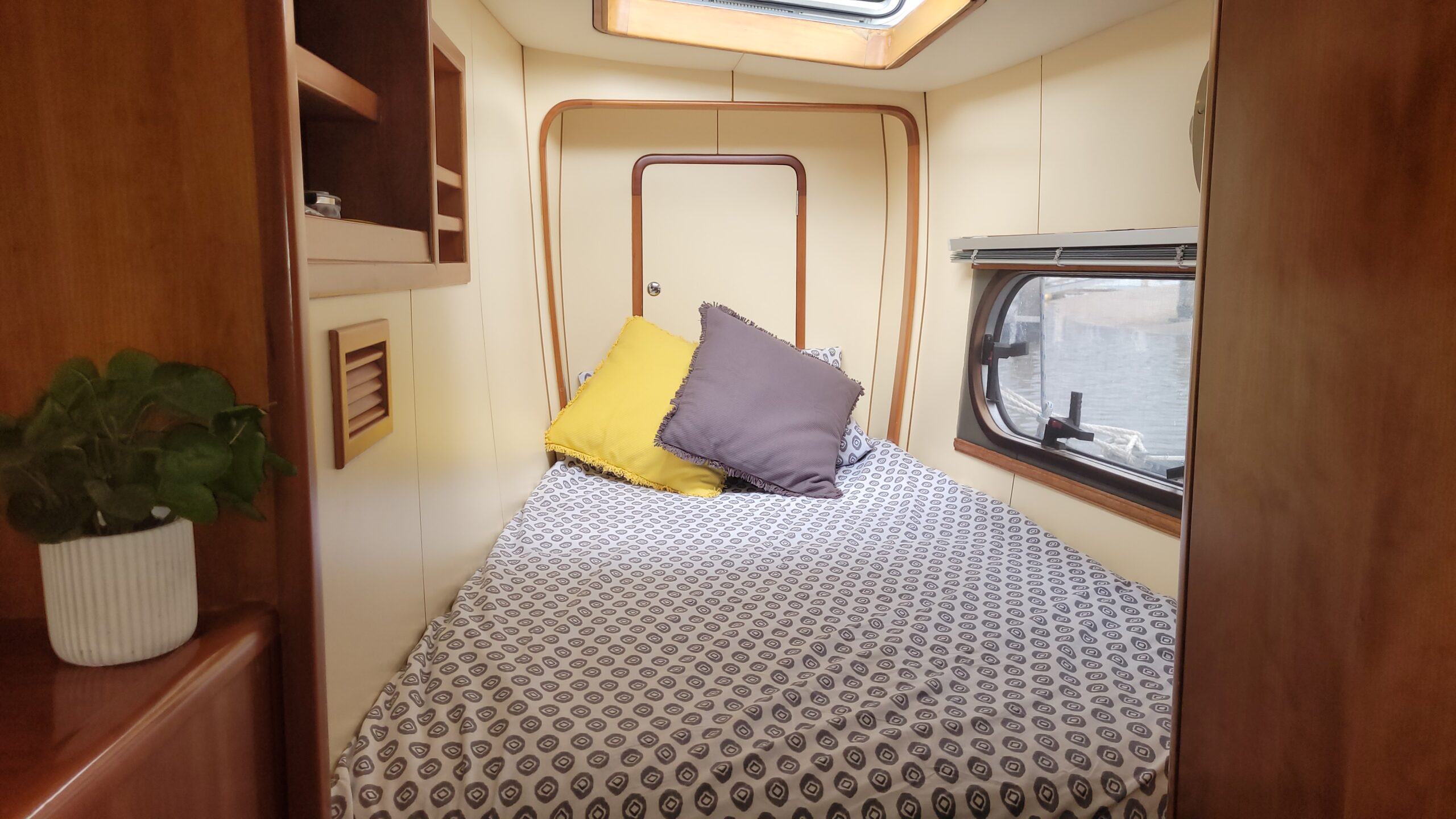 The starboard side has a big double bed cabin aft with ensuite and separate shower and a roomy three-quarter bunk cabin forward with great storage.