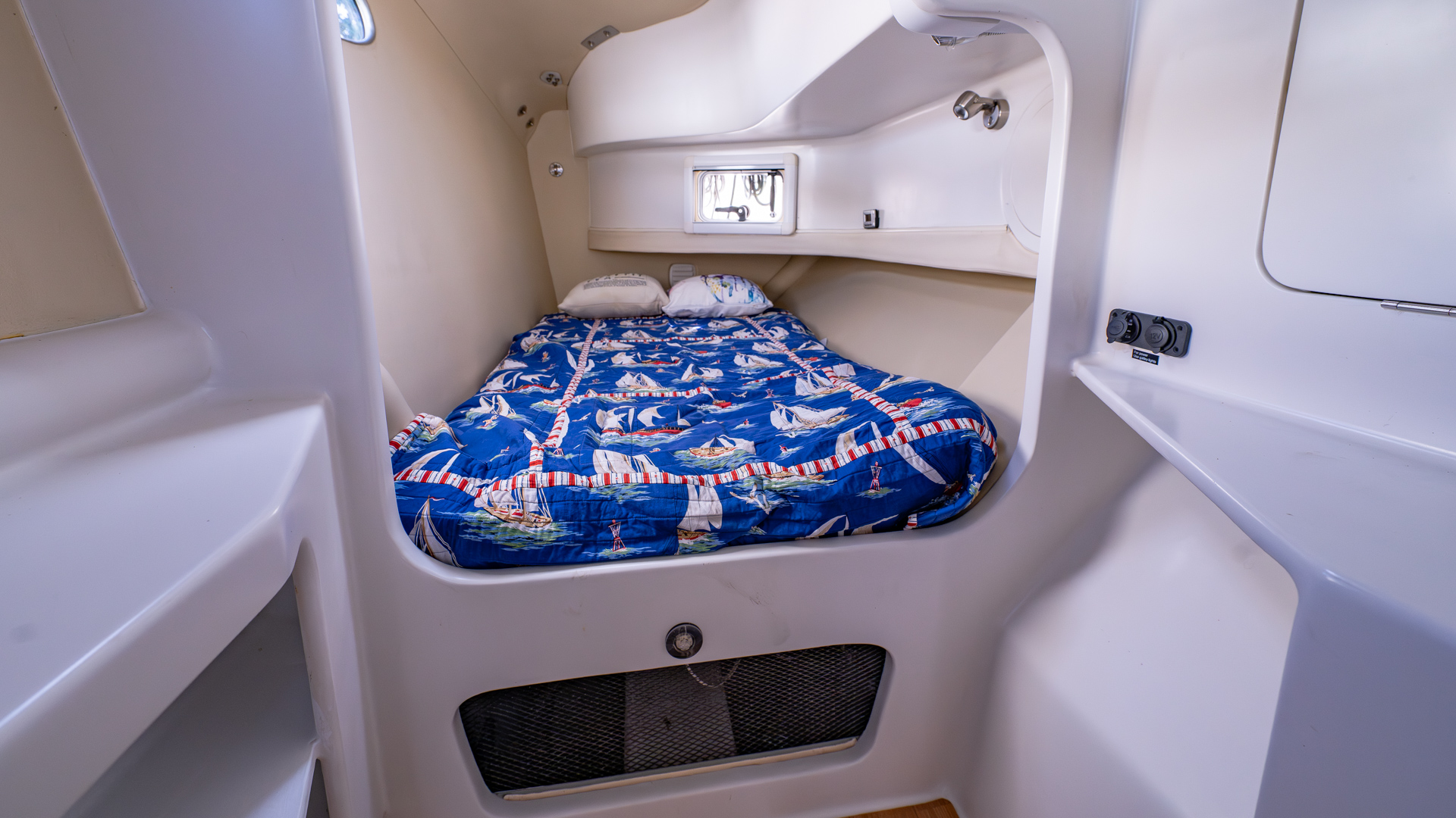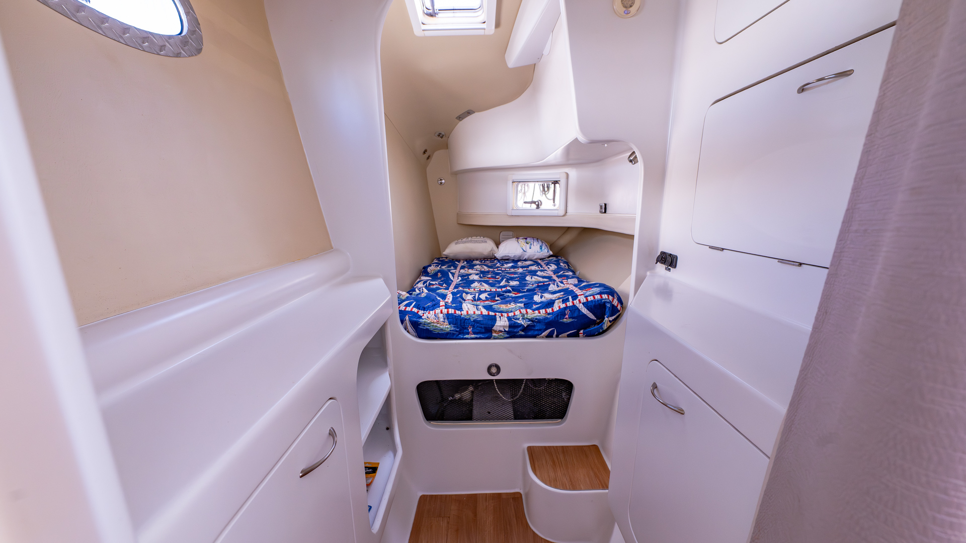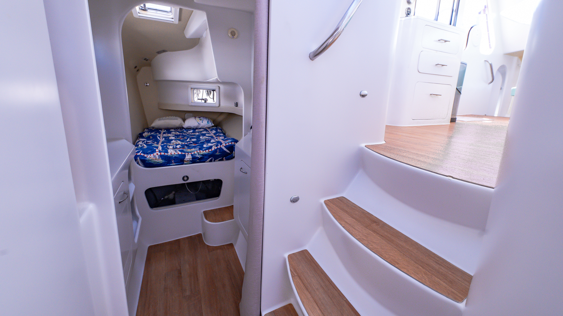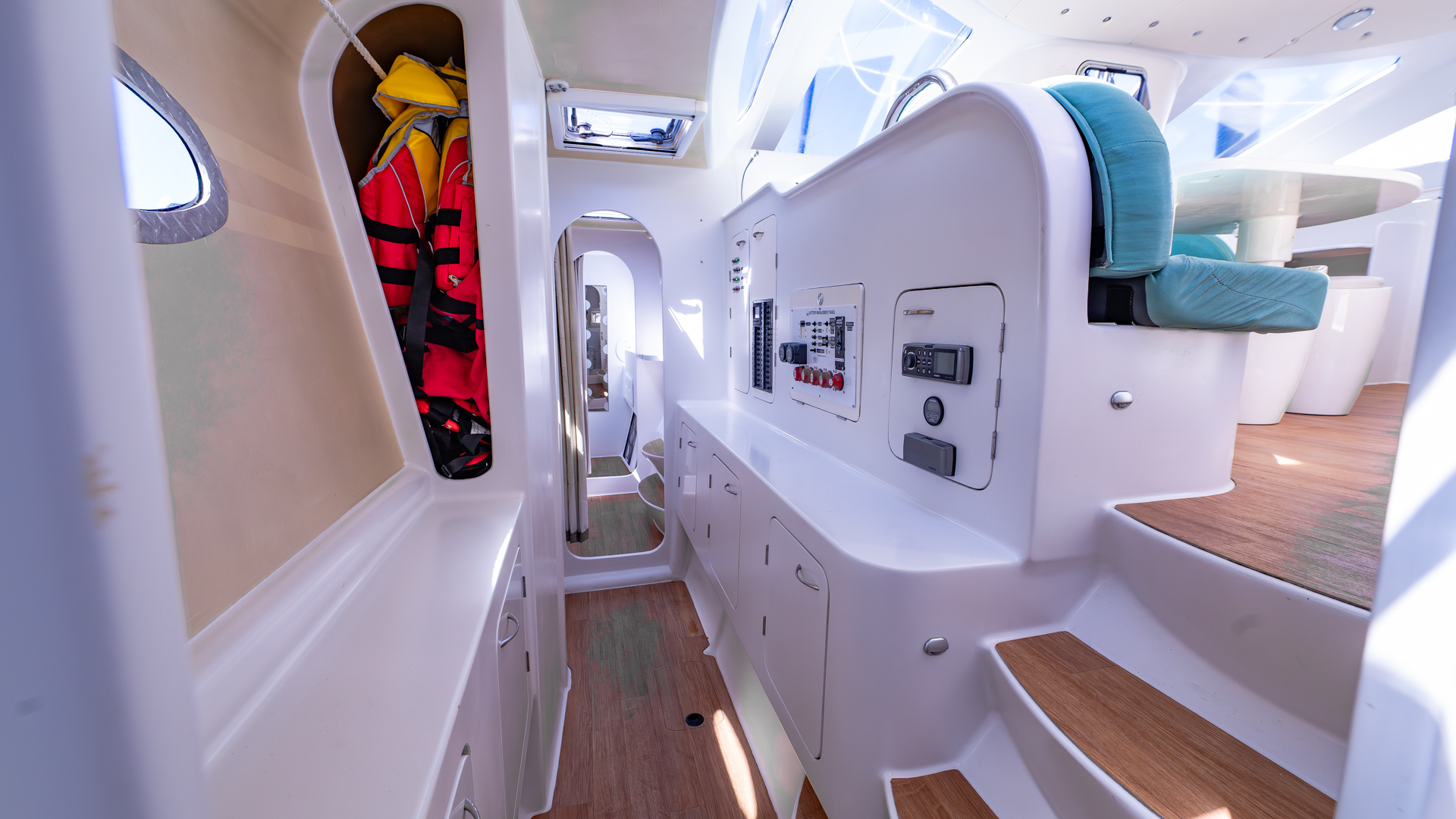Her sail inventory is a standout feature, highlighted by a near-new (2024) full-roach, fully battened Contender carbon/Kevlar laminate mainsail, complemented by a genoa and tri-axial screecher with spinnaker. The rig includes an aluminium mast, stainless standing rigging, Selden furling systems and Andersen winches, with a new boom bag fitted in 2024.