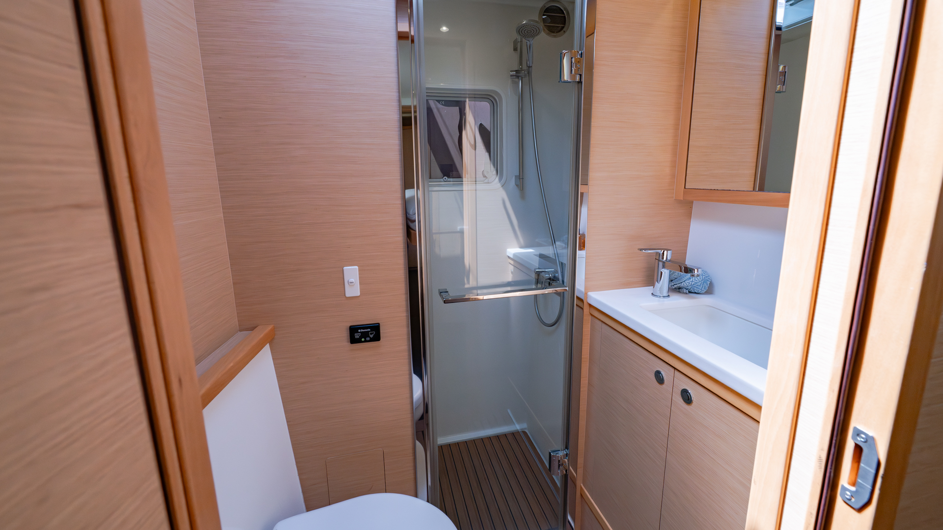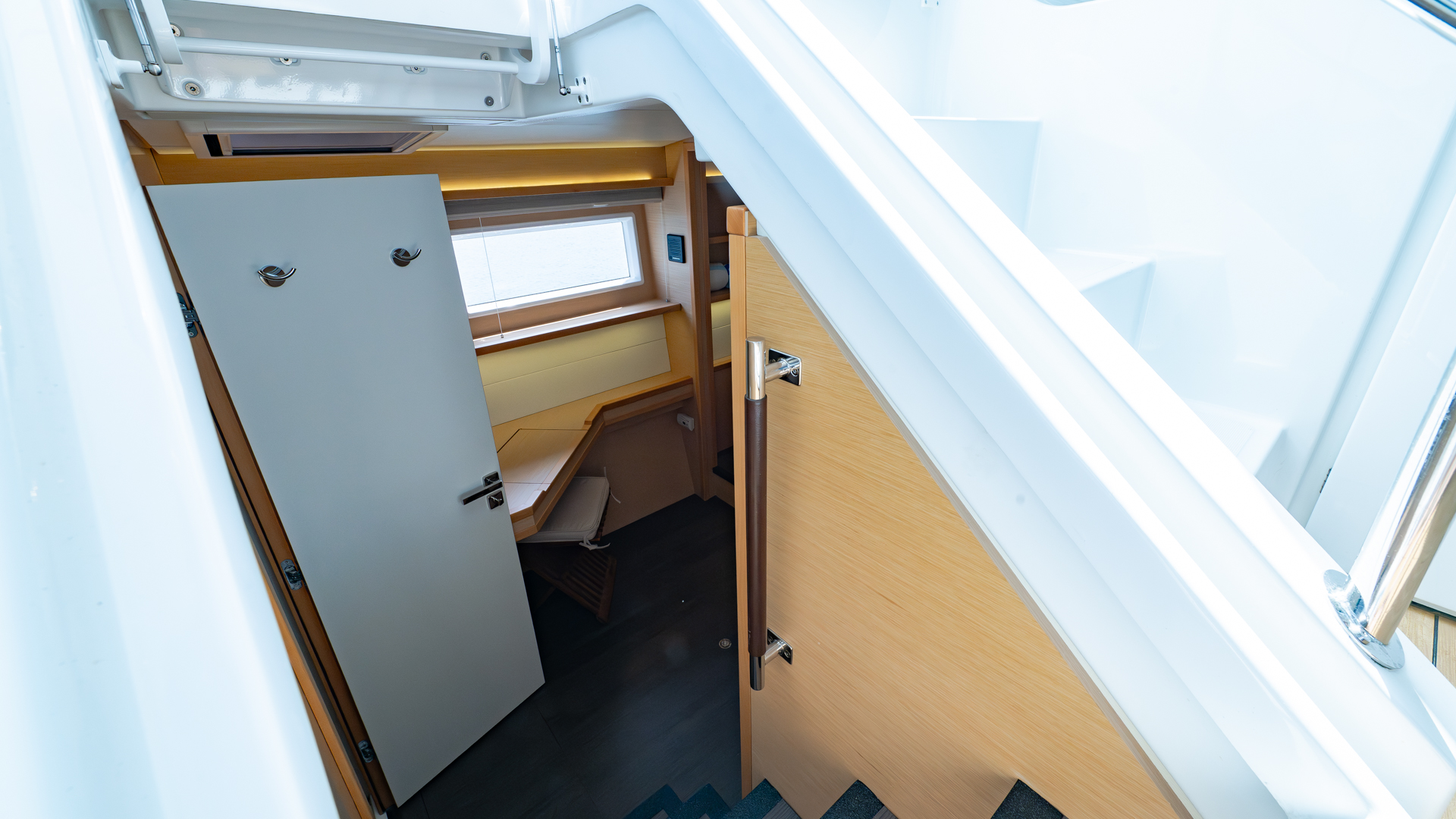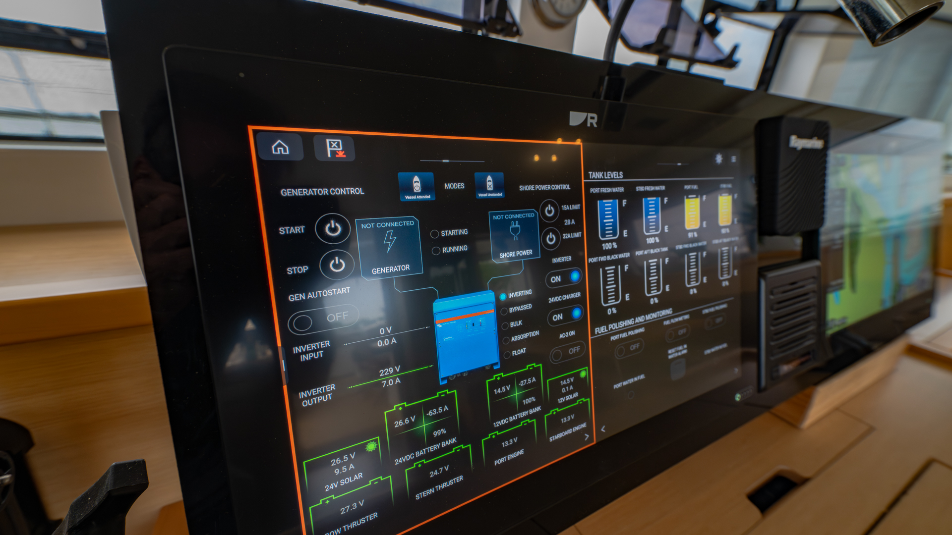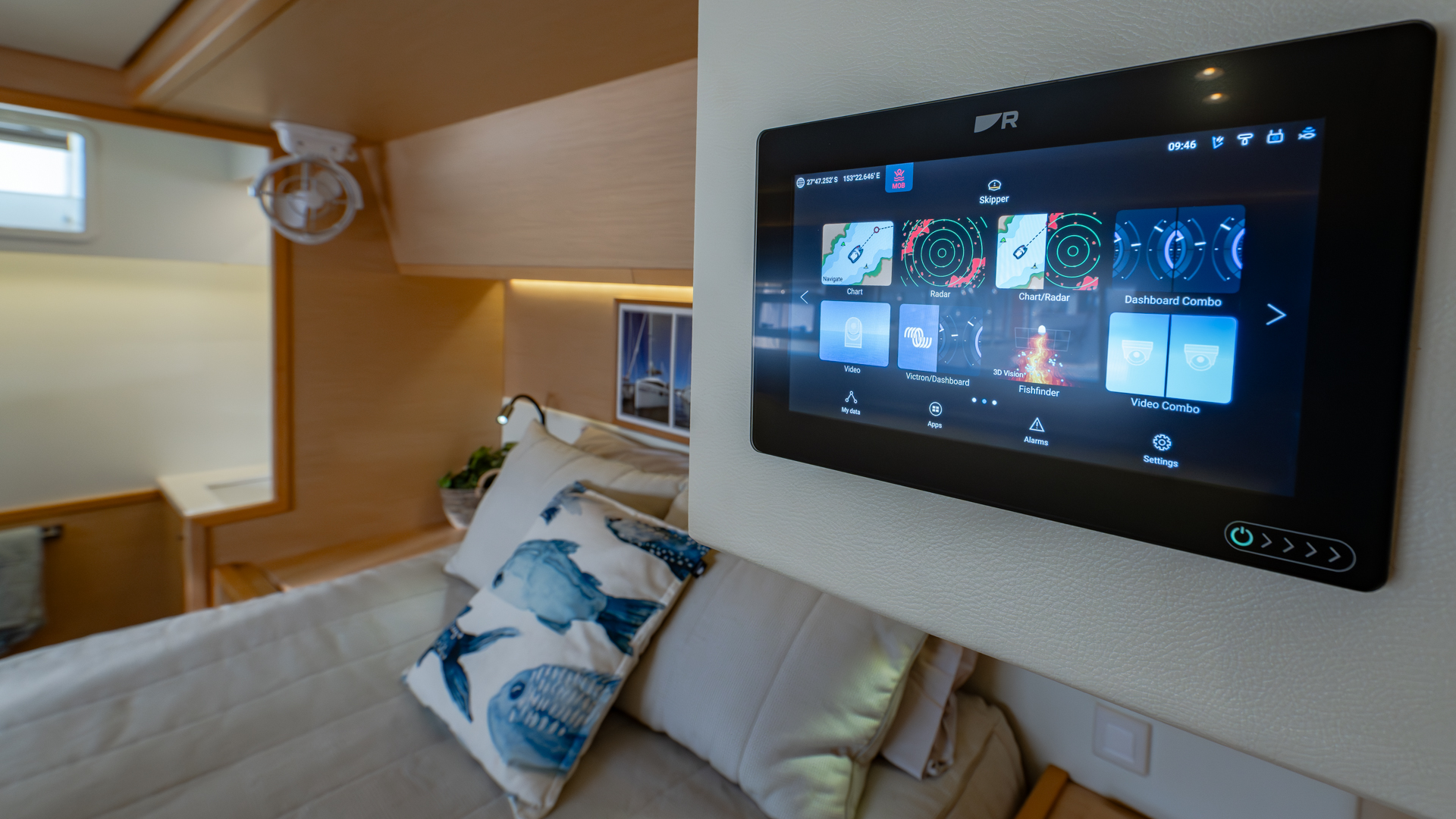 Ease of handling is assured with electric winches, an electric genoa and Code 0 furler, and a boom furler that allows mainsail operation at the touch of a button. Energy efficiency and autonomy are well catered for with 2.15kW of solar power, lithium house batteries for both 12V and 24V systems, and an Onan 17.5kW generator.