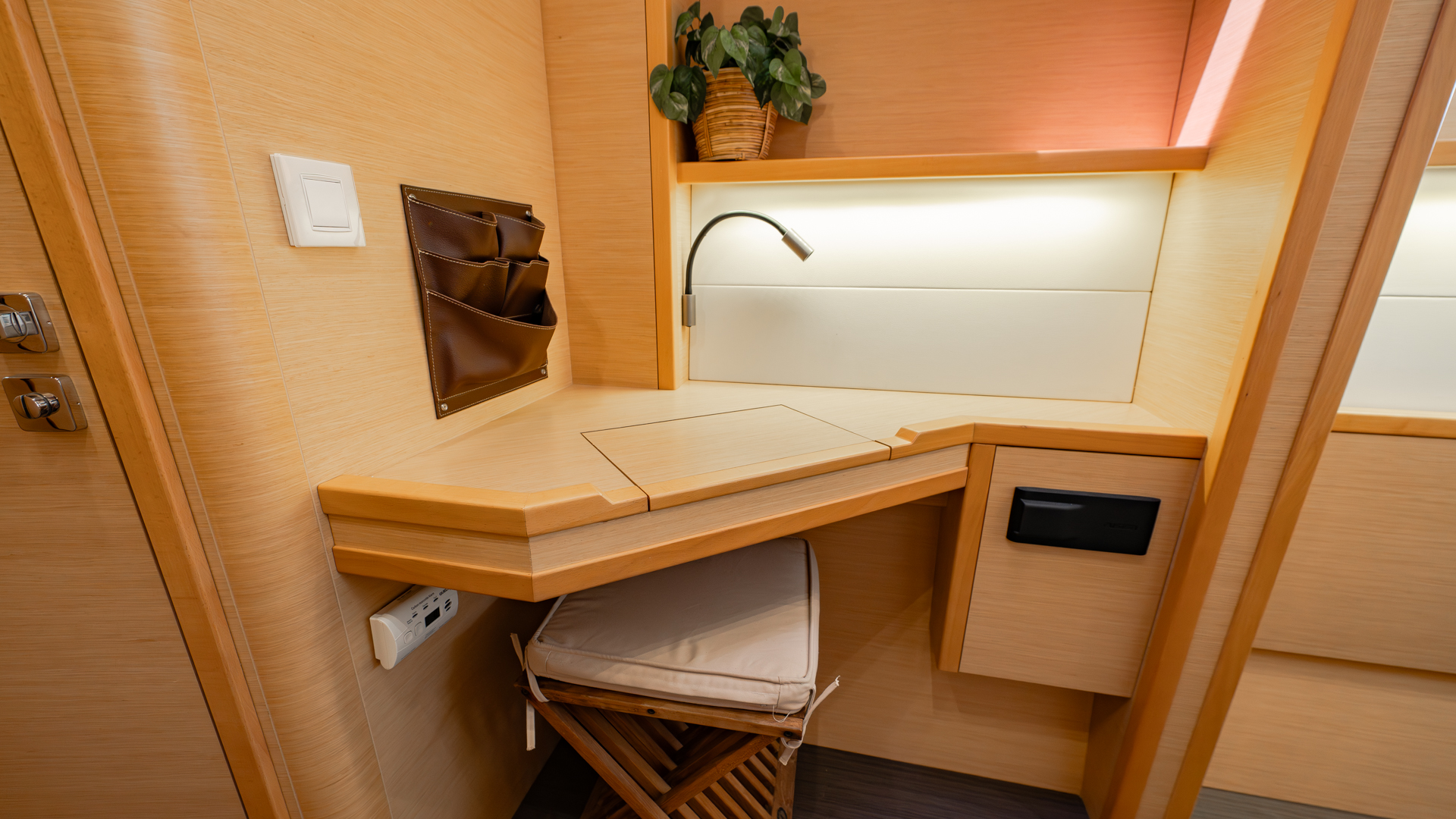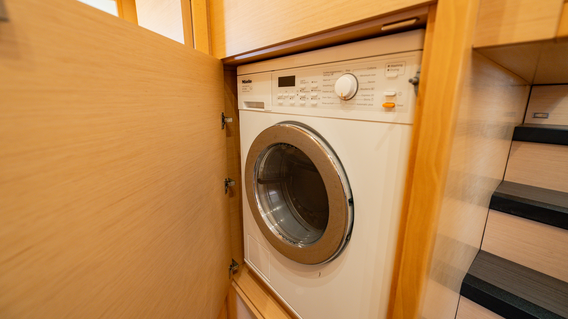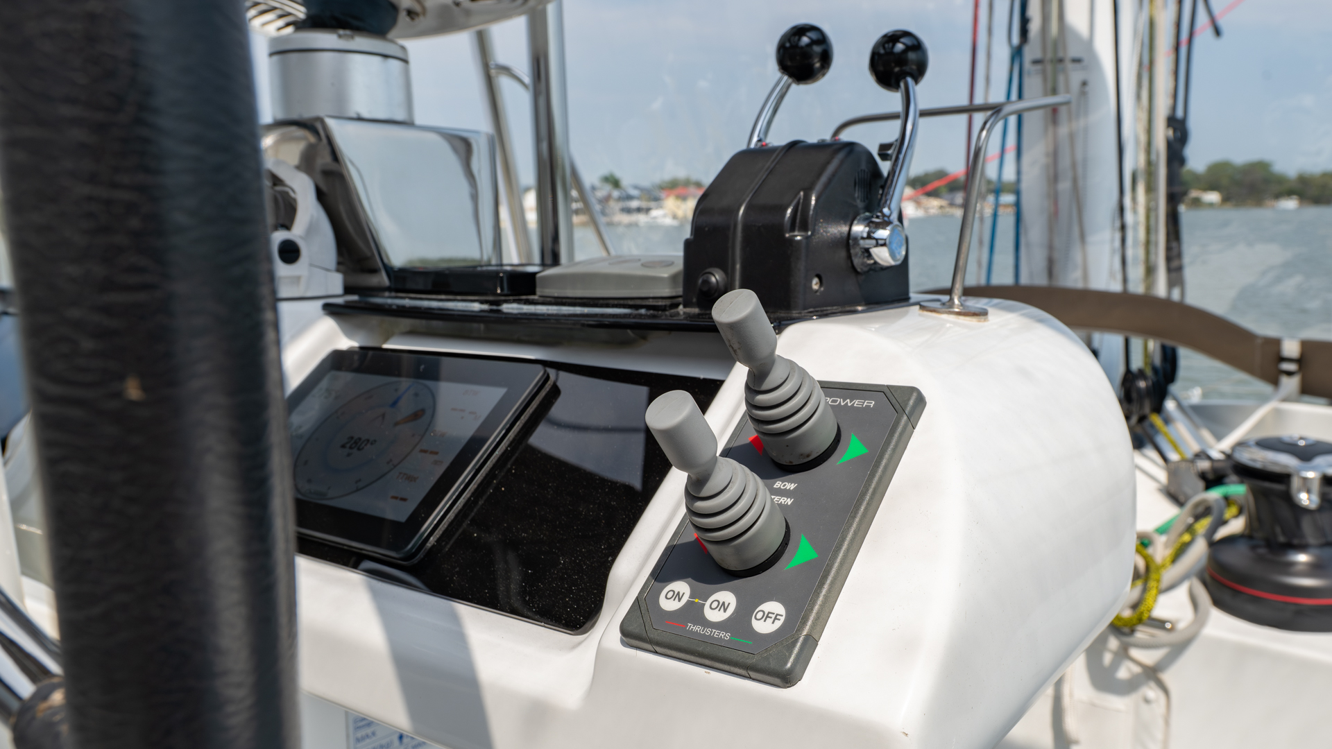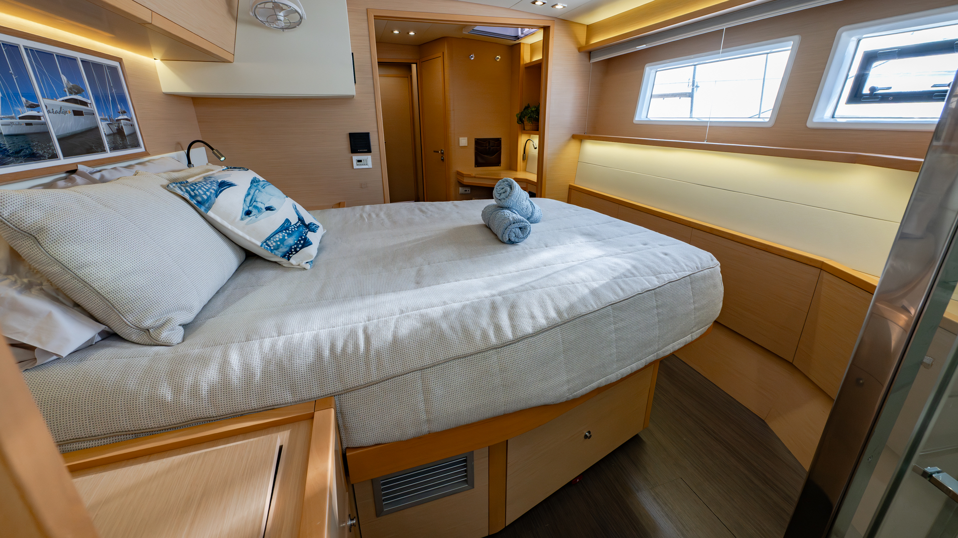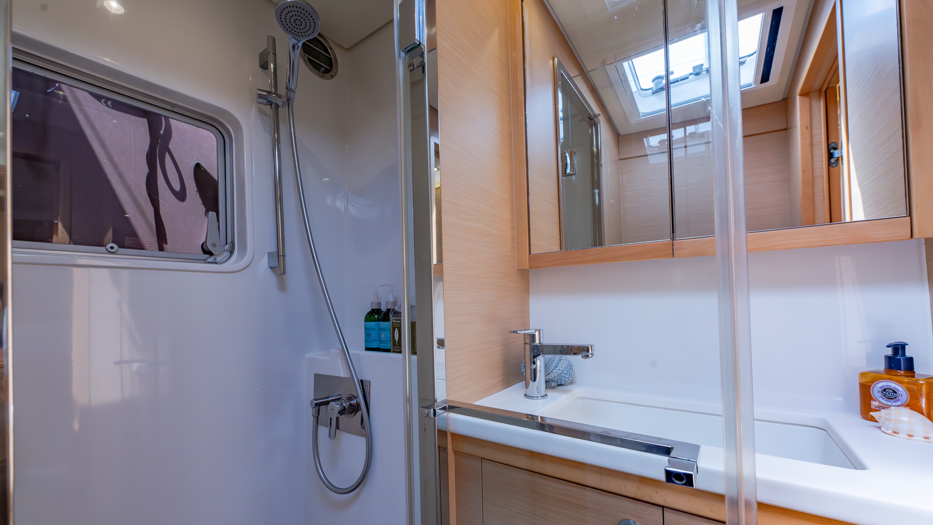 Ease of handling is assured with electric winches, an electric genoa and Code 0 furler, and a boom furler that allows mainsail operation at the touch of a button. Energy efficiency and autonomy are well catered for with 2.15kW of solar power, lithium house batteries for both 12V and 24V systems, and an Onan 17.5kW generator.