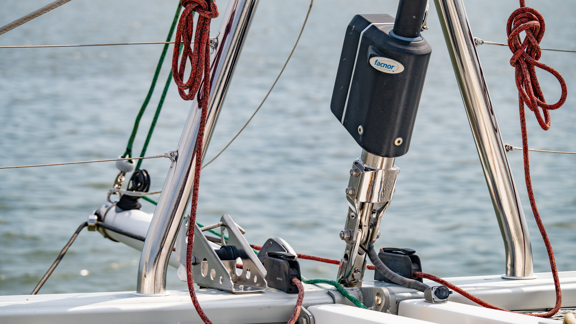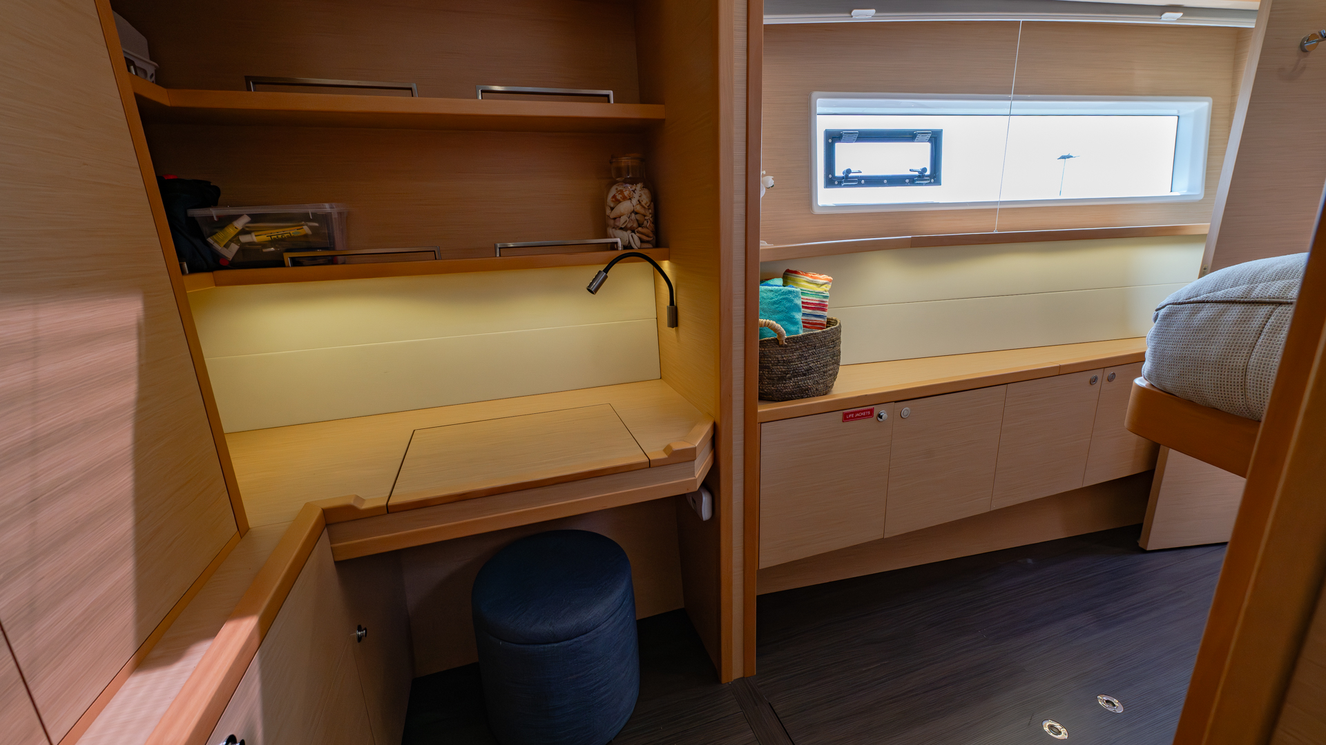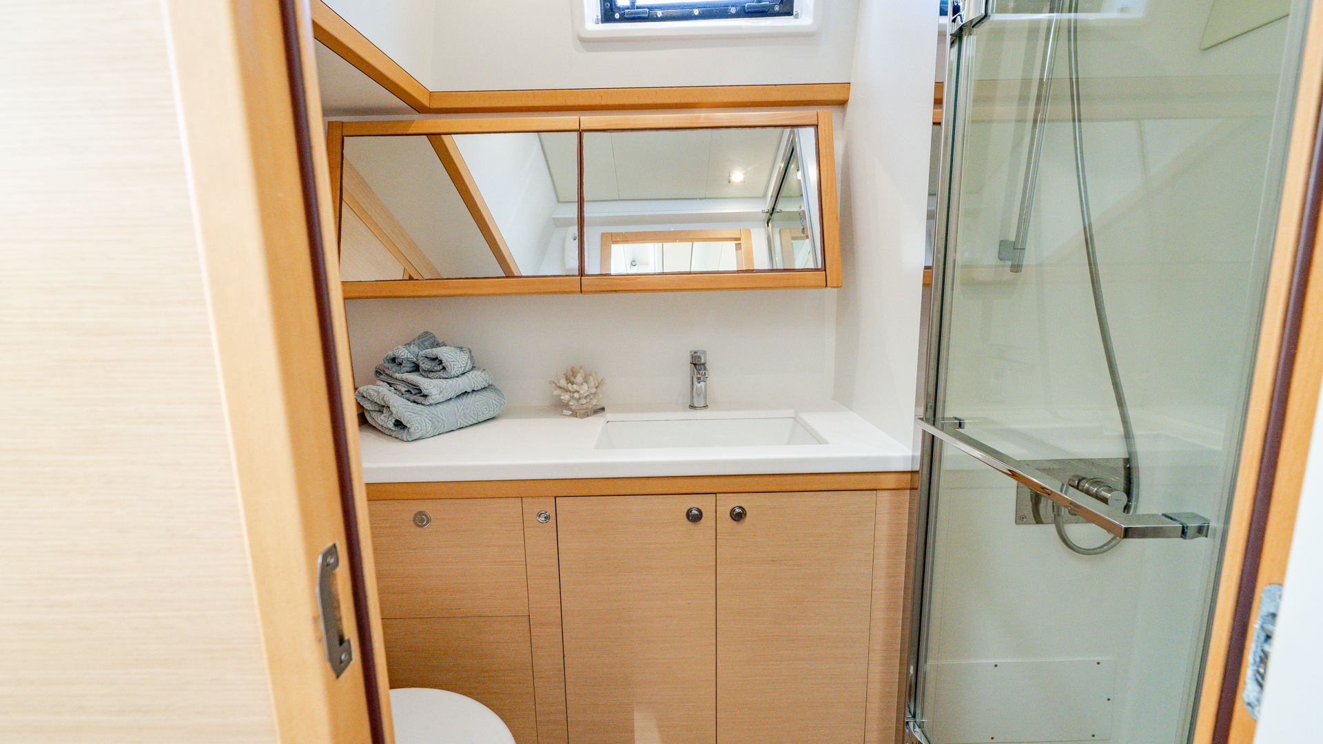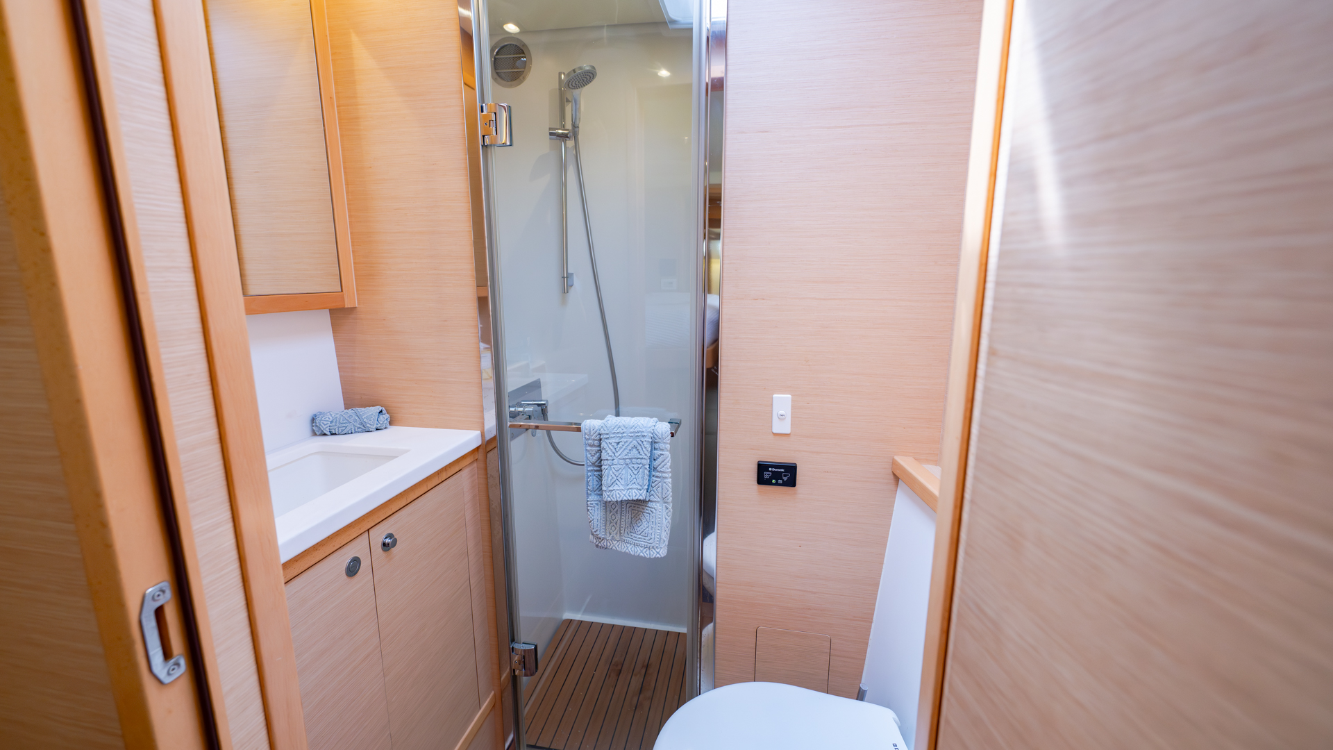 Ease of handling is assured with electric winches, an electric genoa and Code 0 furler, and a boom furler that allows mainsail operation at the touch of a button. Energy efficiency and autonomy are well catered for with 2.15kW of solar power, lithium house batteries for both 12V and 24V systems, and an Onan 17.5kW generator.