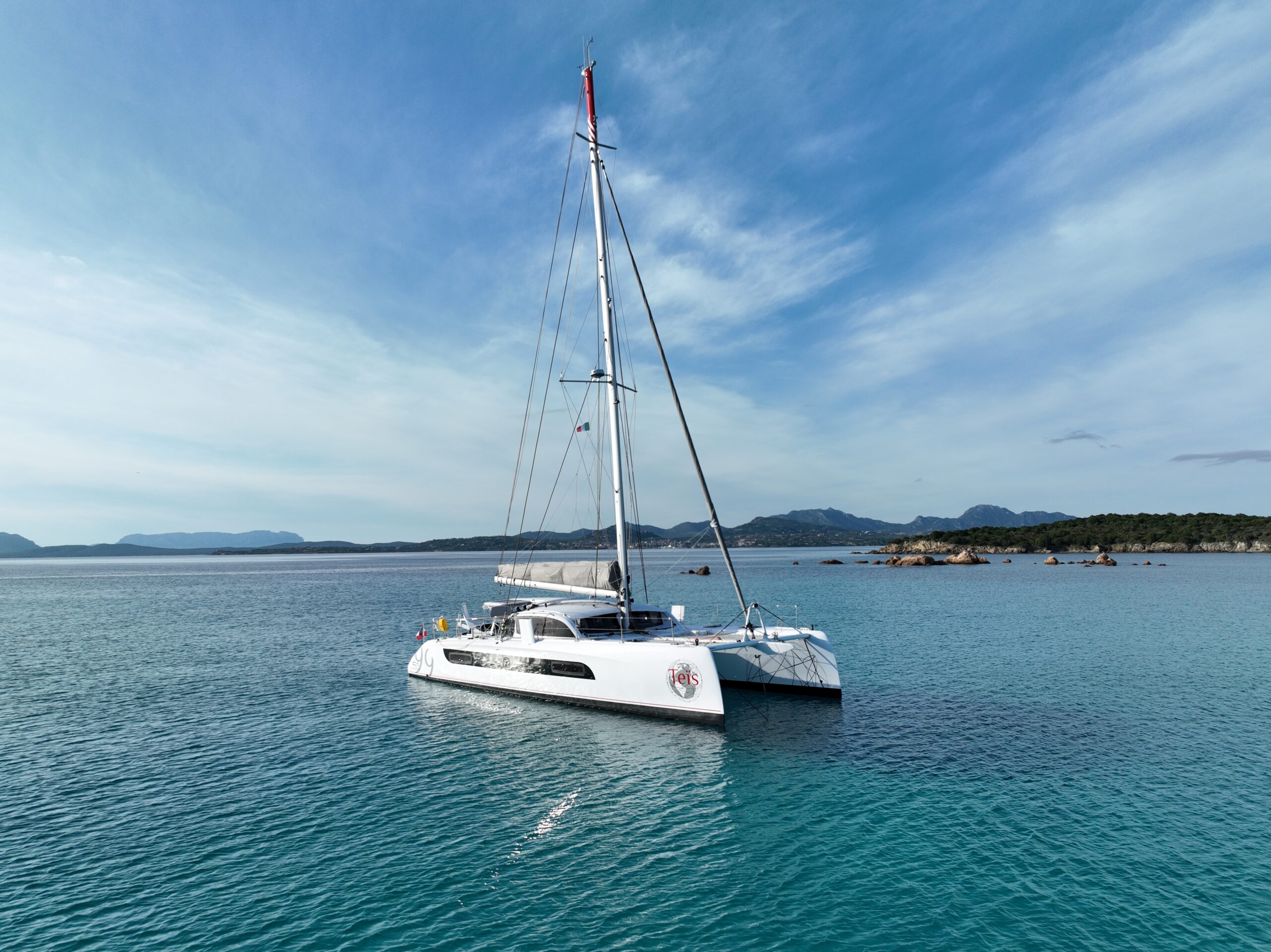 Teïs is the result of a carefully conceived owner’s project, created with a clear vision of safe, efficient blue-water cruising and a refined lifestyle at sea. Faced with the broad market of production and semi-custom yachts, her owners defined a precise brief centred on four core principles: light displacement with reassuring offshore performance, a sociable and welcoming layout for crew and guests, ease of handling and maintenance for a small crew, and an elegant, timeless design.