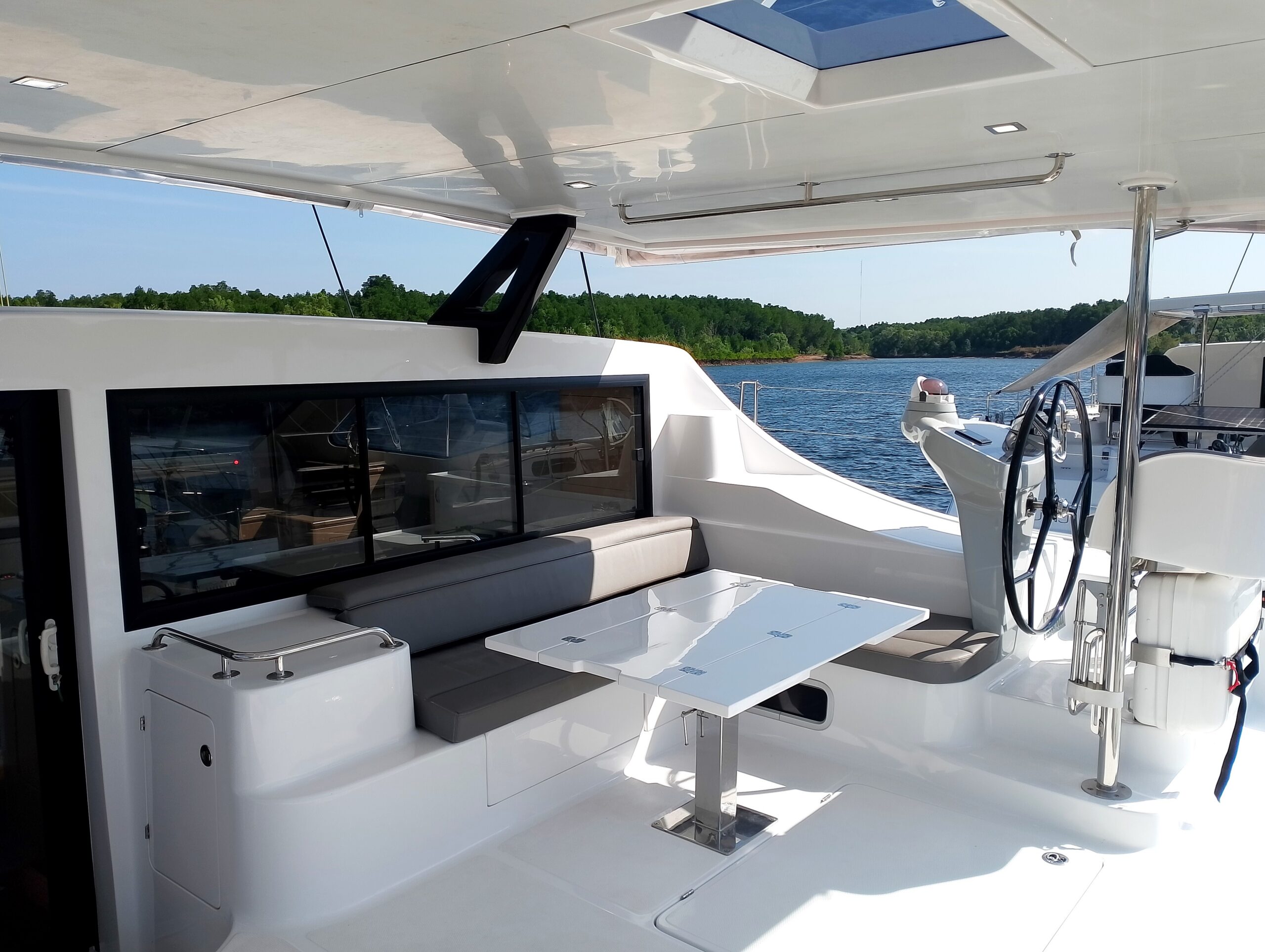 The interior showcases Seawind’s commitment to quality craftsmanship, with lightweight foam-cored construction, light oak finishes and modern walnut flooring that create a bright, contemporary feel. Indoor and outdoor living flow seamlessly, thanks to a large sliding saloon door and window that open to an expansive cockpit with seating for eight and a large dining table under a sturdy hardtop bimini.