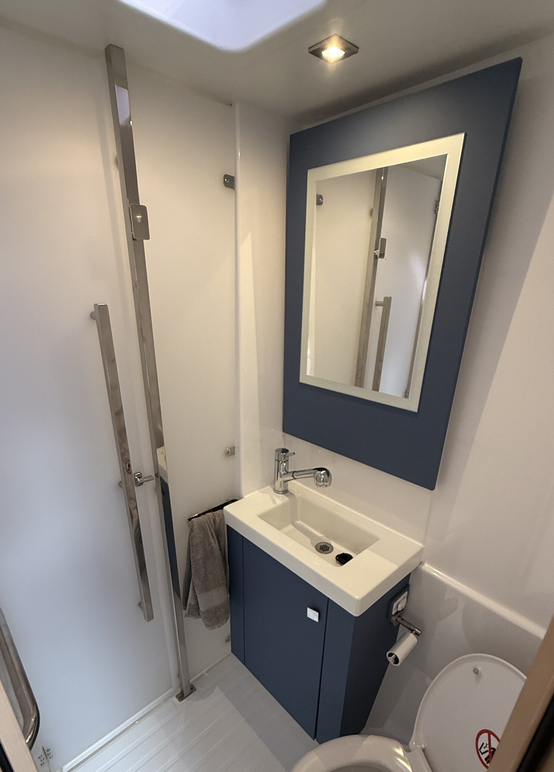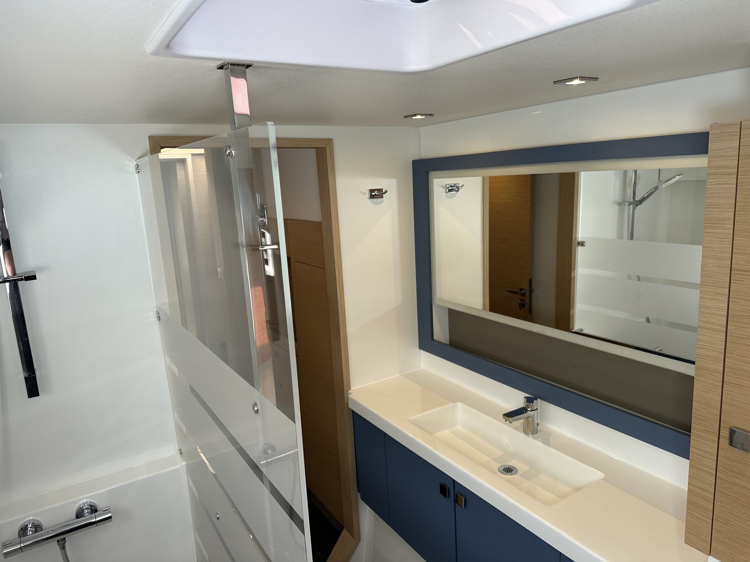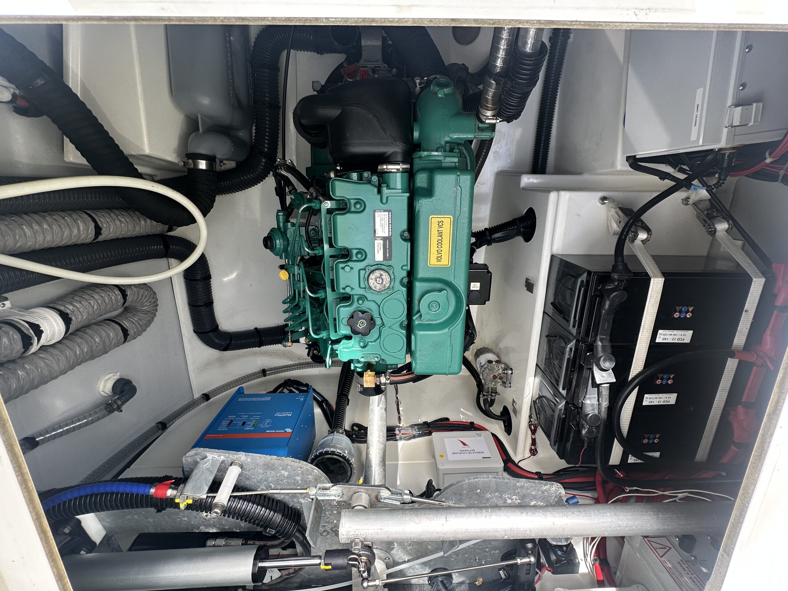 Interior enhancements include extra towel rails and holders, a cupboard above the starboard stairs, and an additional electric freshwater pump. Hot water capacity is 80 L, and the holding tank holds 200 L.