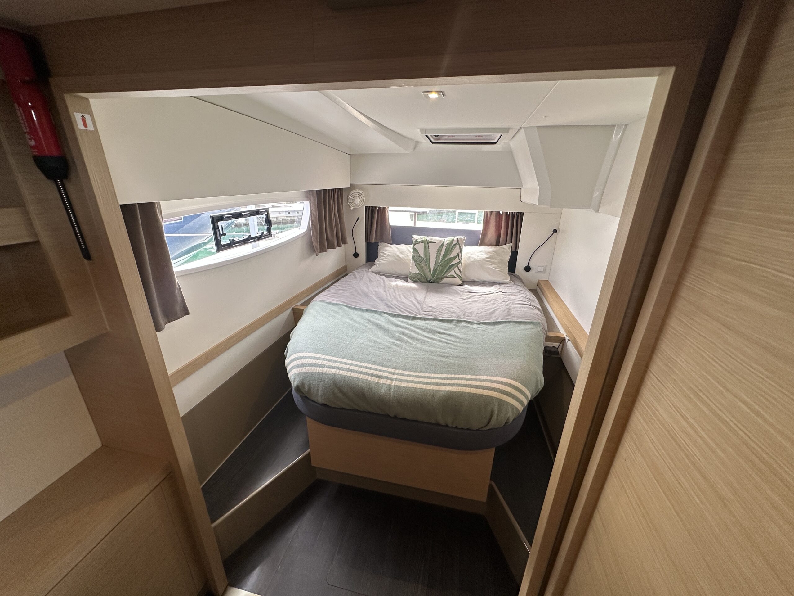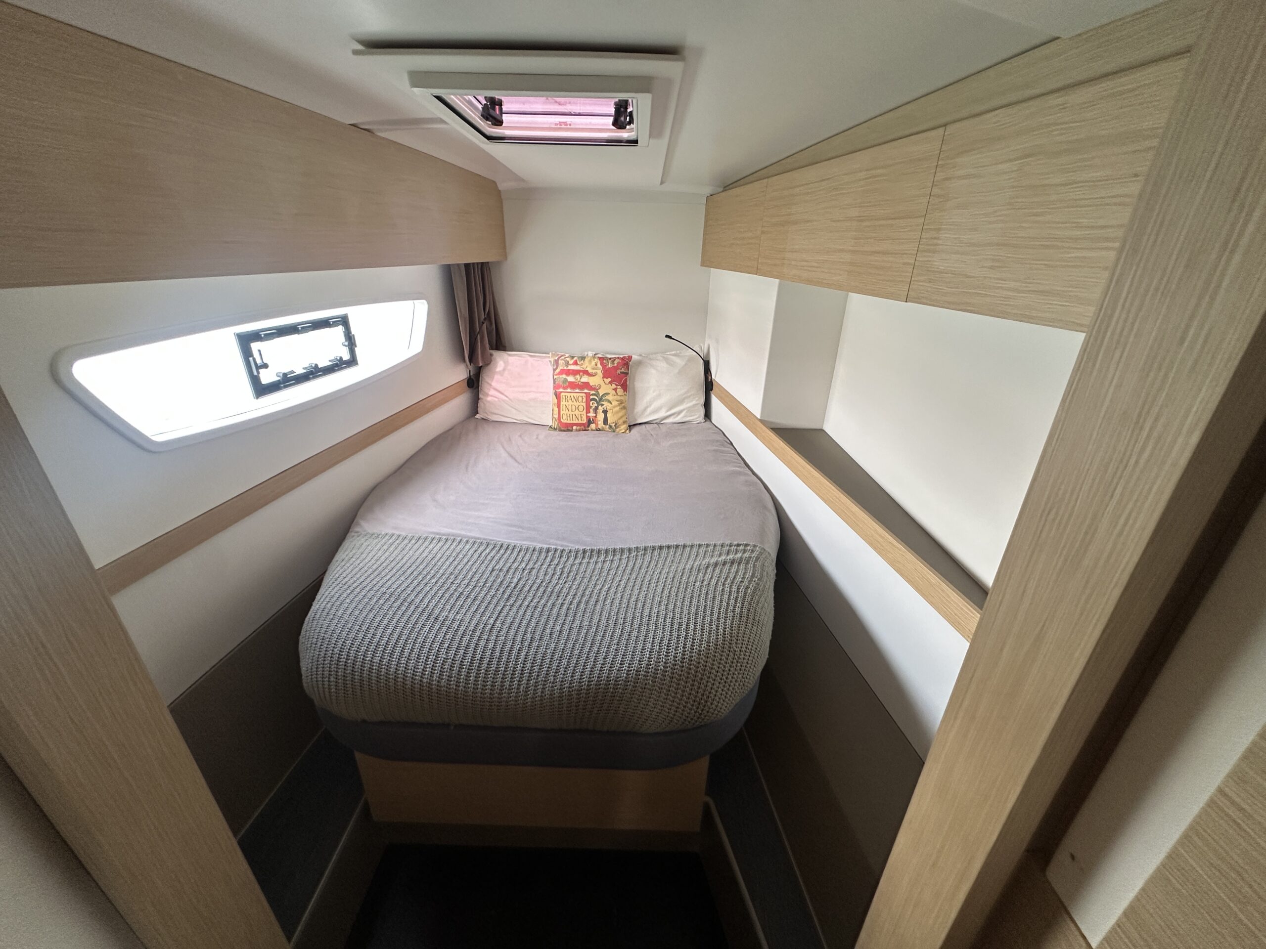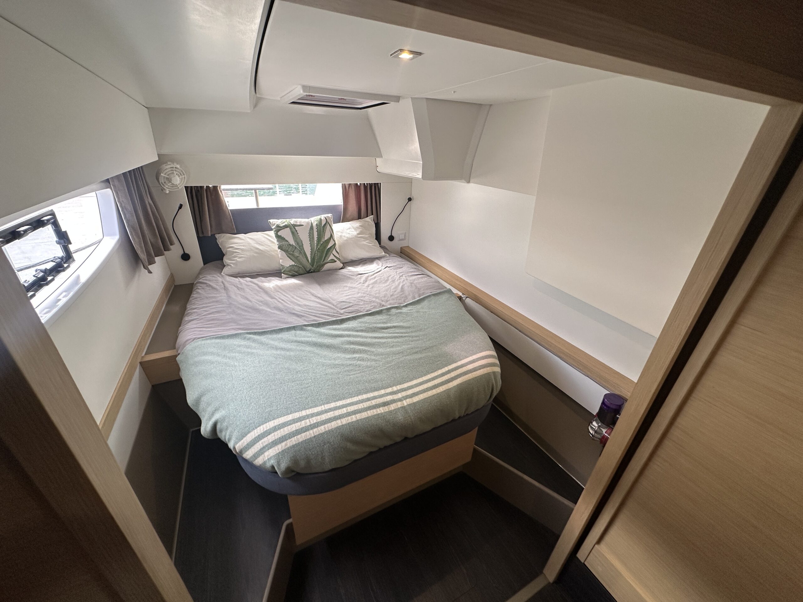 The three-cabin Maestro layout includes three queen berths, electric freshwater heads (3), and two full showers plus a transom shower. The saloon table converts to an additional berth with a custom mattress. The master suite boasts walk-around slatted beds with storage beneath, a custom wardrobe shelf, and a wall-mounted Dyson vacuum. All cabins include 12V fans for comfort.