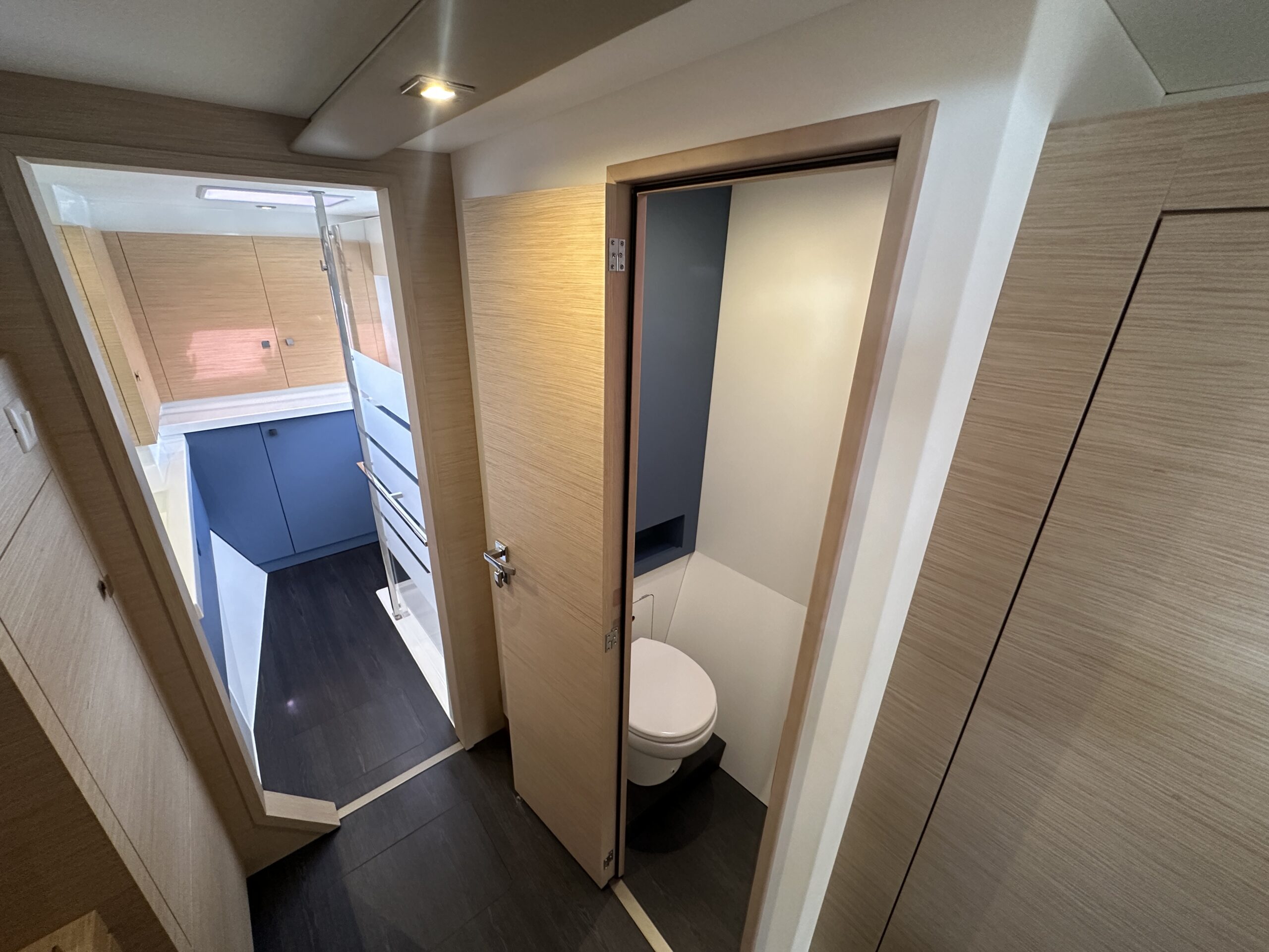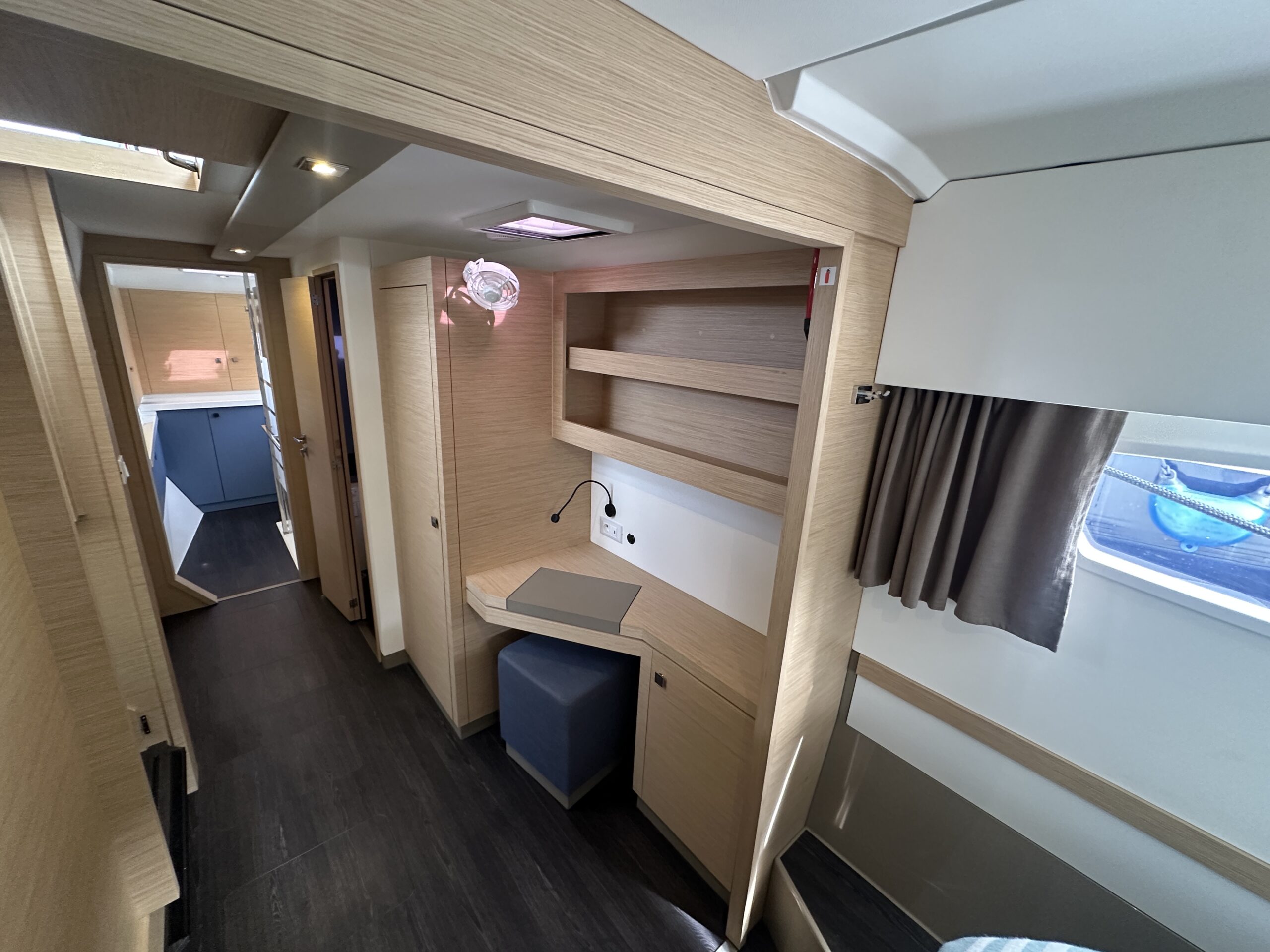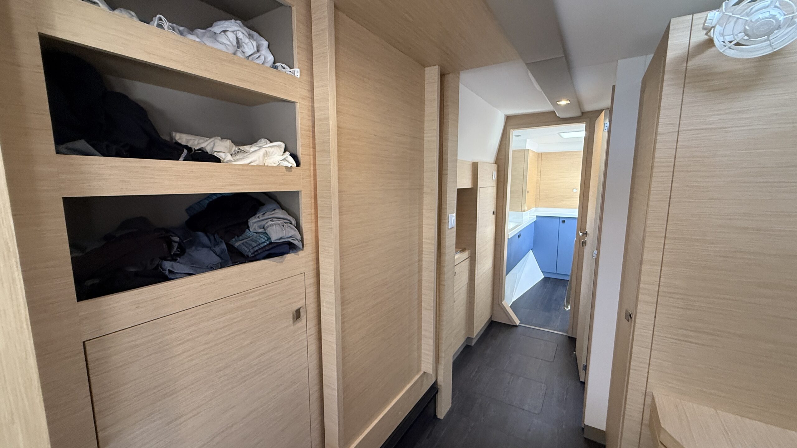 The three-cabin Maestro layout includes three queen berths, electric freshwater heads (3), and two full showers plus a transom shower. The saloon table converts to an additional berth with a custom mattress. The master suite boasts walk-around slatted beds with storage beneath, a custom wardrobe shelf, and a wall-mounted Dyson vacuum. All cabins include 12V fans for comfort.