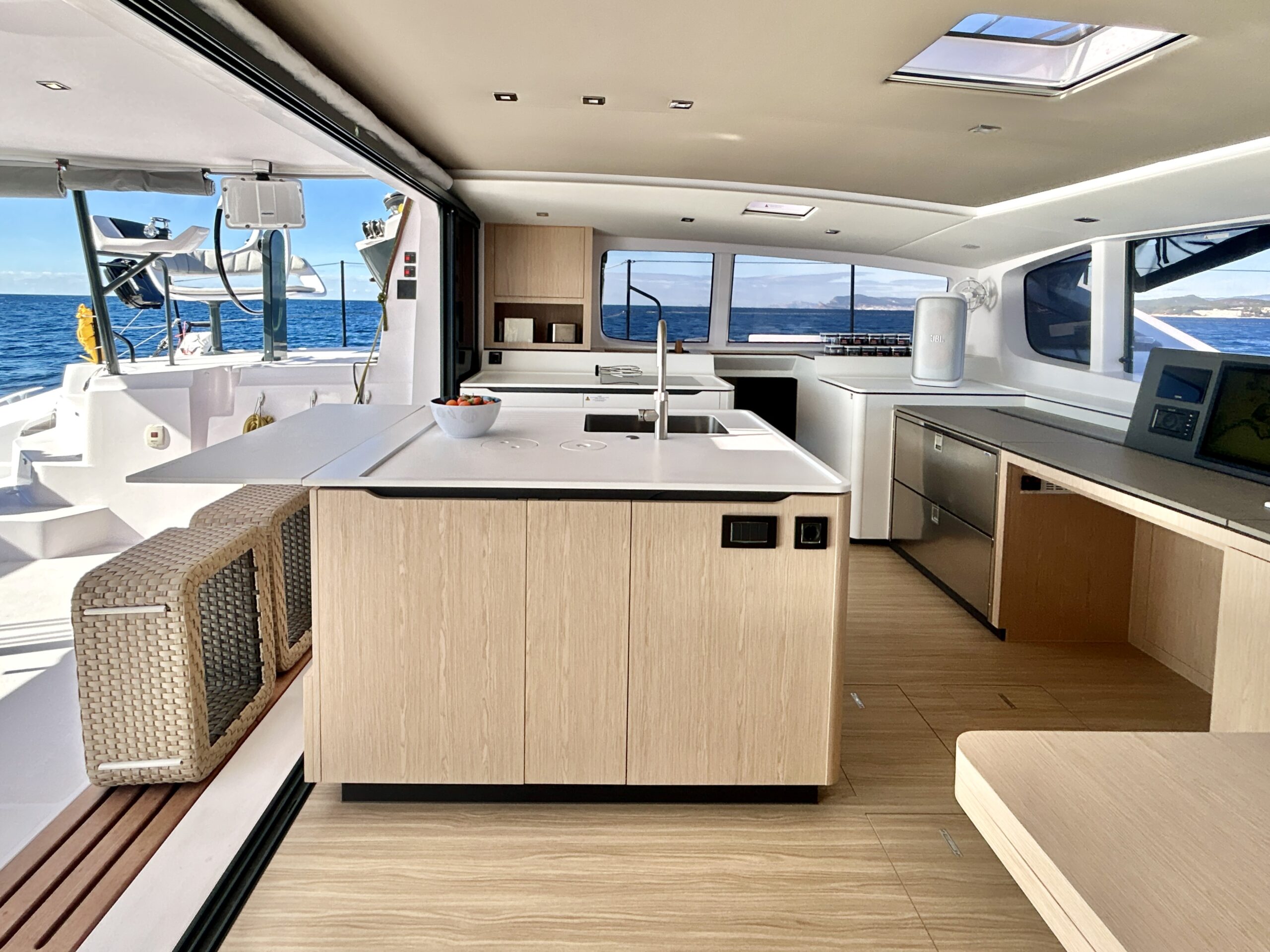 Key features include a carbon mast finished in white to reduce heat and protect onboard electronics, a comprehensive Hydranet sail wardrobe by Incidence, premium B&G navigation electronics and upgraded Nanni 65 hp engines. These specifications place Nade among the leading performance cruising catamarans currently available.