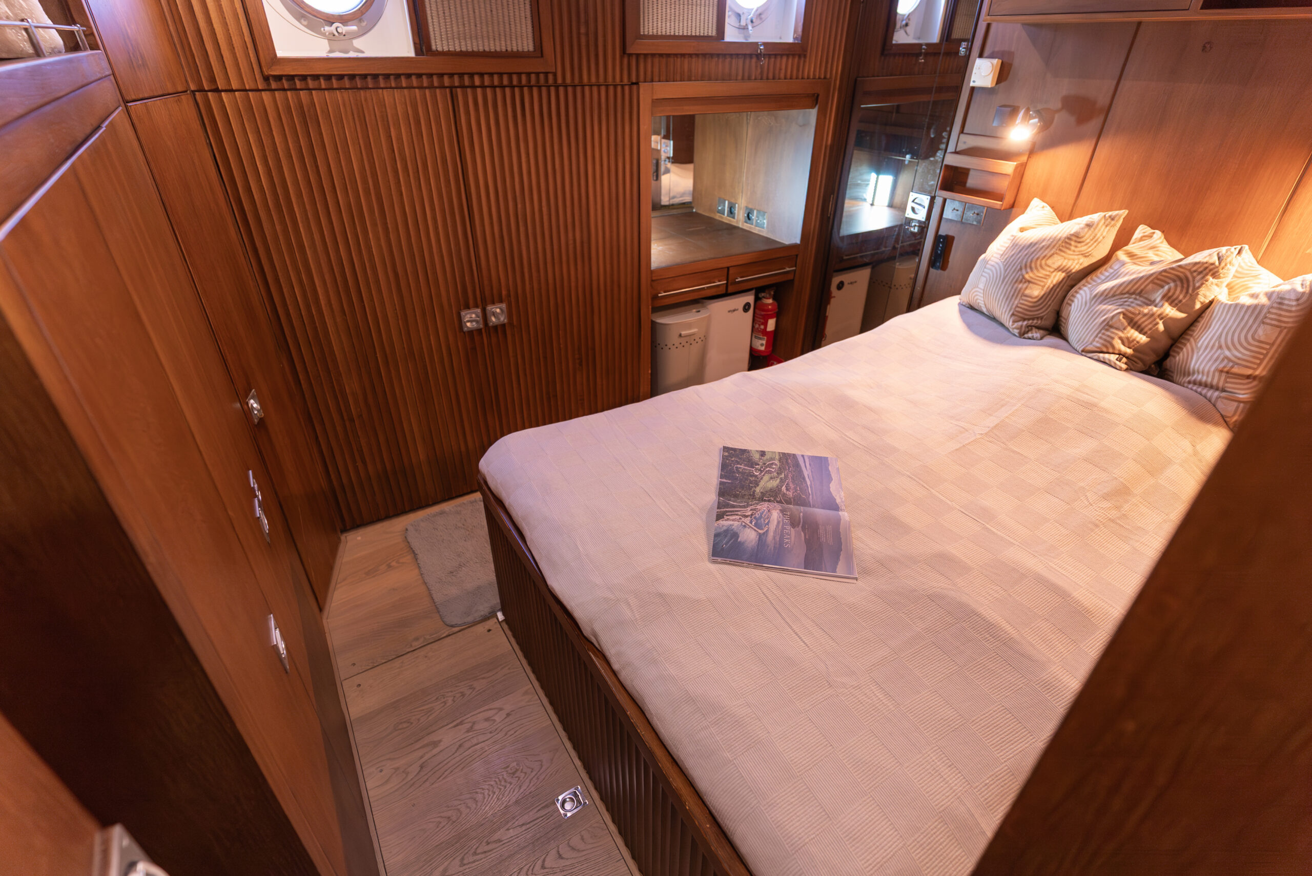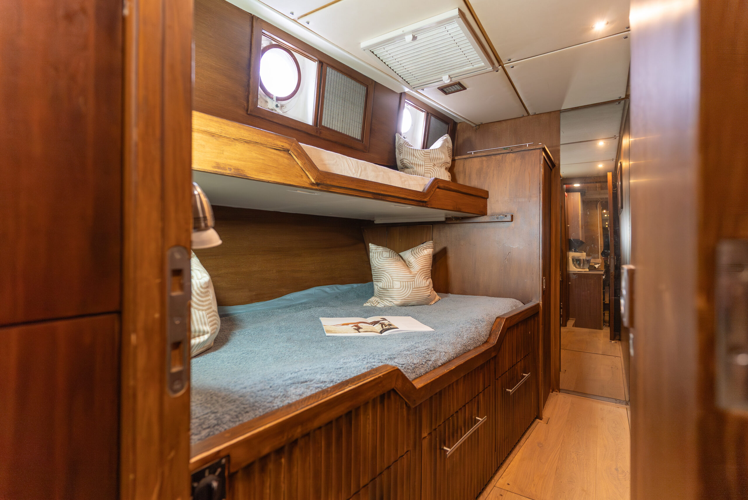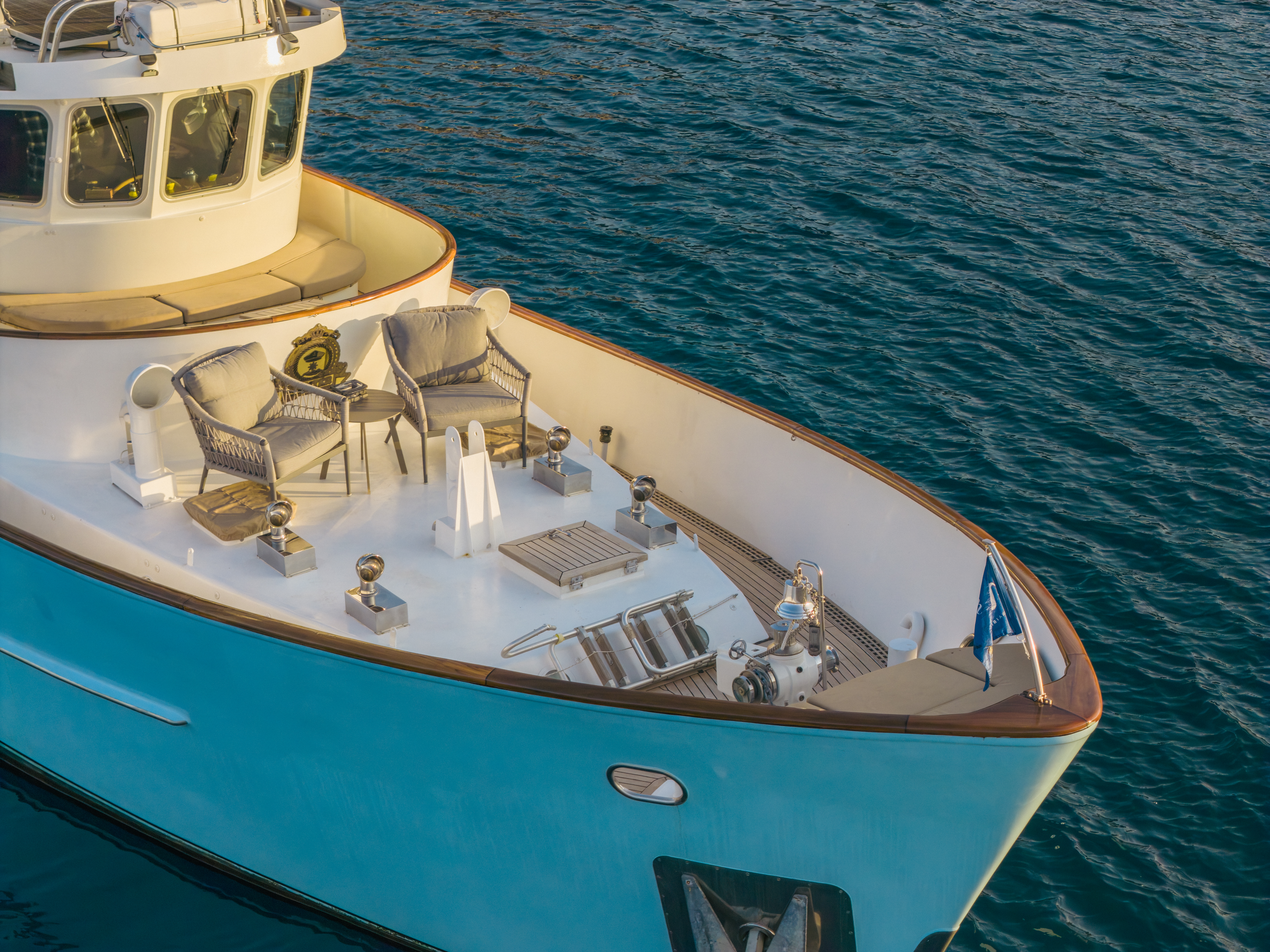 Purchased by her current owner in 2021, Hunter underwent a comprehensive rebuild and refit, including a total hull reinforcement and modernisation, completed between 2021 and 2023. She now presents a striking Baby Blue hull and is fully equipped for long-range cruising in comfort and style.