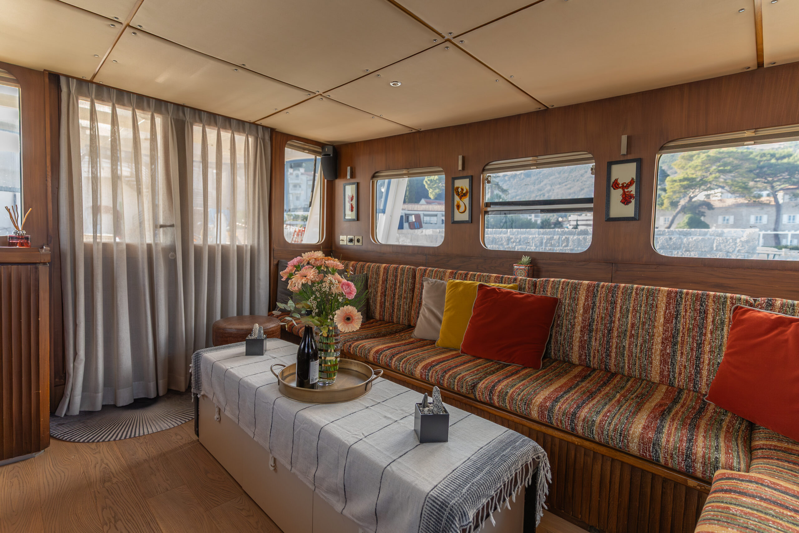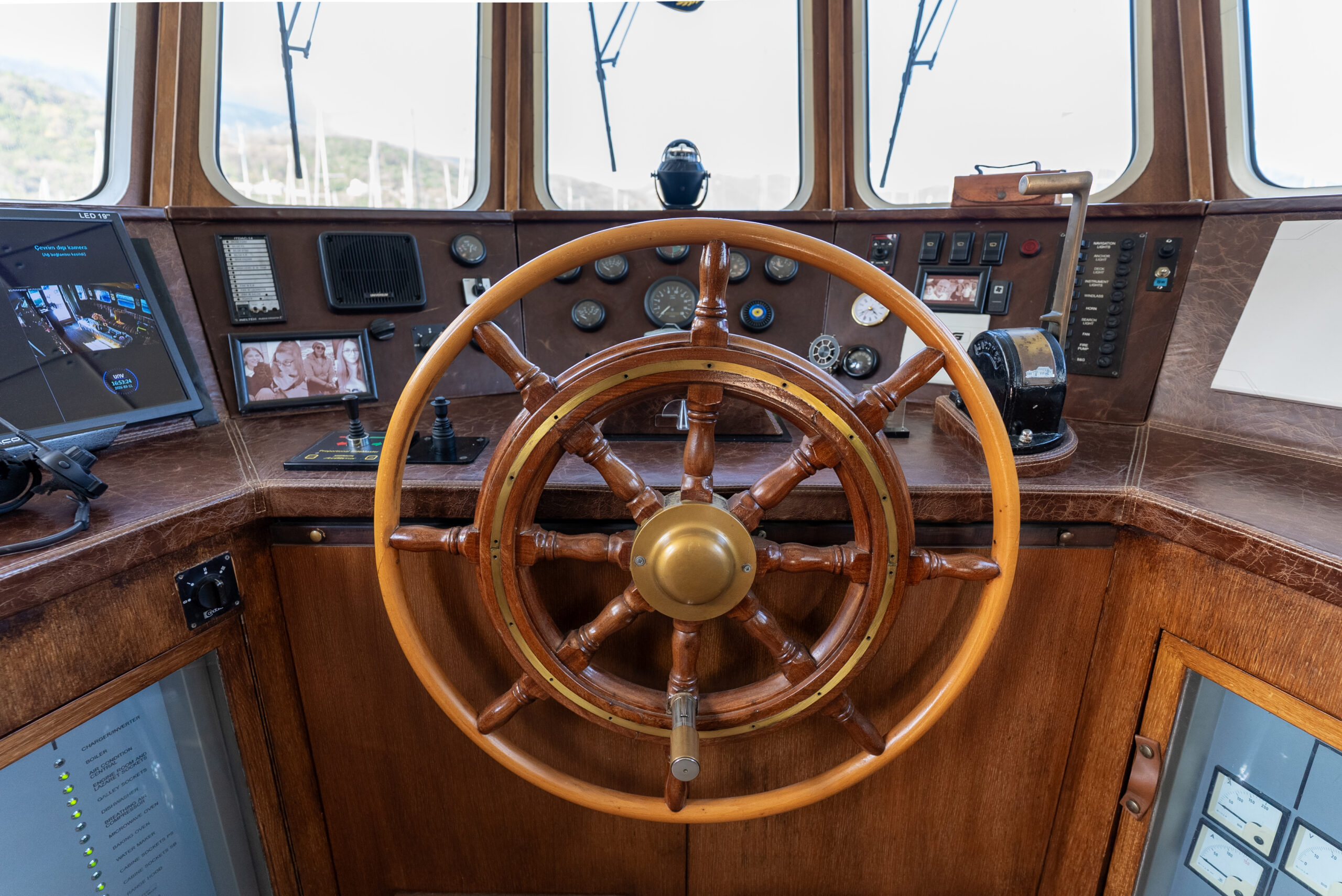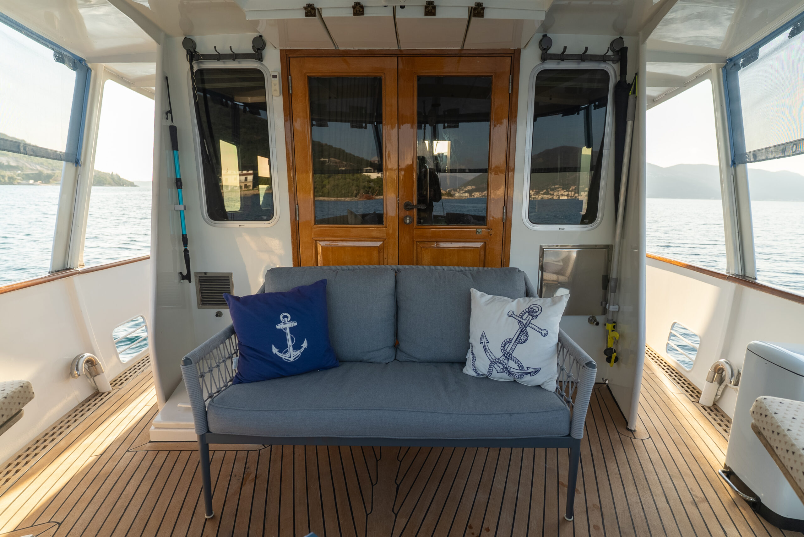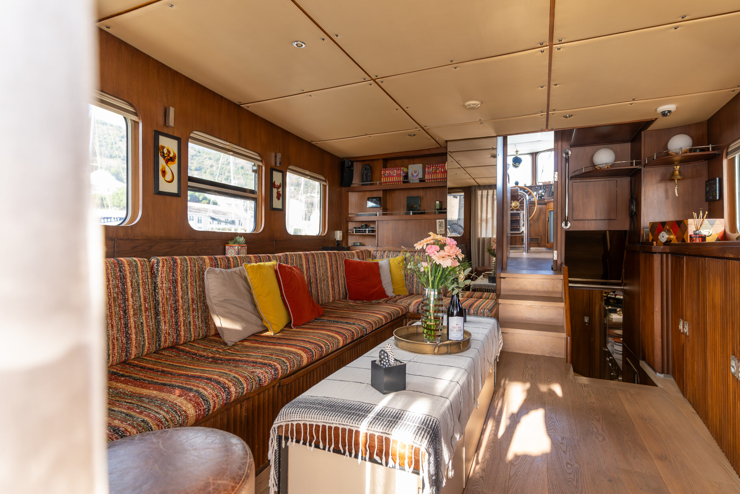 The interior has been modernised with new laminated floors, renewed showers and toilets converted to fresh water, upgraded air conditioning including the engine room, and a Bose five-zone sound system covering cockpit, bow, aft and indoor areas. Original teak decks are in top condition and all hatches, portholes and window frames have been refurbished.