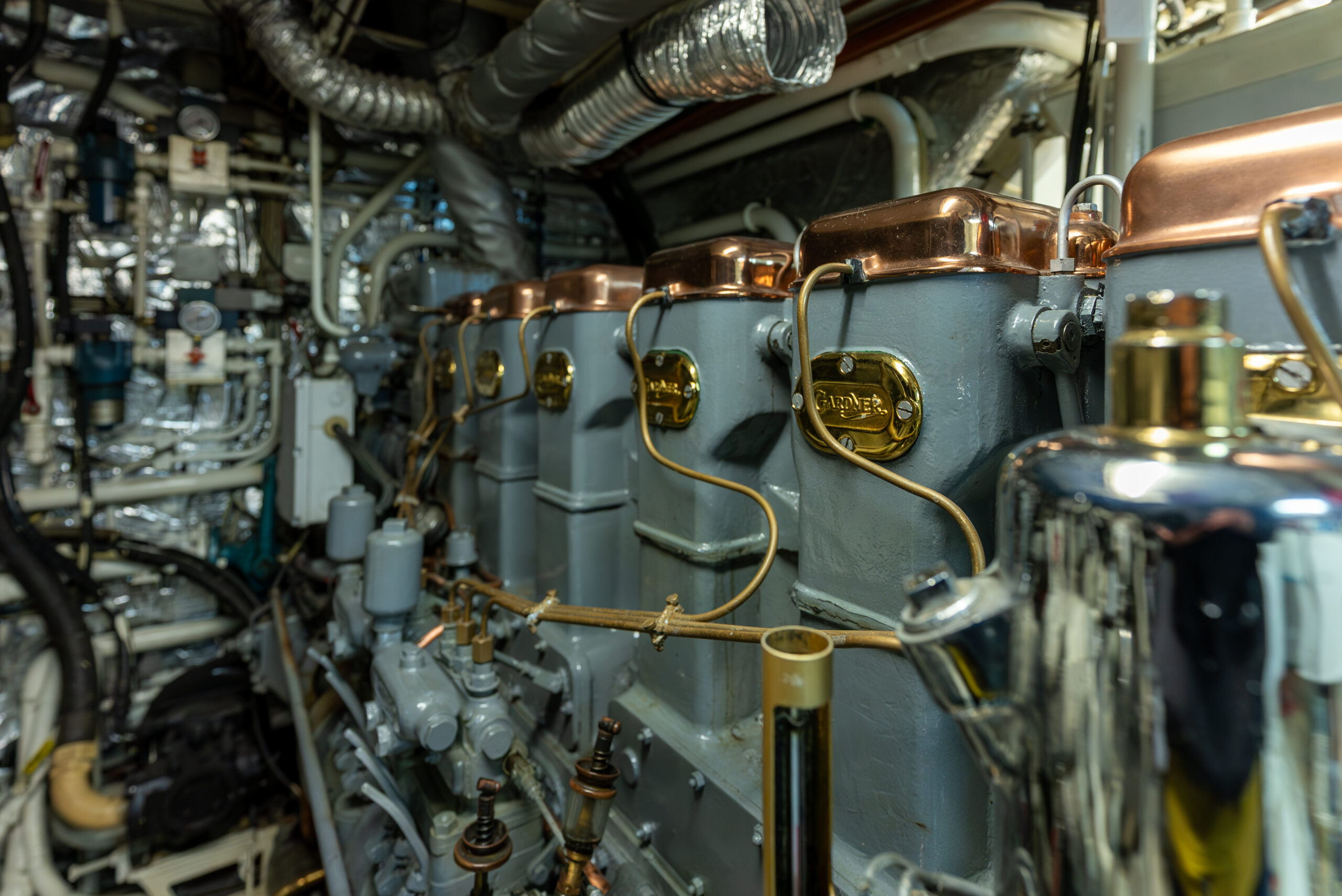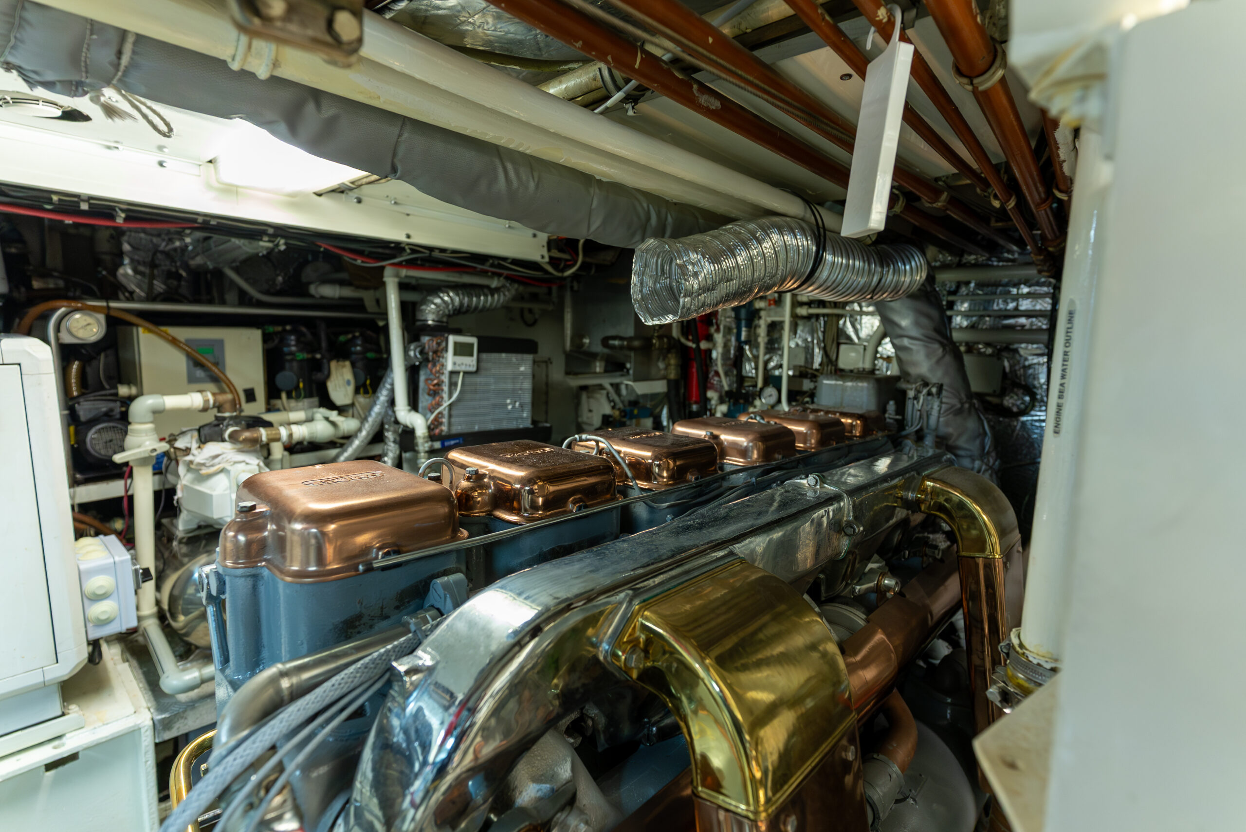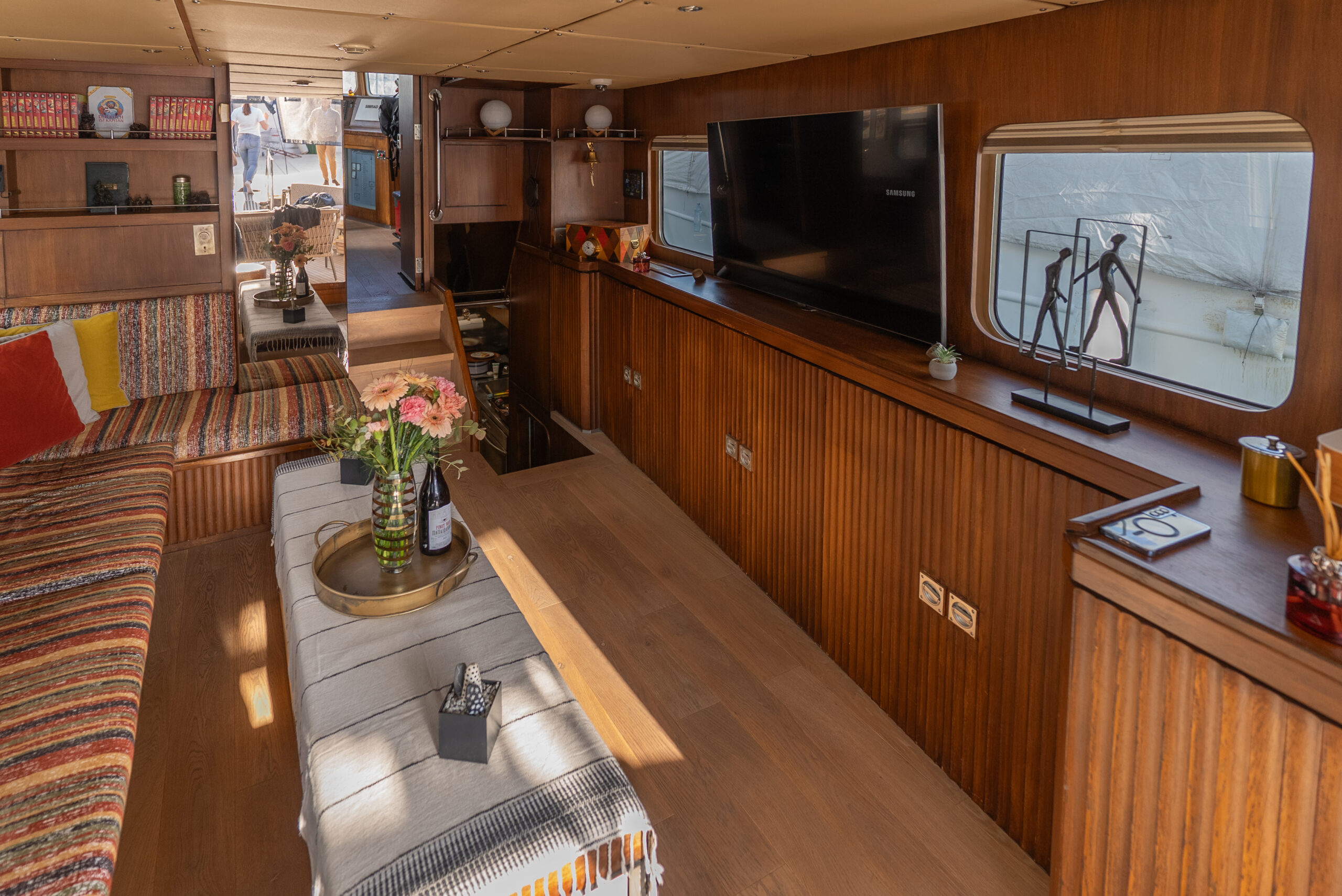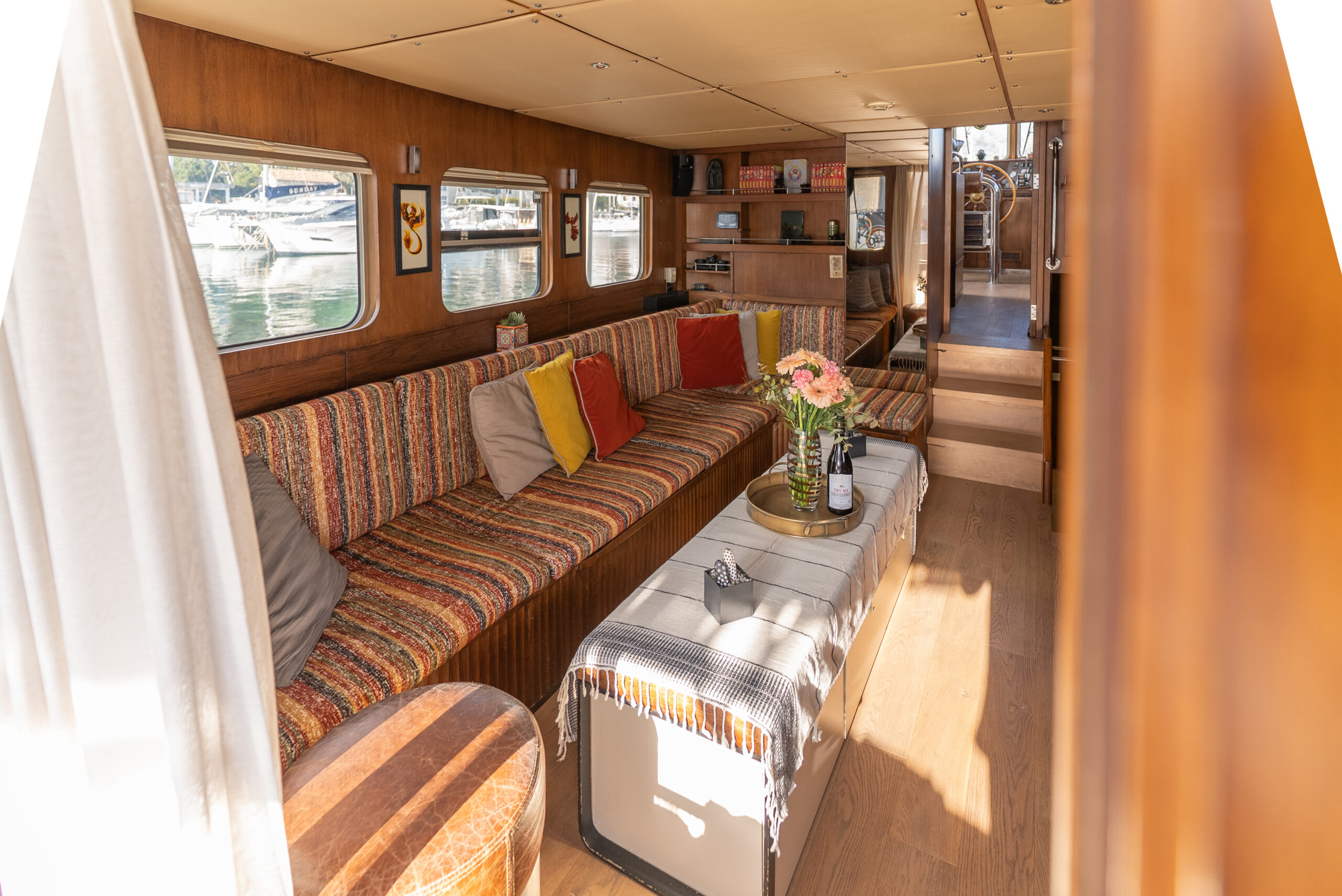 The interior has been modernised with new laminated floors, renewed showers and toilets converted to fresh water, upgraded air conditioning including the engine room, and a Bose five-zone sound system covering cockpit, bow, aft and indoor areas. Original teak decks are in top condition and all hatches, portholes and window frames have been refurbished.