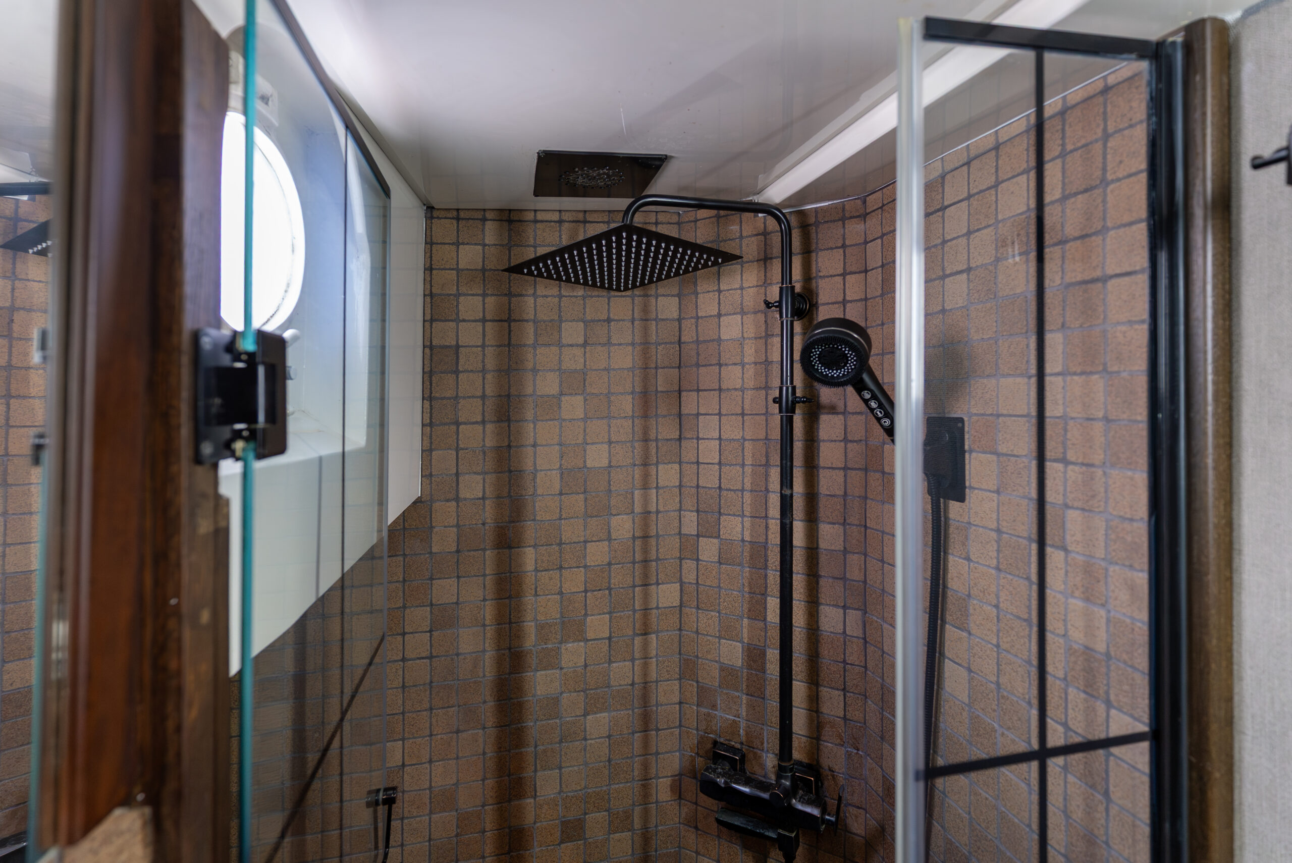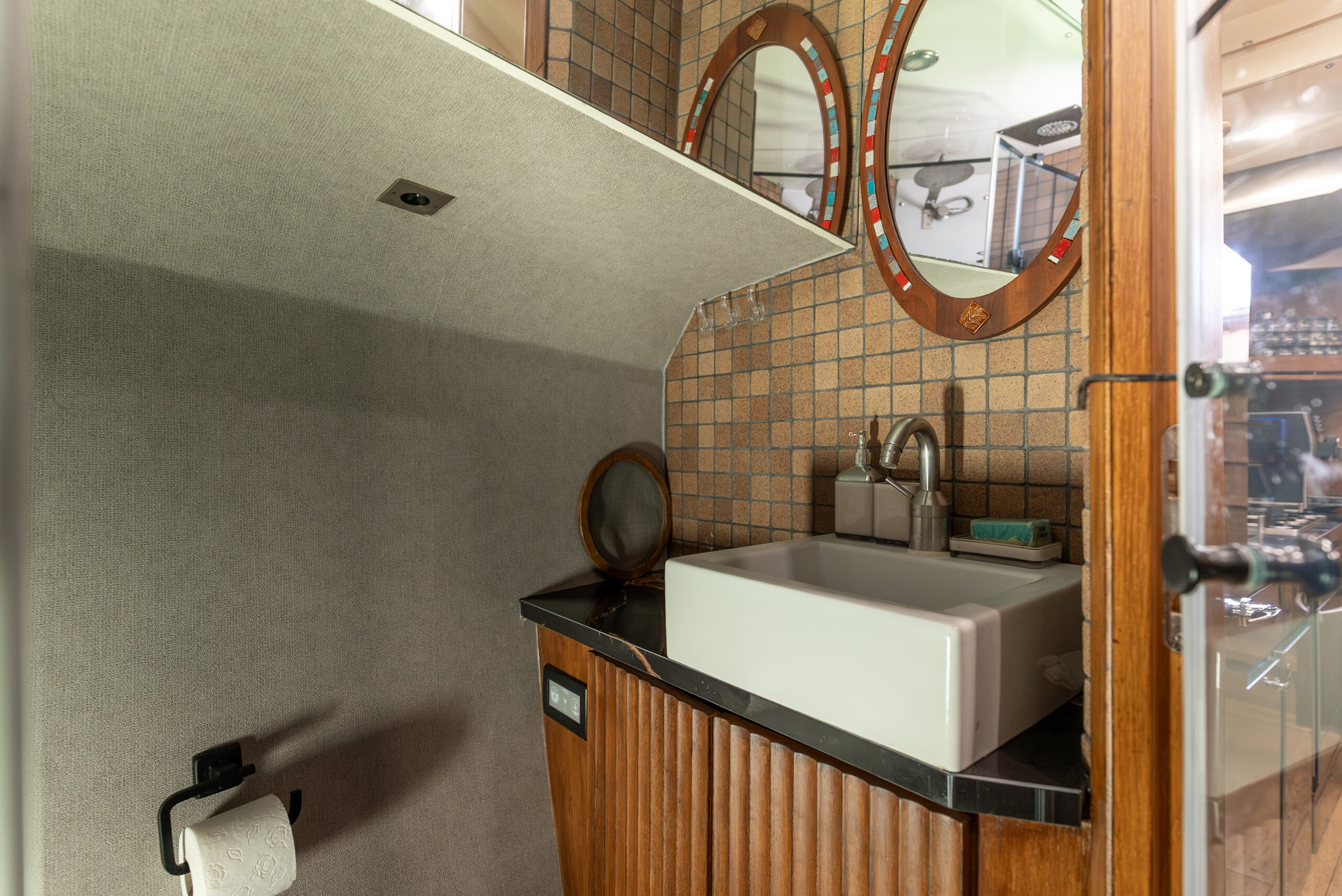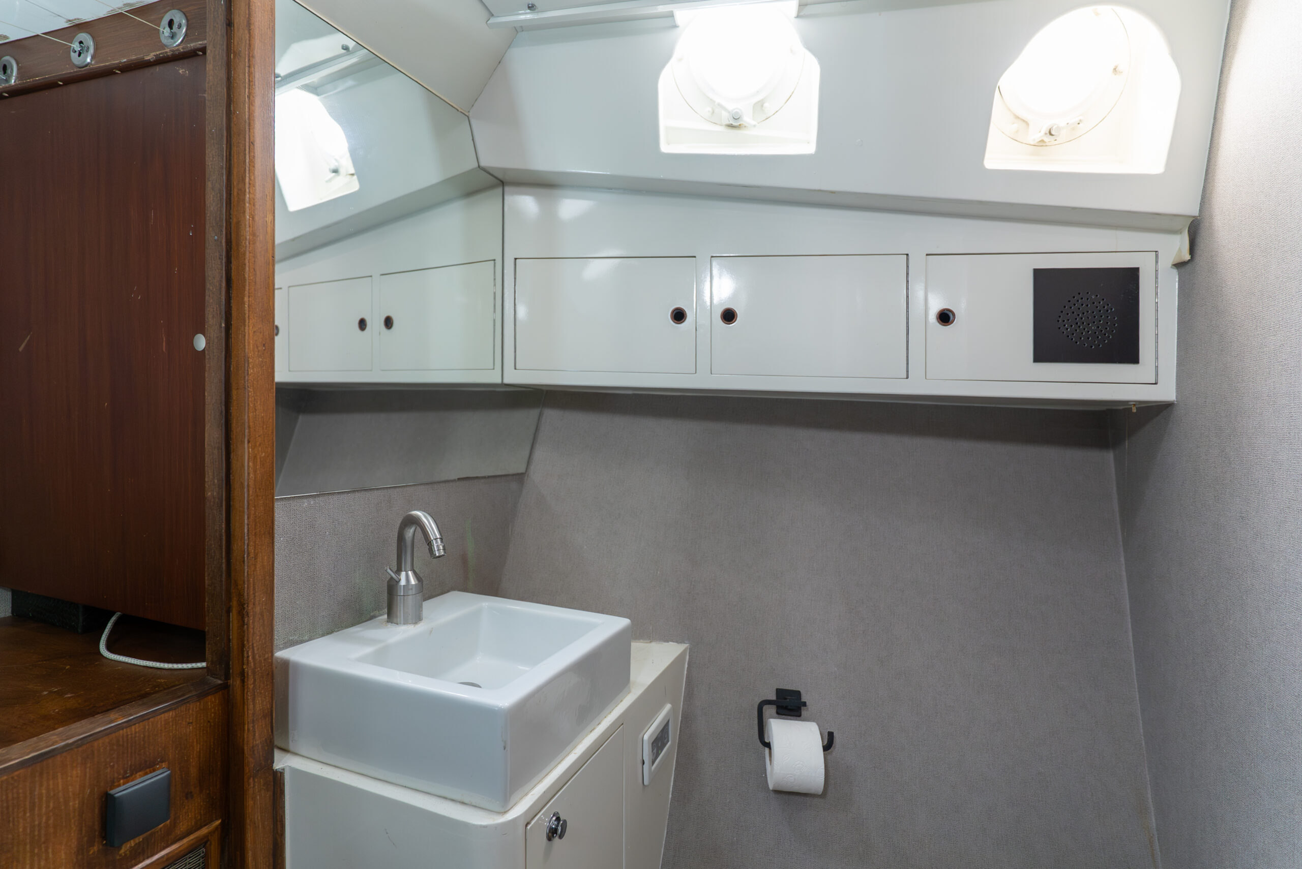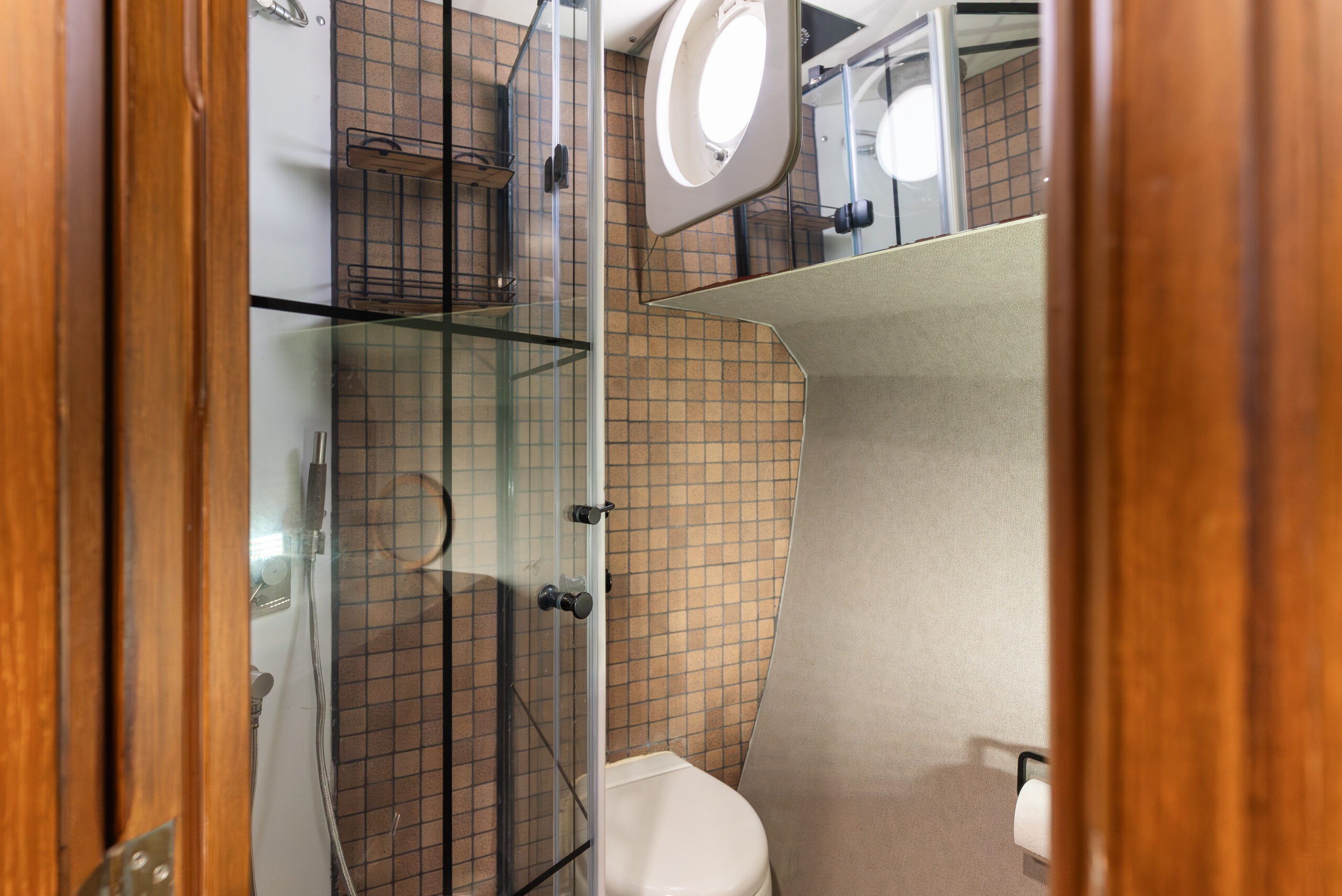 The interior has been modernised with new laminated floors, renewed showers and toilets converted to fresh water, upgraded air conditioning including the engine room, and a Bose five-zone sound system covering cockpit, bow, aft and indoor areas. Original teak decks are in top condition and all hatches, portholes and window frames have been refurbished.