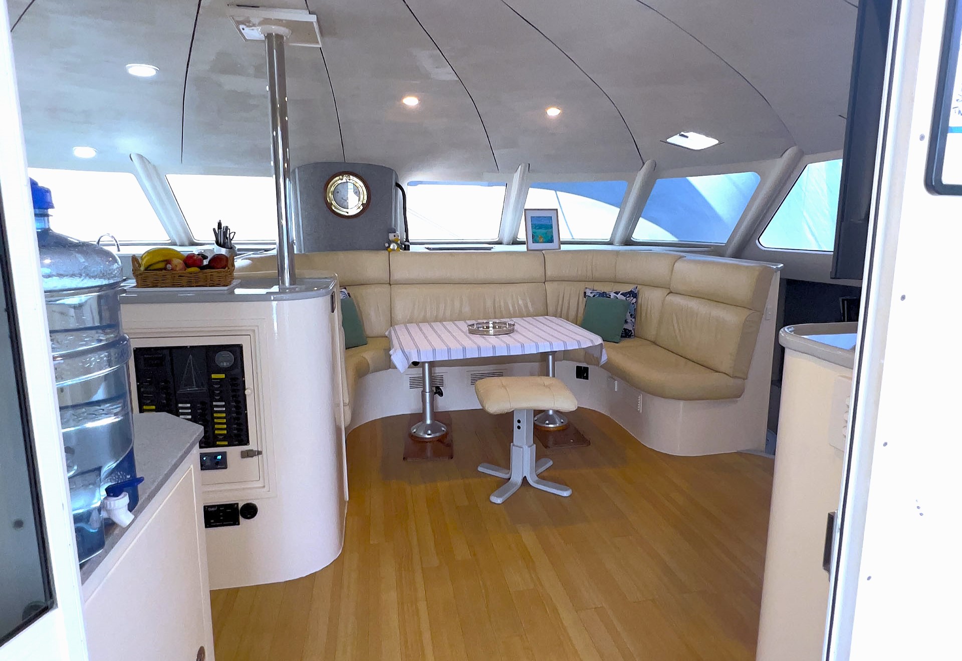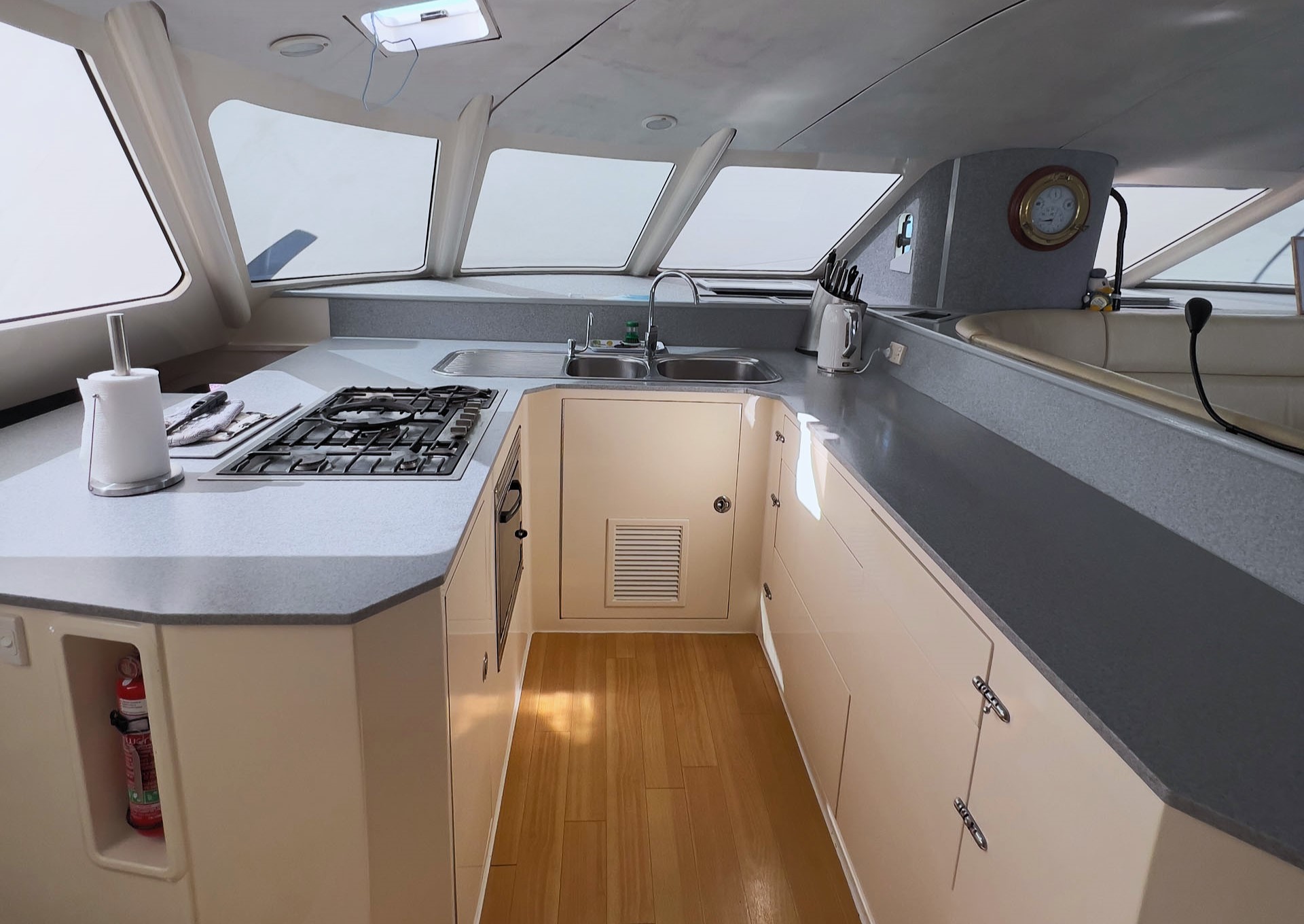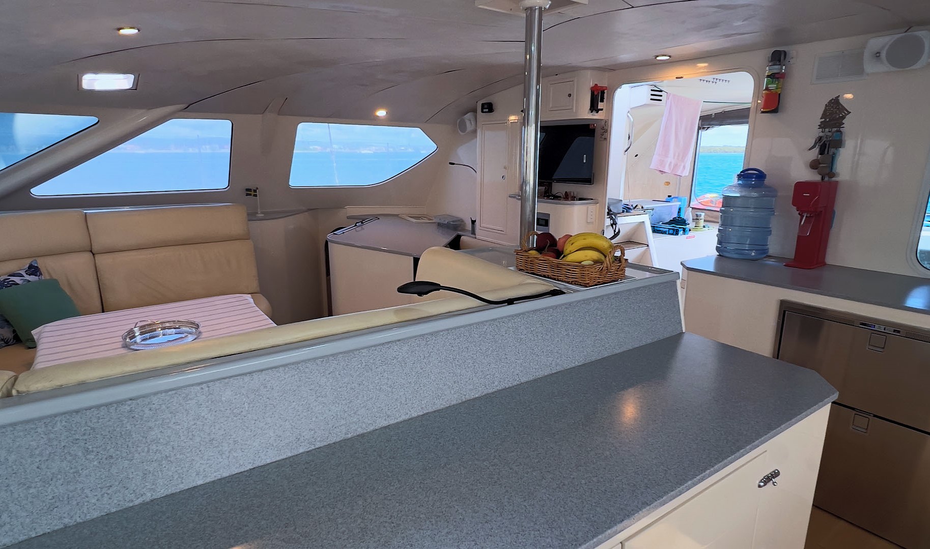 Comfort on board is equally impressive, with spacious queen-sized cabins, a well-equipped galley-up layout, and extensive refrigeration, including a 182L Vitrifrigo fridge and a 150L freezer. A Stella 240L/hour watermaker, an automatic front-loader washing machine, and quality appliances further enhance liveaboard comfort.