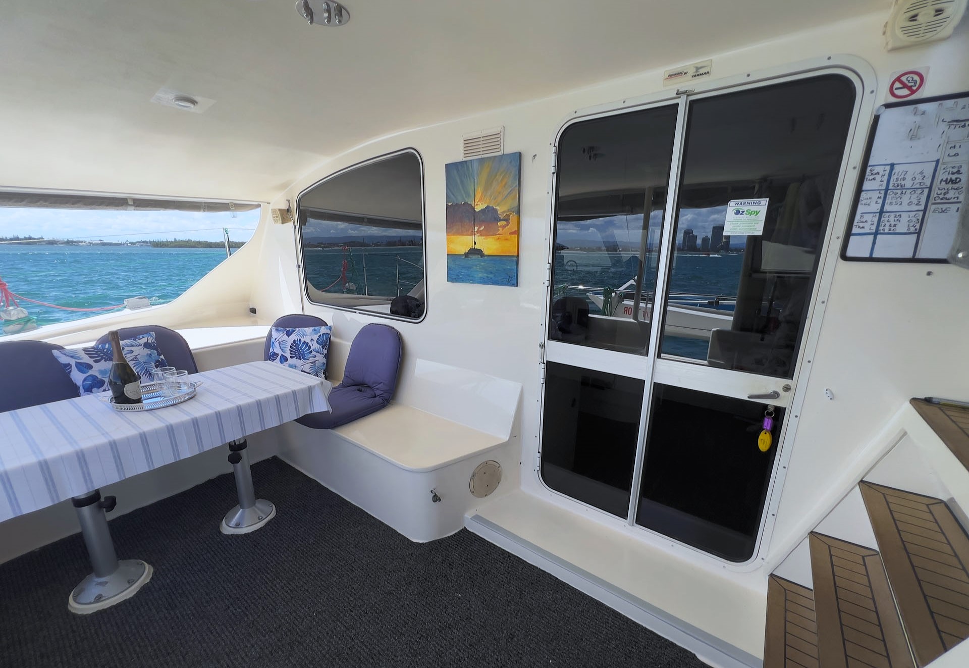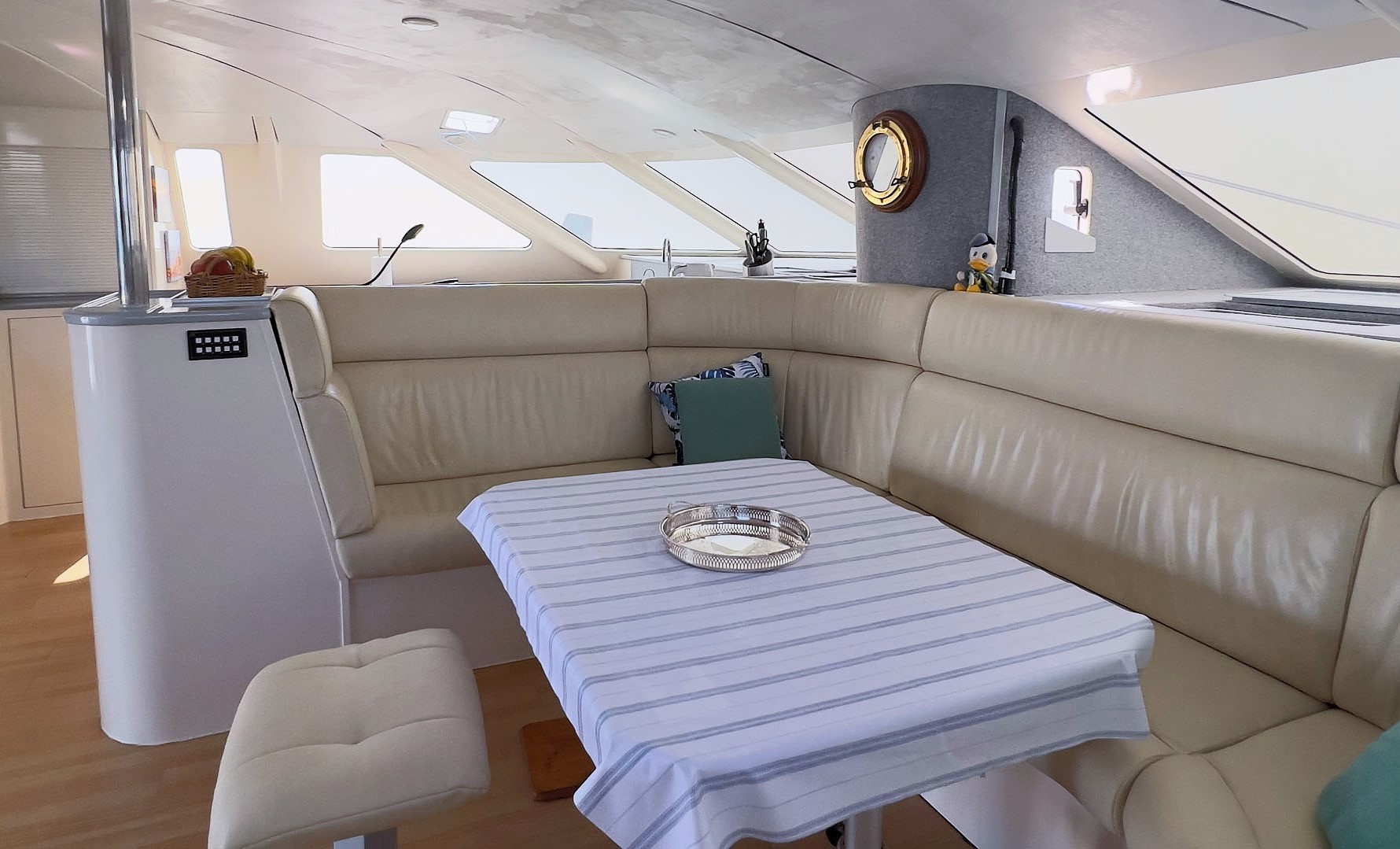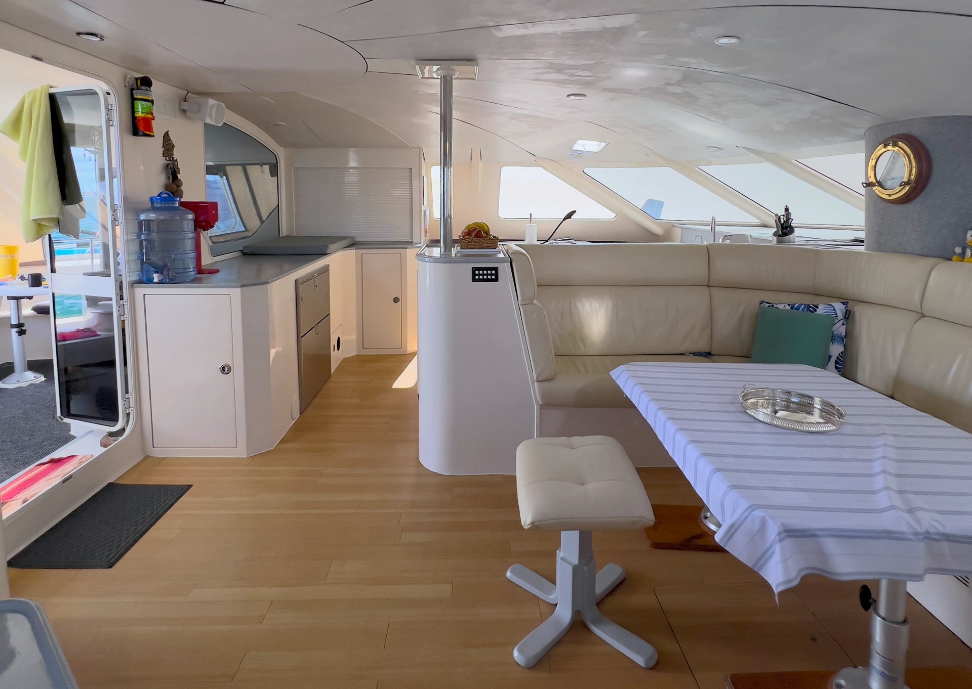 Comfort on board is equally impressive, with spacious queen-sized cabins, a well-equipped galley-up layout, and extensive refrigeration, including a 182L Vitrifrigo fridge and a 150L freezer. A Stella 240L/hour watermaker, an automatic front-loader washing machine, and quality appliances further enhance liveaboard comfort.