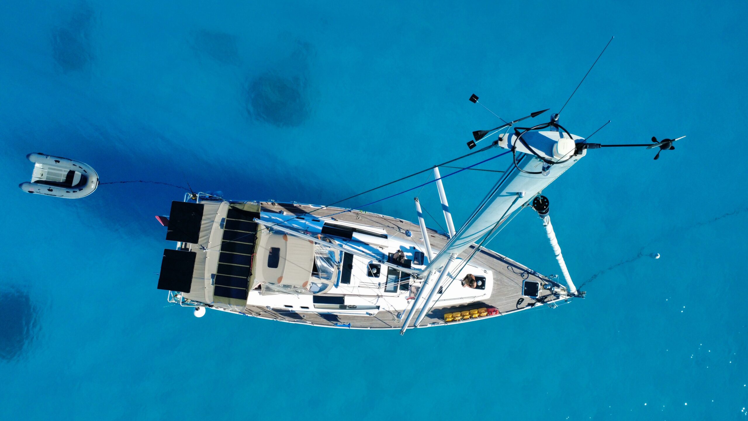 For extended cruising, she is fitted with a Spectra VT-150 watermaker and Webasto 4kW diesel heater. The tender package includes a Quicksilver 350 RIB with Mercury 15hp outboard, plus a full dive setup including compressor.