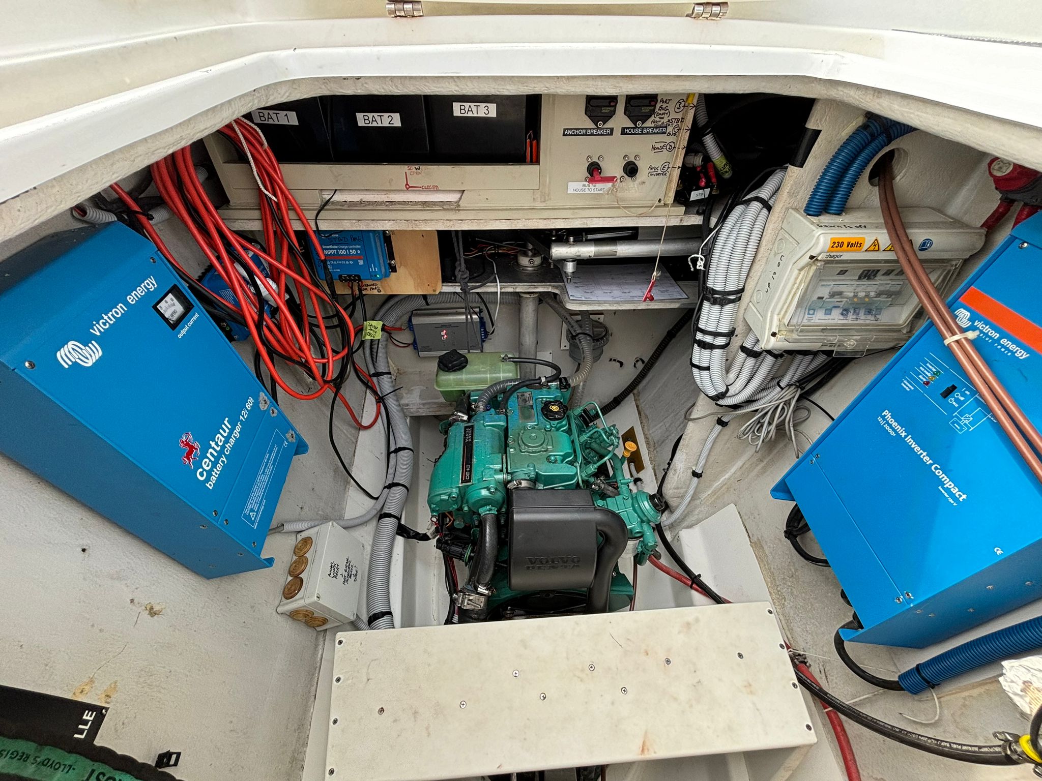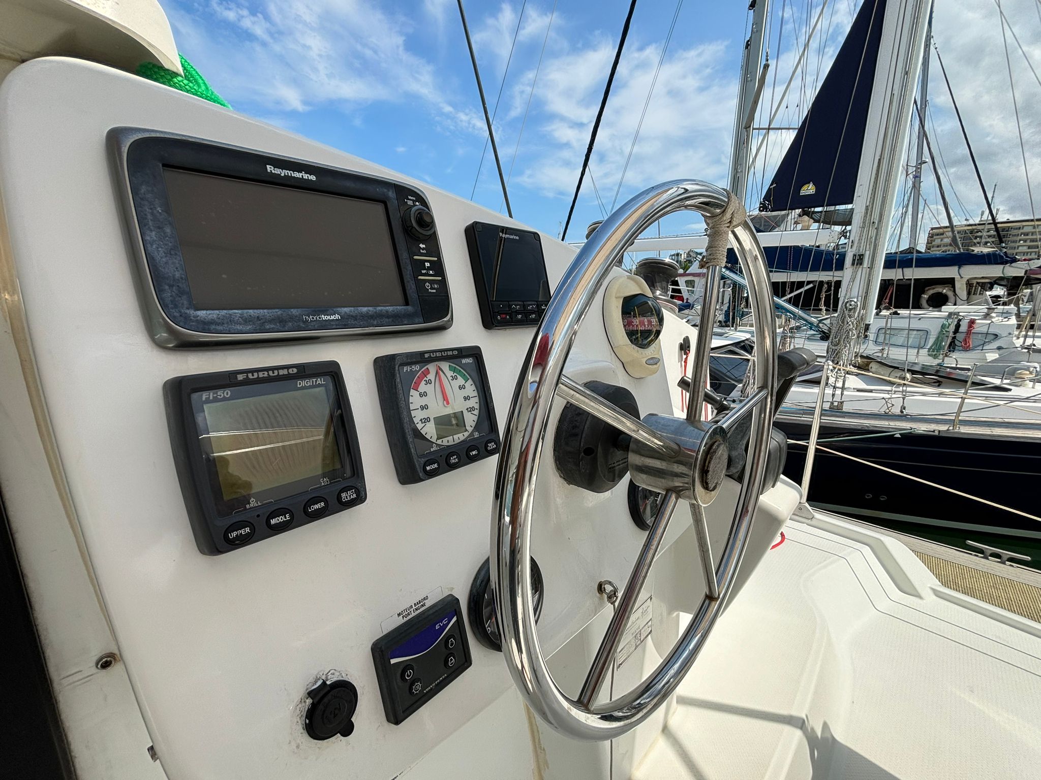 All sail controls are led to the helm, allowing for easy single-handed or short-handed sailing. Significant maintenance and major upgrades include a new watermaker, professionally peeled, re-glassed and recoated hulls below the waterline in 2018, replacement standing rigging in October 2021, new solar panels and lithium batteries, a Rutland 1200 wind generator, and a new Hypalon tender in 2024, plus fresh antifouling completed in December 2025.
