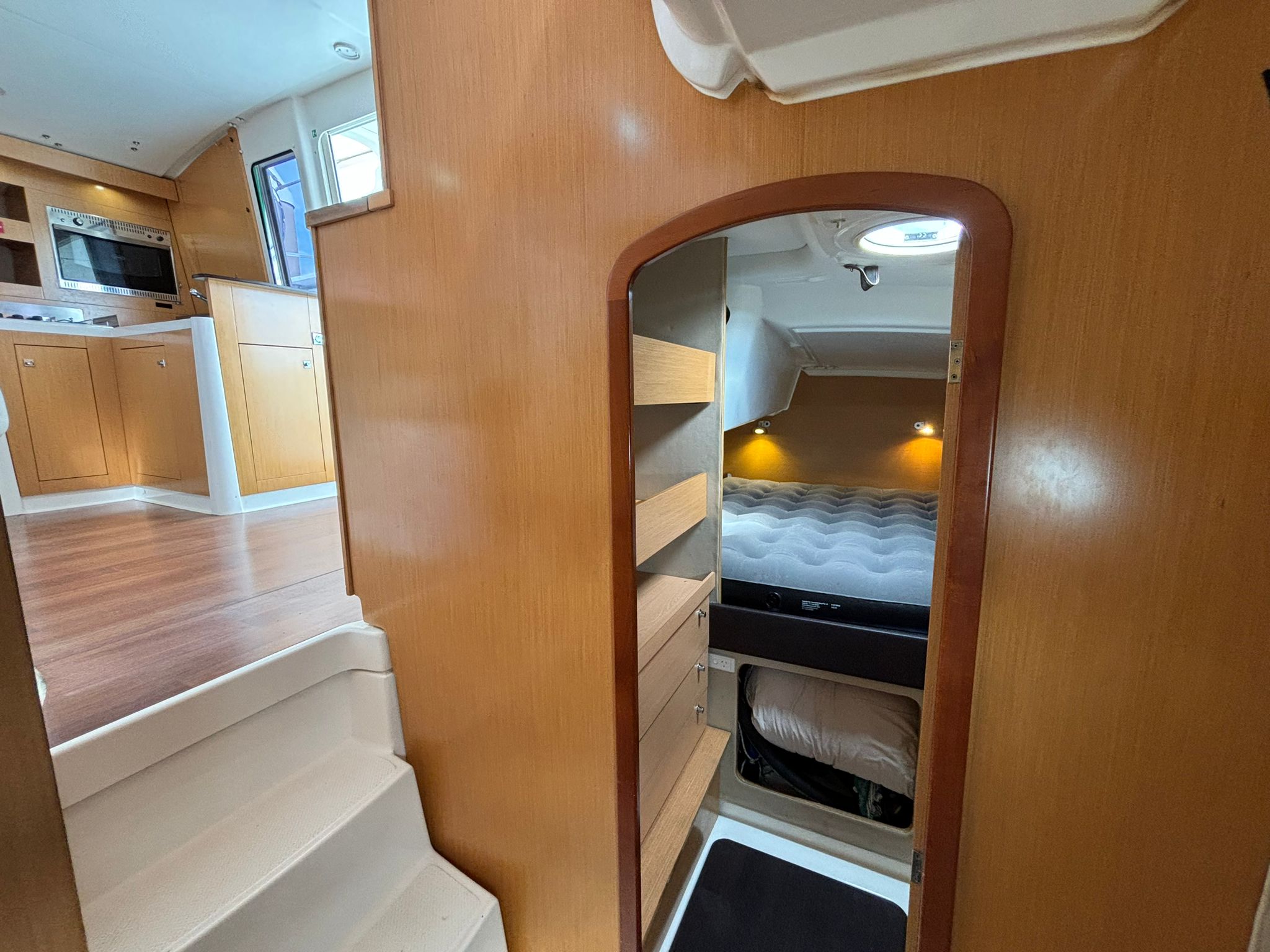 The panoramic saloon and galley connect seamlessly with the large cockpit on a single level, creating an outstanding living and entertaining space with excellent ventilation and visibility. Accommodation is generous for her size, featuring two full-size owner’s cabins with queen-size beds, one in each hull, each with a private ensuite.