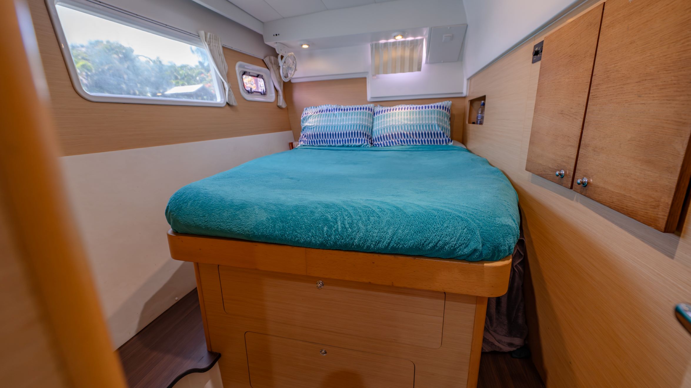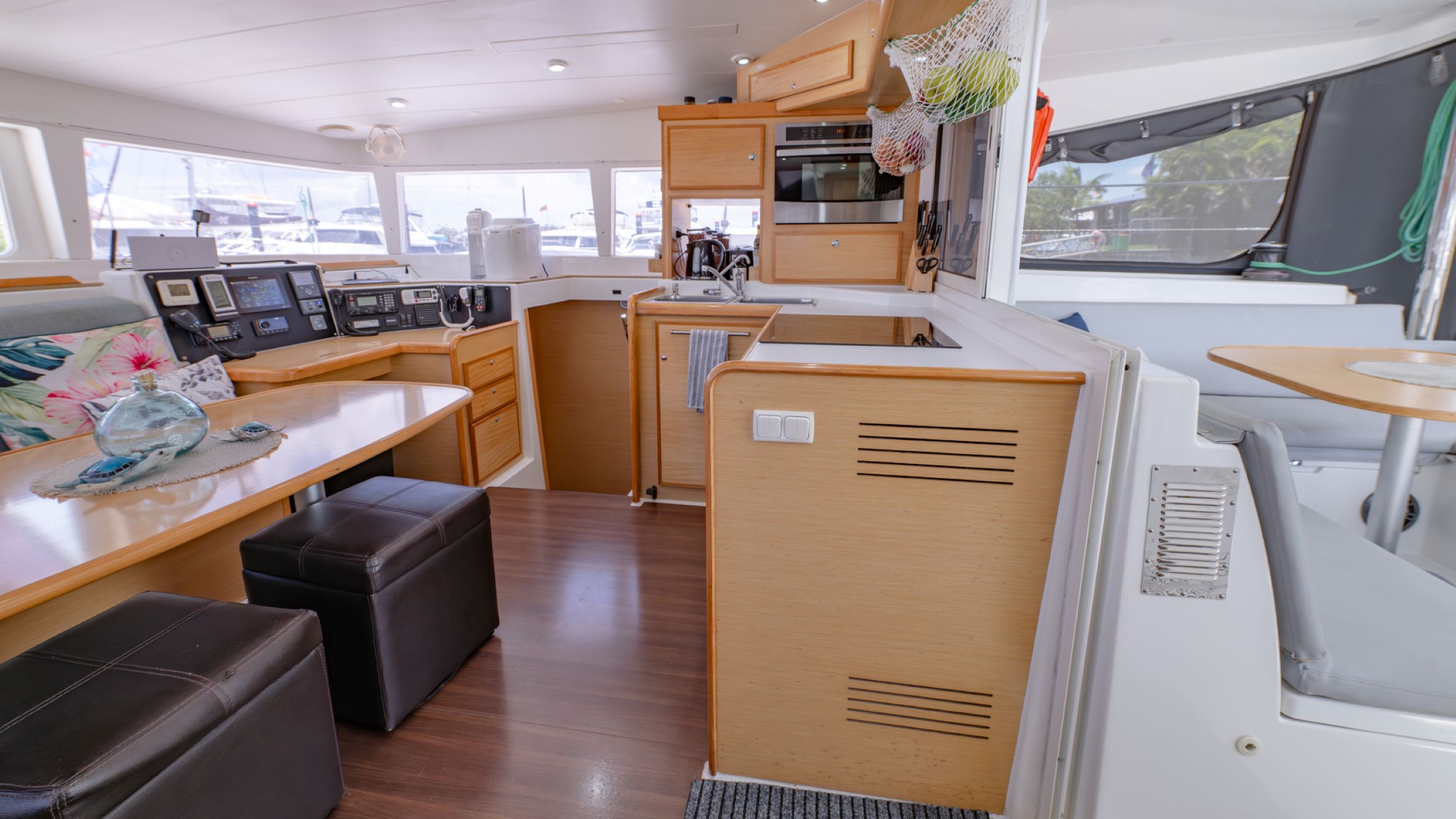 Powered by twin Yanmar 3JH5E diesel engines, she cruises comfortably at 6 knots with a maximum speed of 10 knots. Her setup for long-range cruising includes extensive refrigeration, a Stella watermaker producing 70 L per hour, 2,000 W of solar capacity and a robust lithium battery system with Victron management. Raymarine navigation electronics, electric heads, air conditioning and a well-equipped galley further enhance onboard comfort.