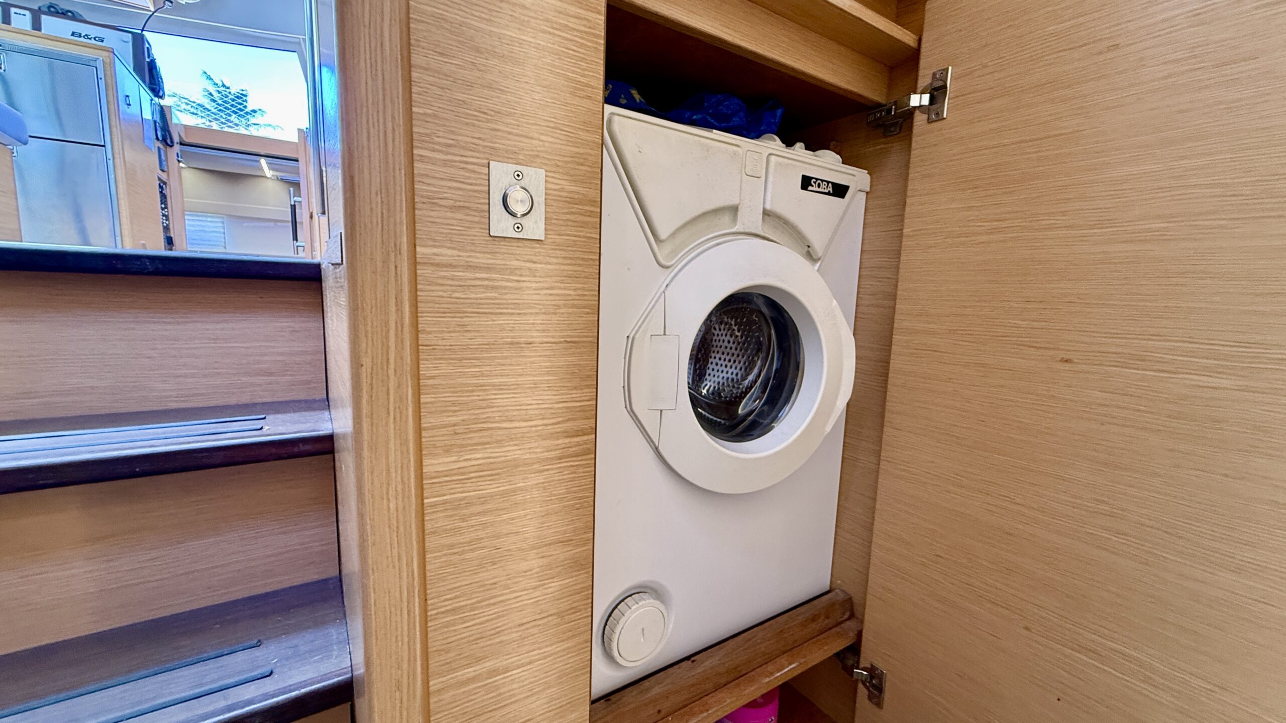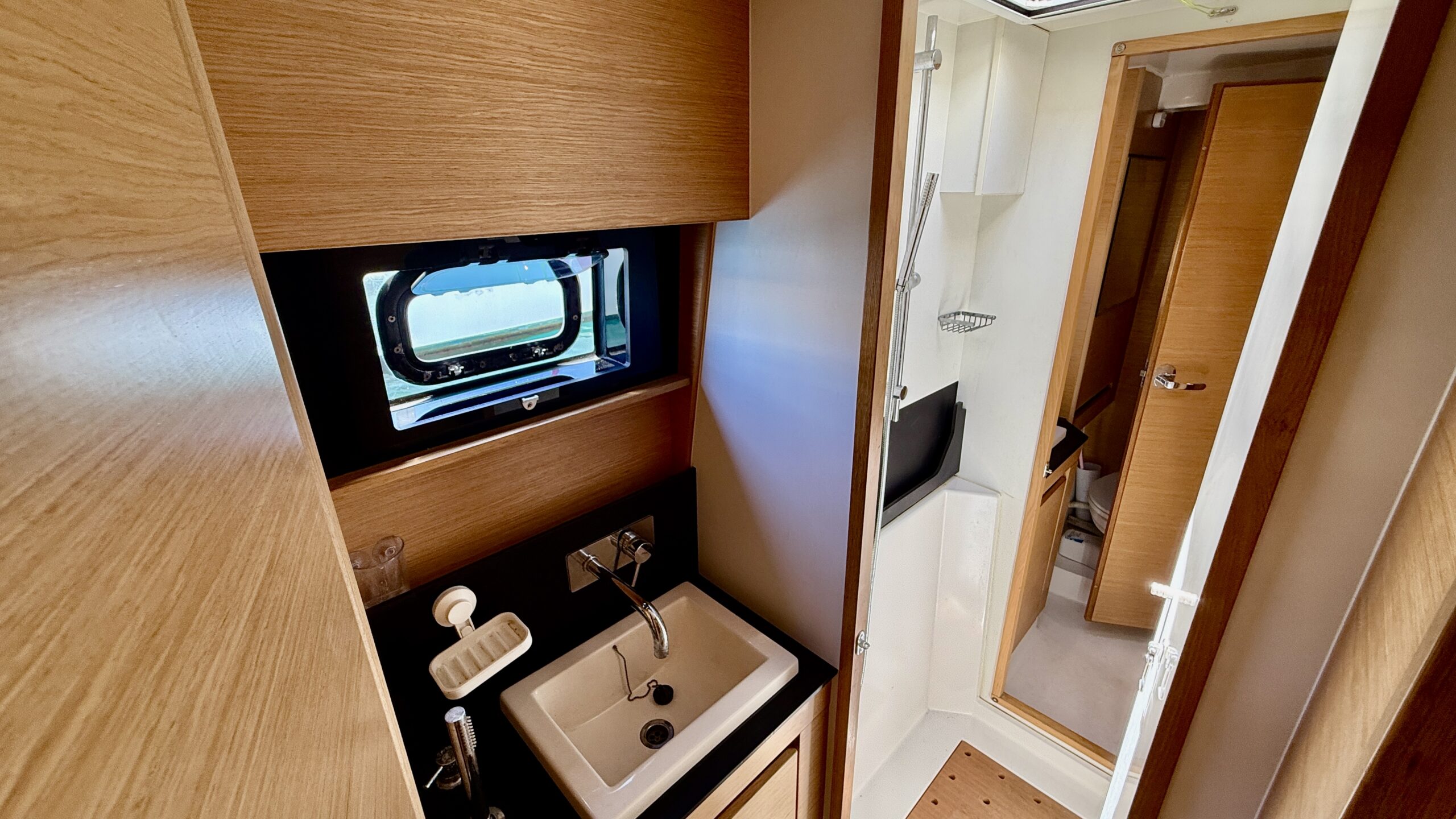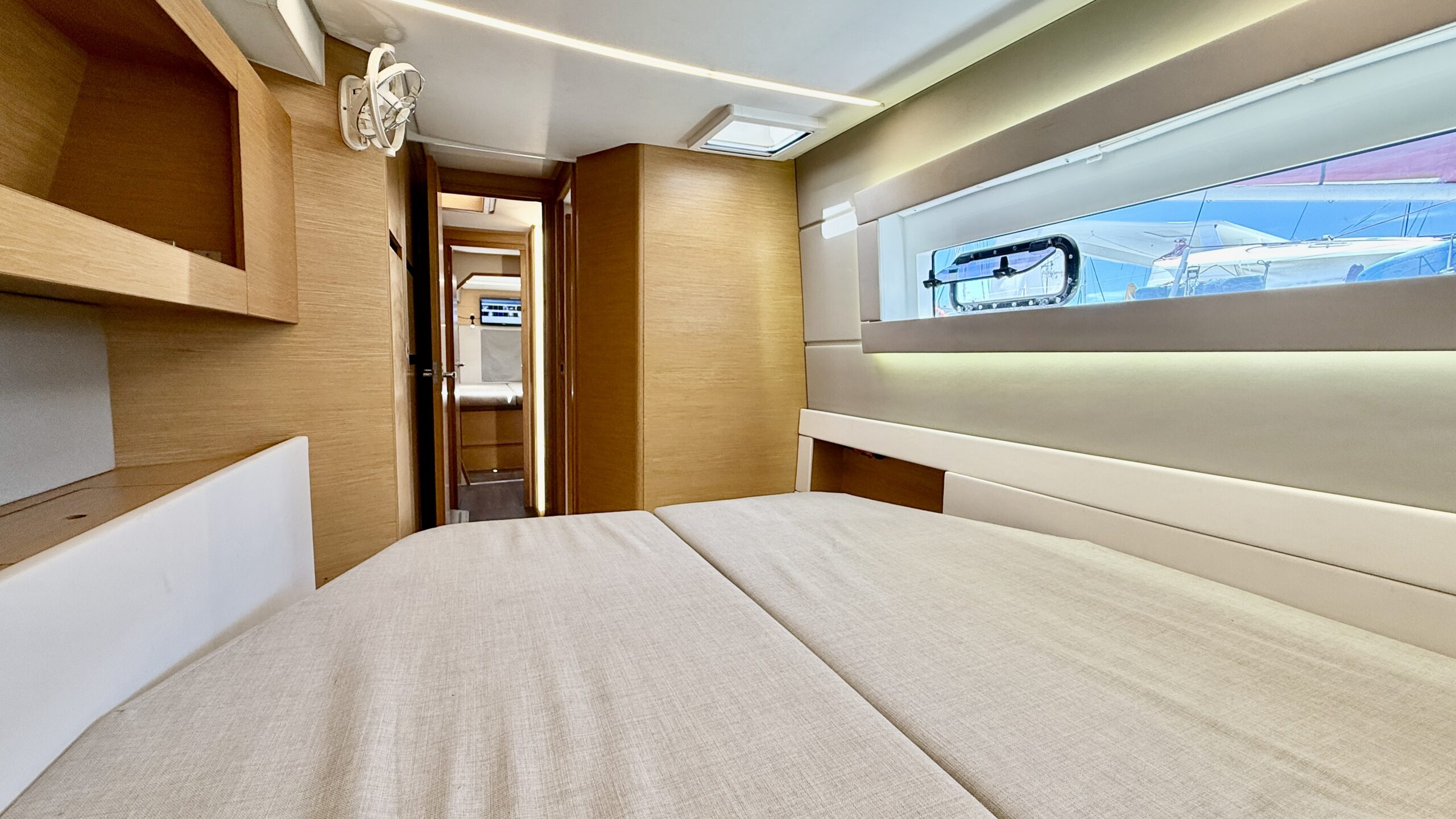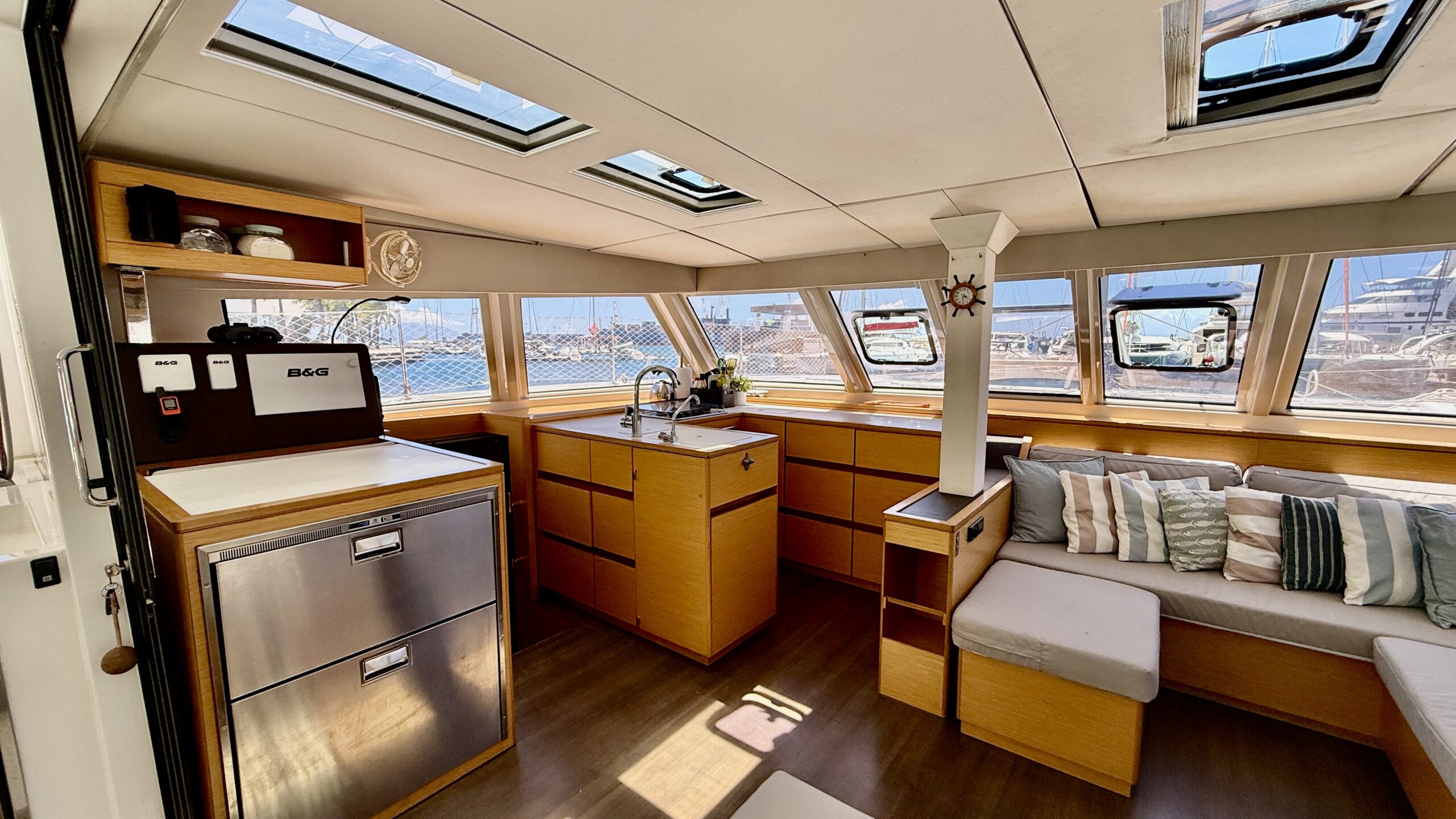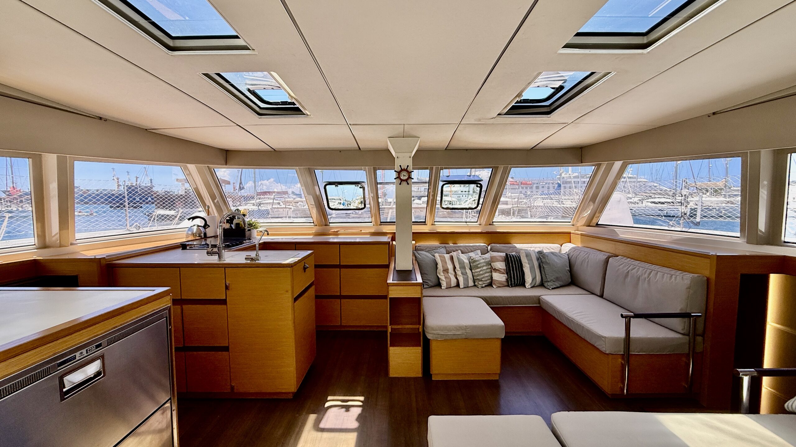 The open-plan saloon and galley create a bright, connected living space perfectly suited to family life, while the twin helm stations allow everyone to remain safely together on one level while sailing. This thoughtful design delivers both practical passagemaking capability and relaxed onboard living.