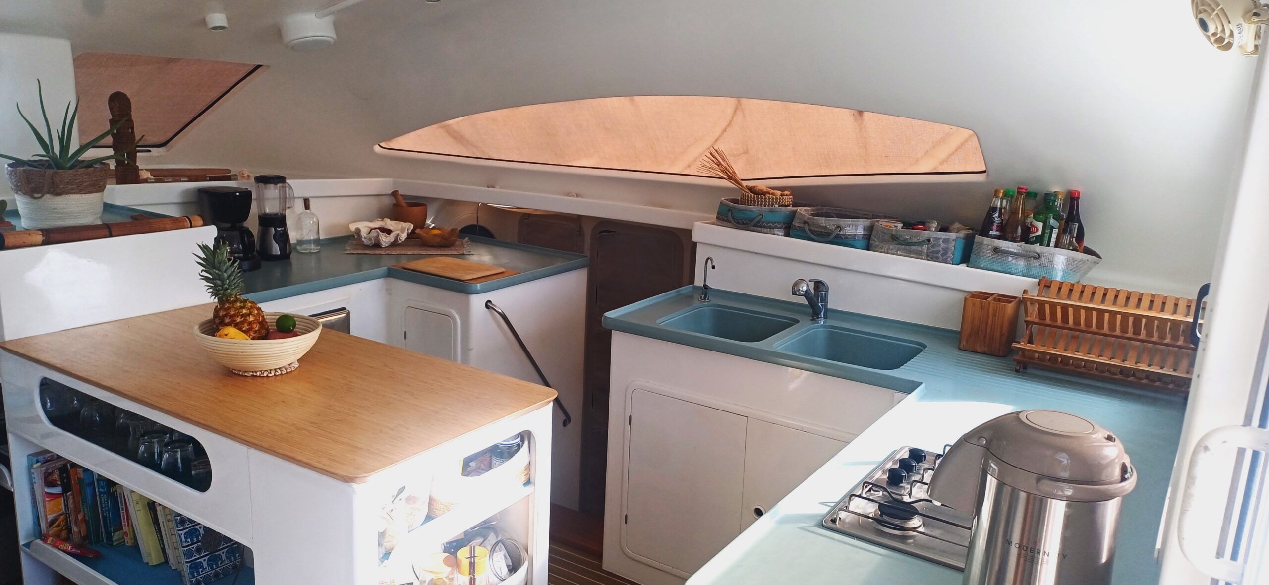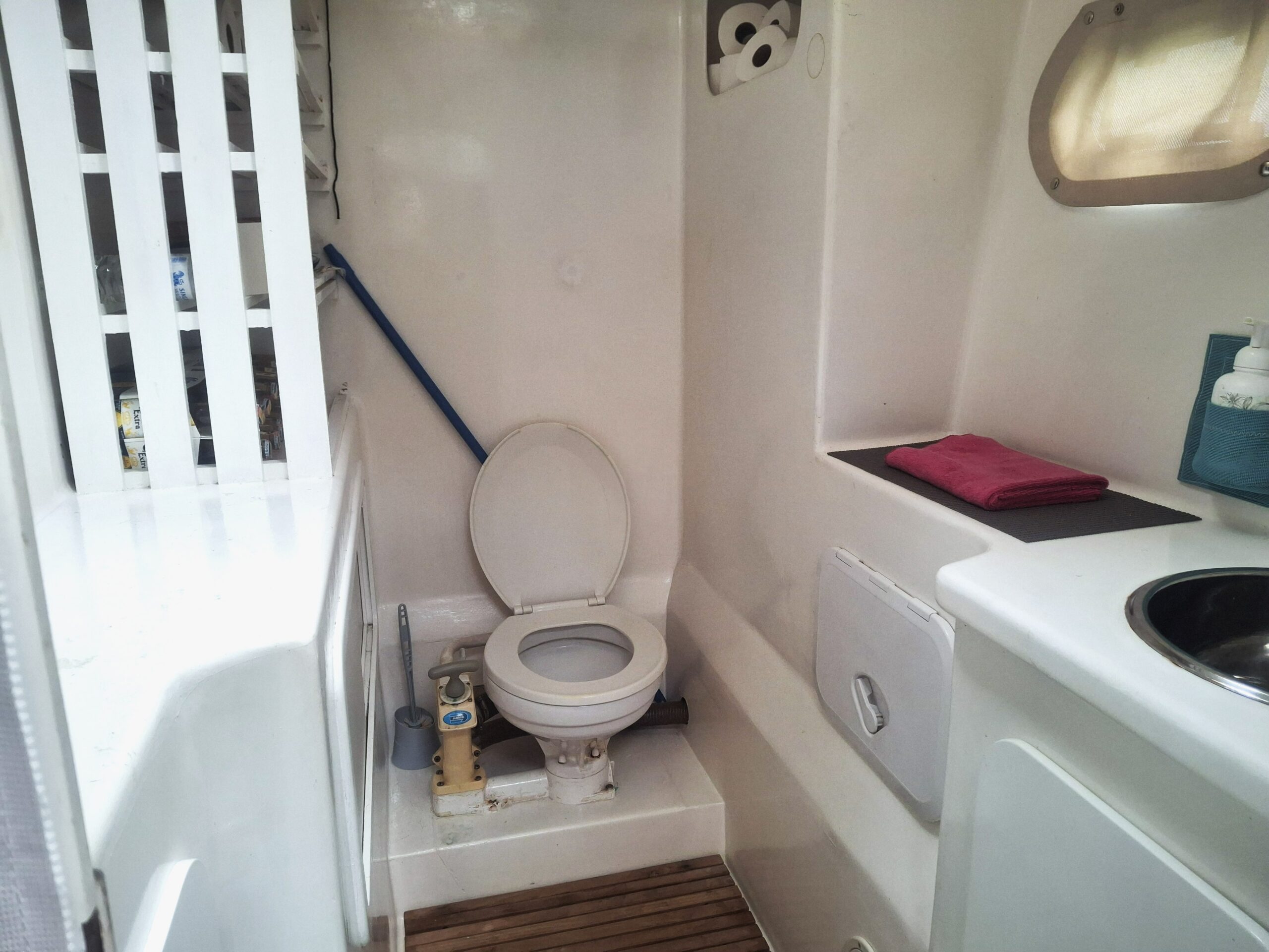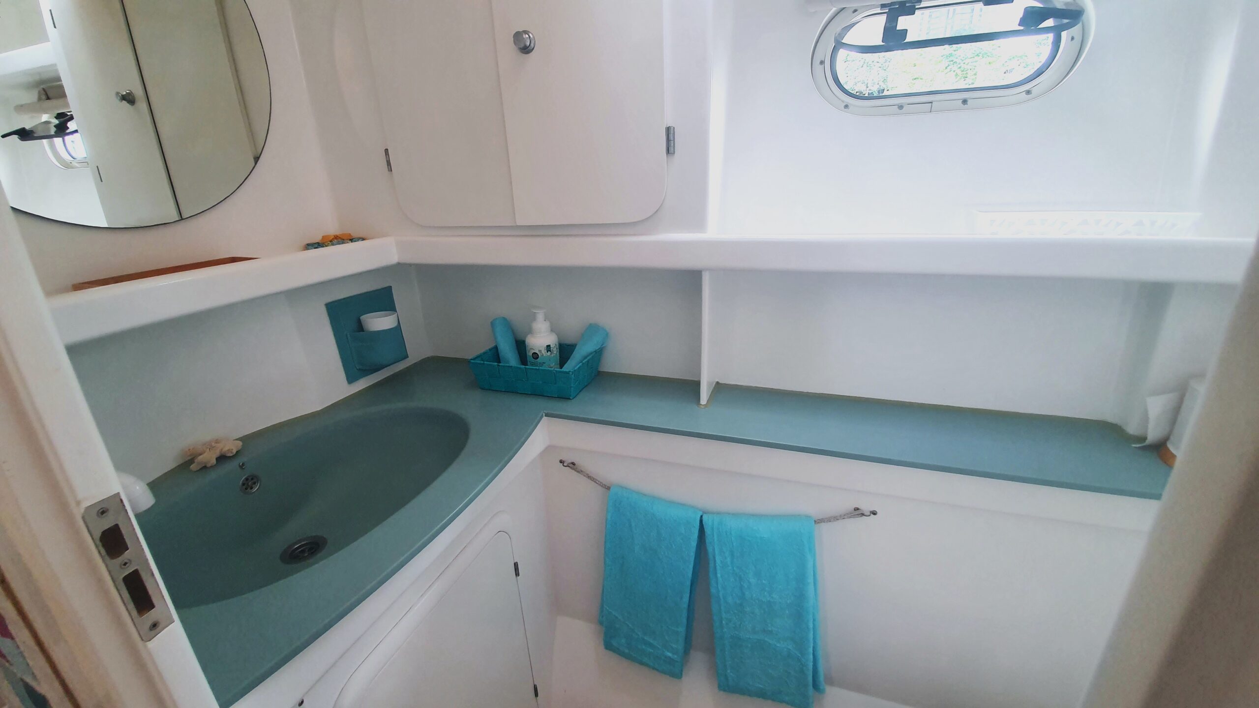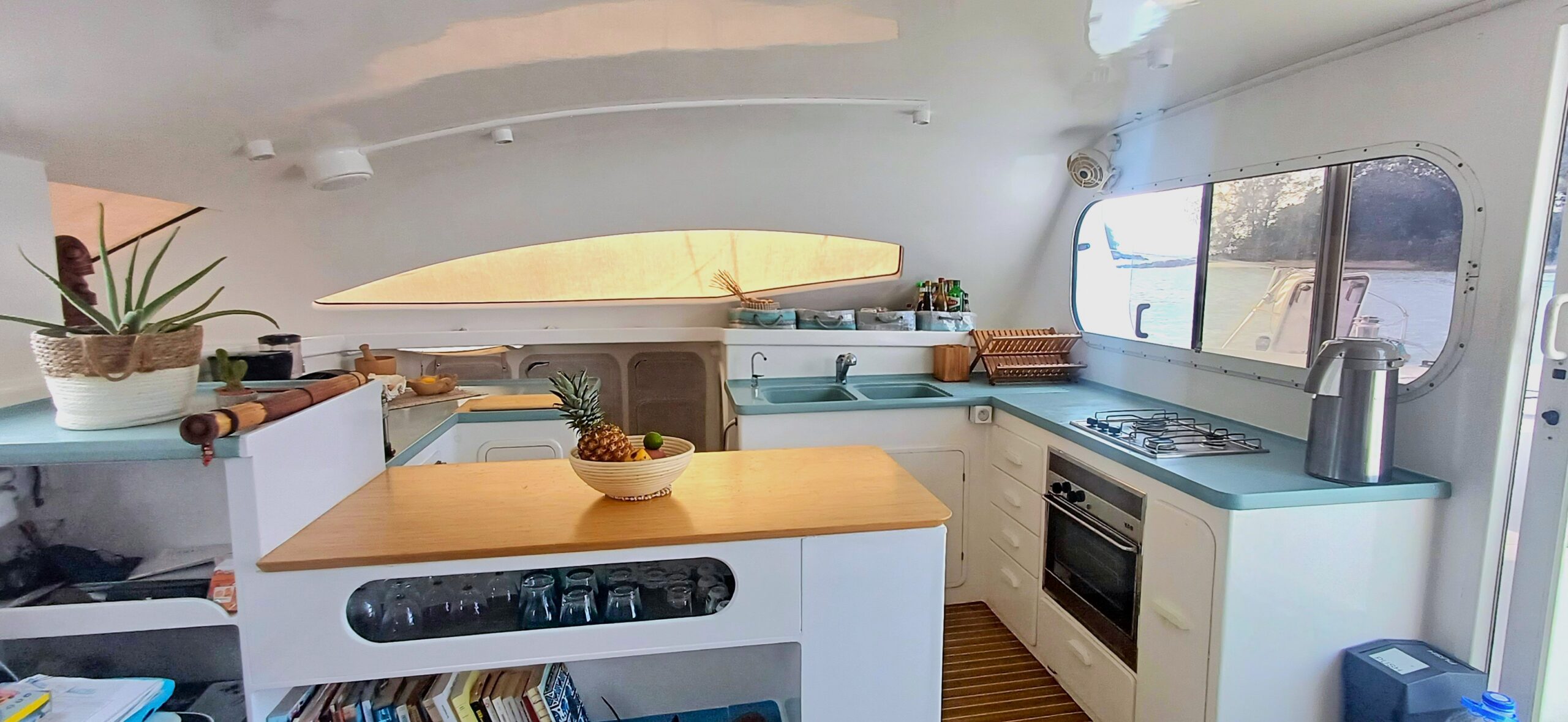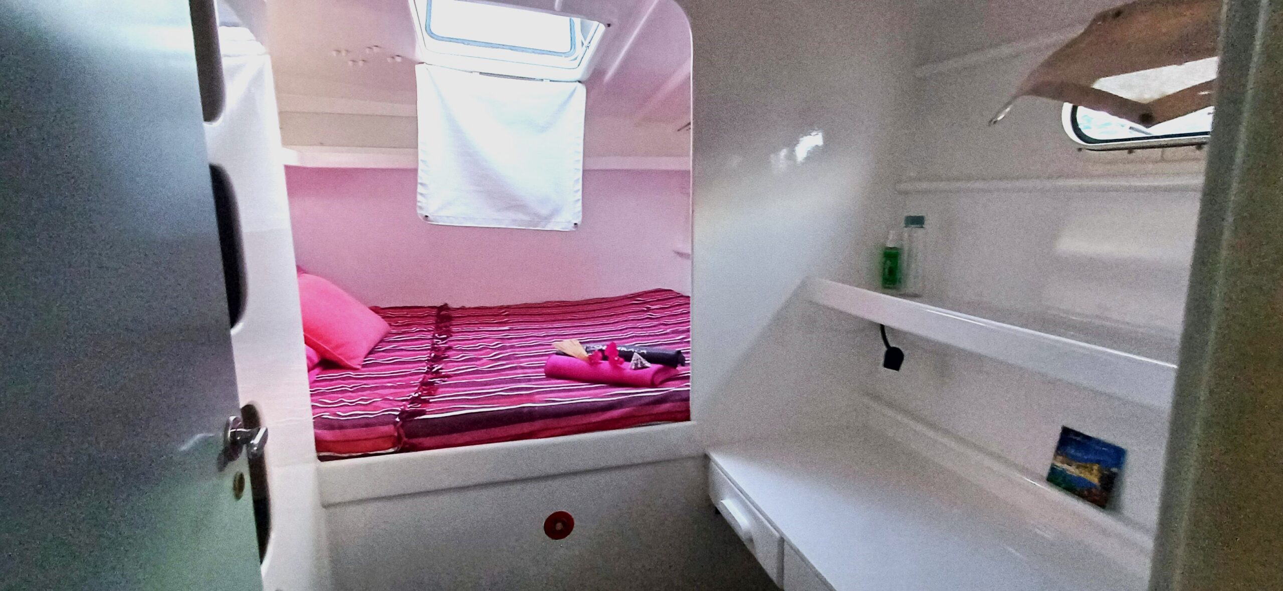 Her interior layout is generous and practical for extended liveaboard cruising. The port hull features two double cabins plus a forward technical and workshop space housing the Aquabase 60 L/h watermaker, easily convertible to an additional berth. The starboard hull offers a comfortable owner’s aft cabin with en-suite head and a separate forward guest cabin, providing excellent privacy and balance onboard. Abundant storage, dedicated workspaces and excellent natural ventilation make life aboard comfortable in tropical climates.