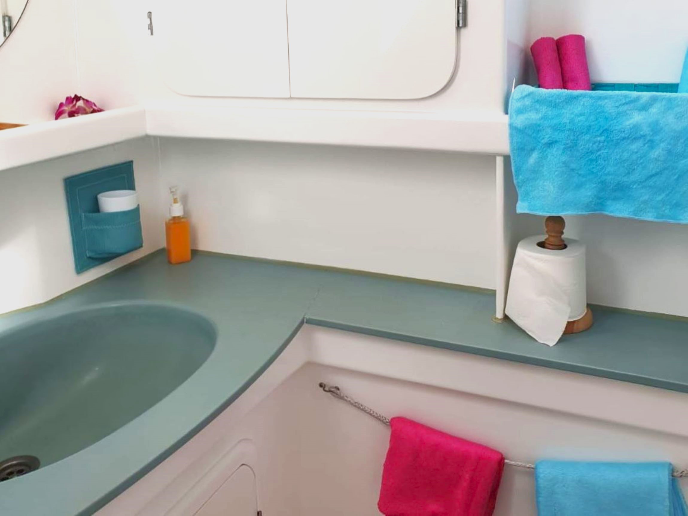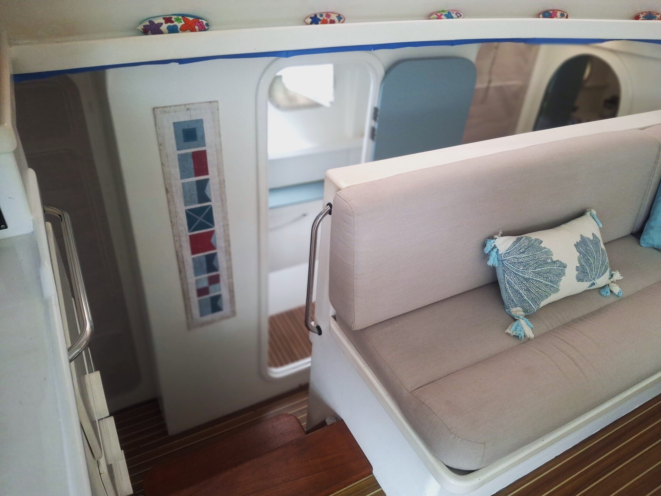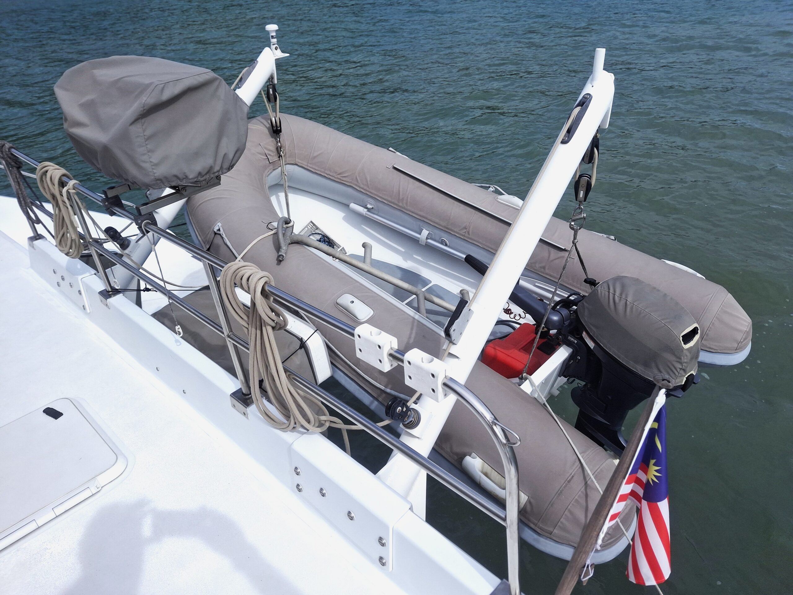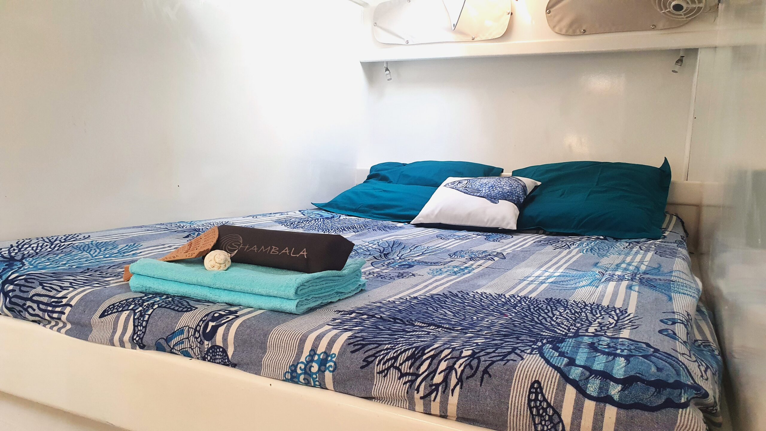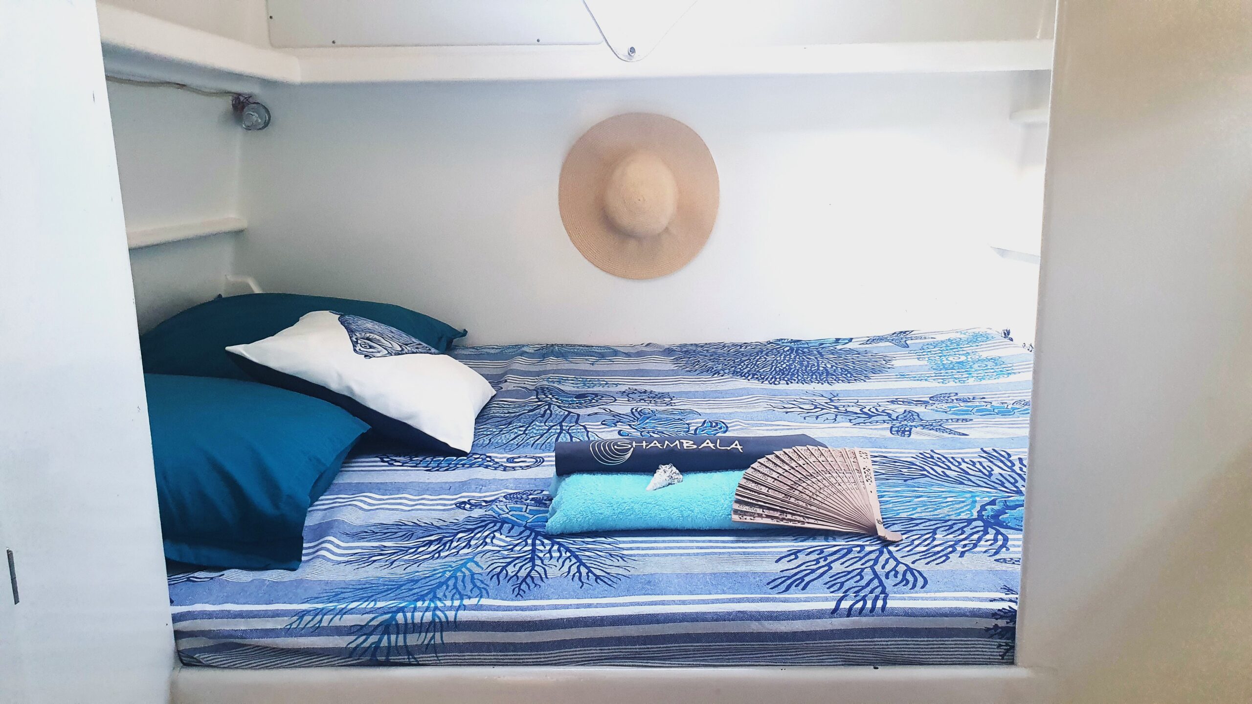 Her interior layout is generous and practical for extended liveaboard cruising. The port hull features two double cabins plus a forward technical and workshop space housing the Aquabase 60 L/h watermaker, easily convertible to an additional berth. The starboard hull offers a comfortable owner’s aft cabin with en-suite head and a separate forward guest cabin, providing excellent privacy and balance onboard. Abundant storage, dedicated workspaces and excellent natural ventilation make life aboard comfortable in tropical climates.