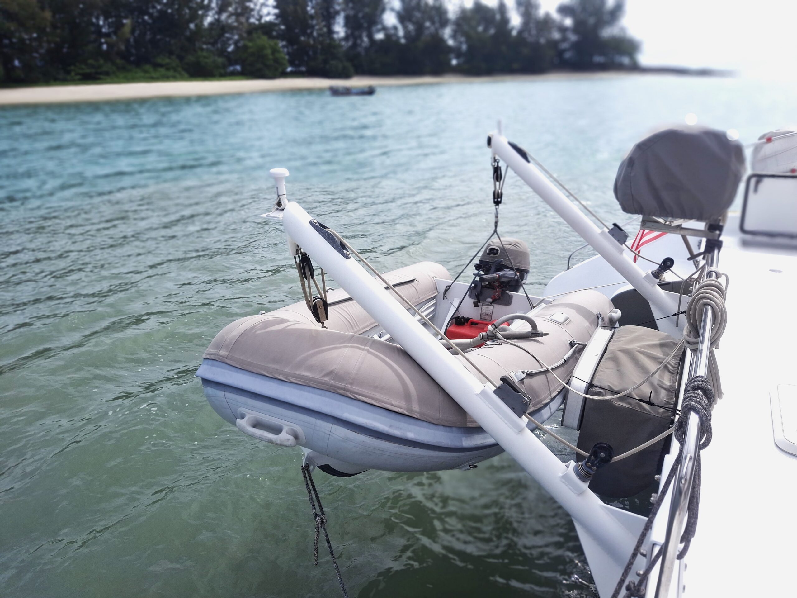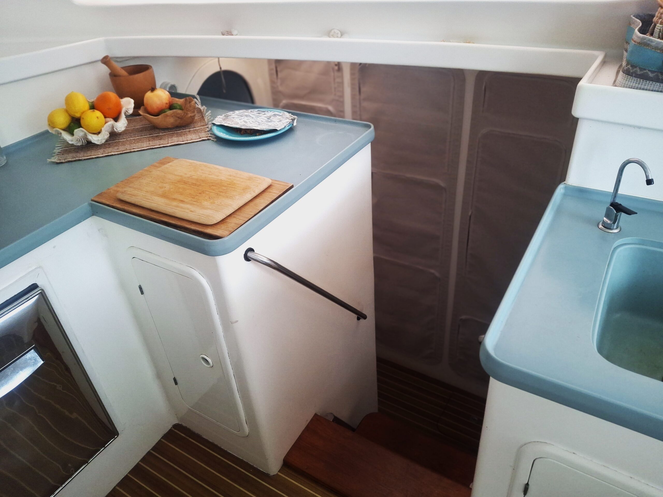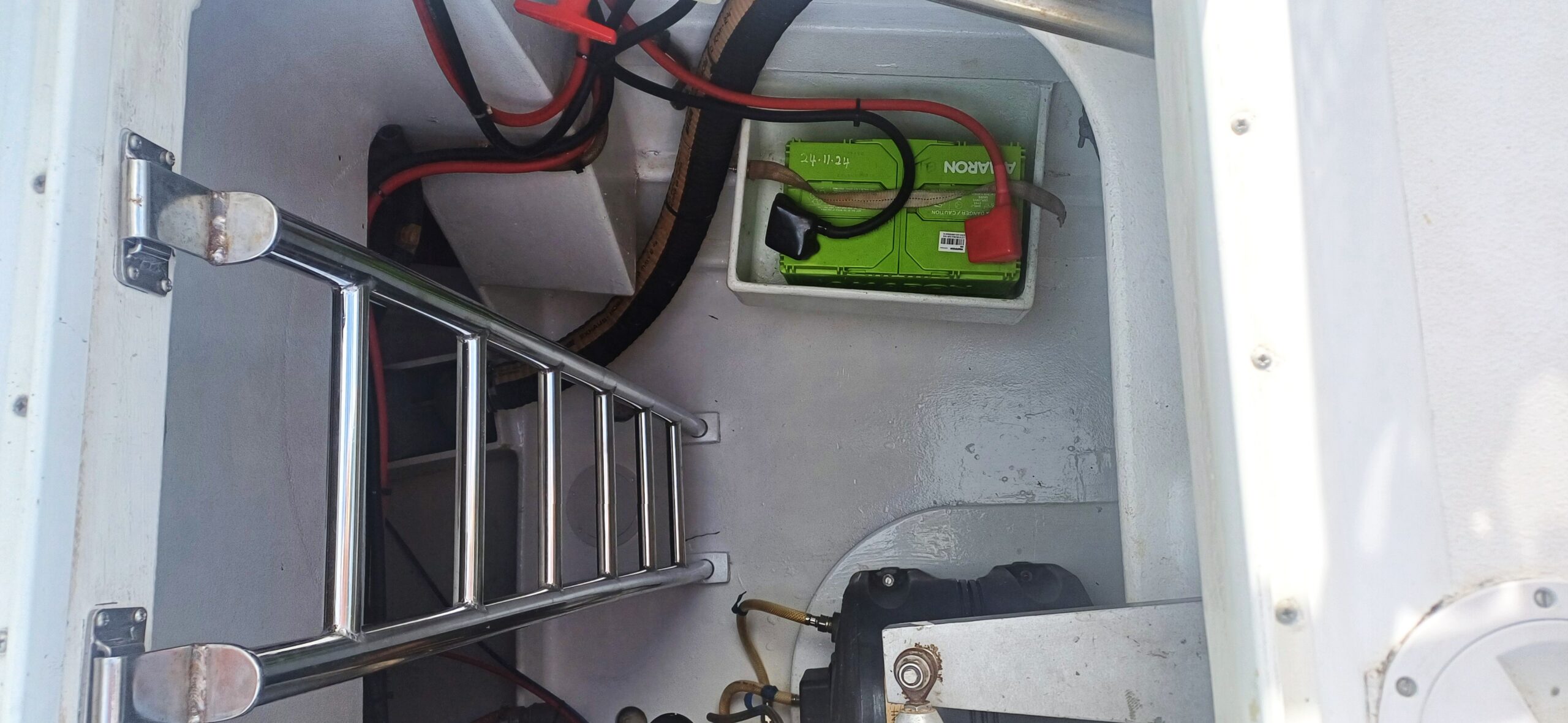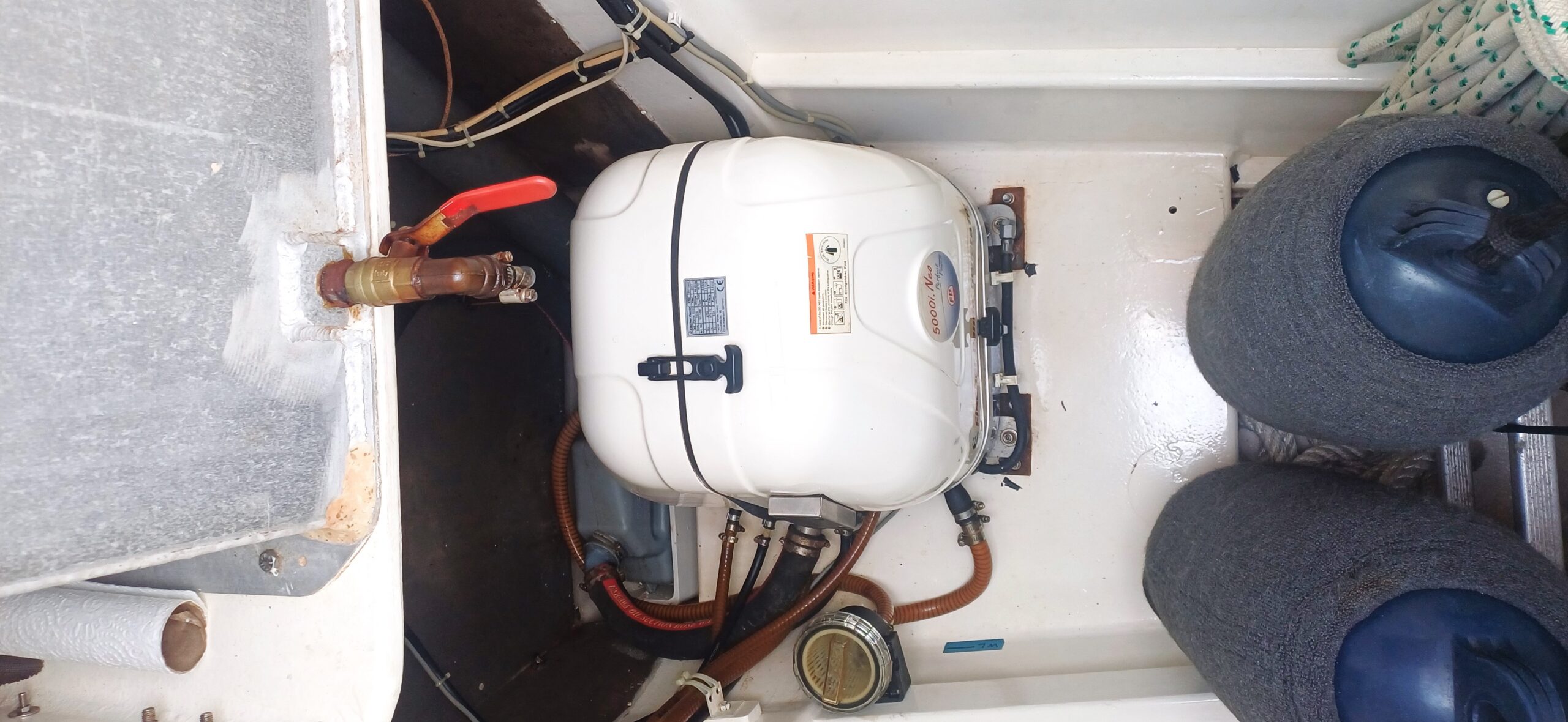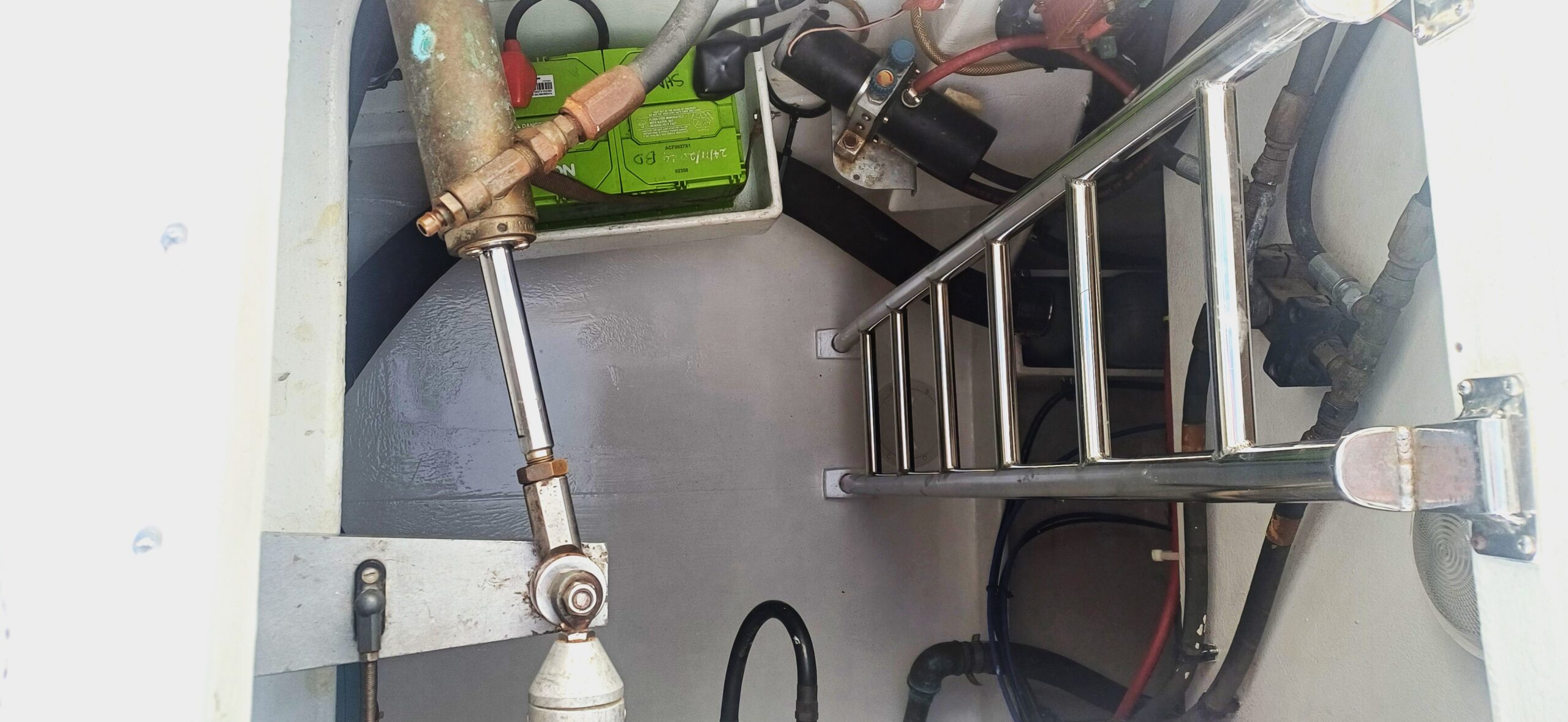 Her interior layout is generous and practical for extended liveaboard cruising. The port hull features two double cabins plus a forward technical and workshop space housing the Aquabase 60 L/h watermaker, easily convertible to an additional berth. The starboard hull offers a comfortable owner’s aft cabin with en-suite head and a separate forward guest cabin, providing excellent privacy and balance onboard. Abundant storage, dedicated workspaces and excellent natural ventilation make life aboard comfortable in tropical climates.