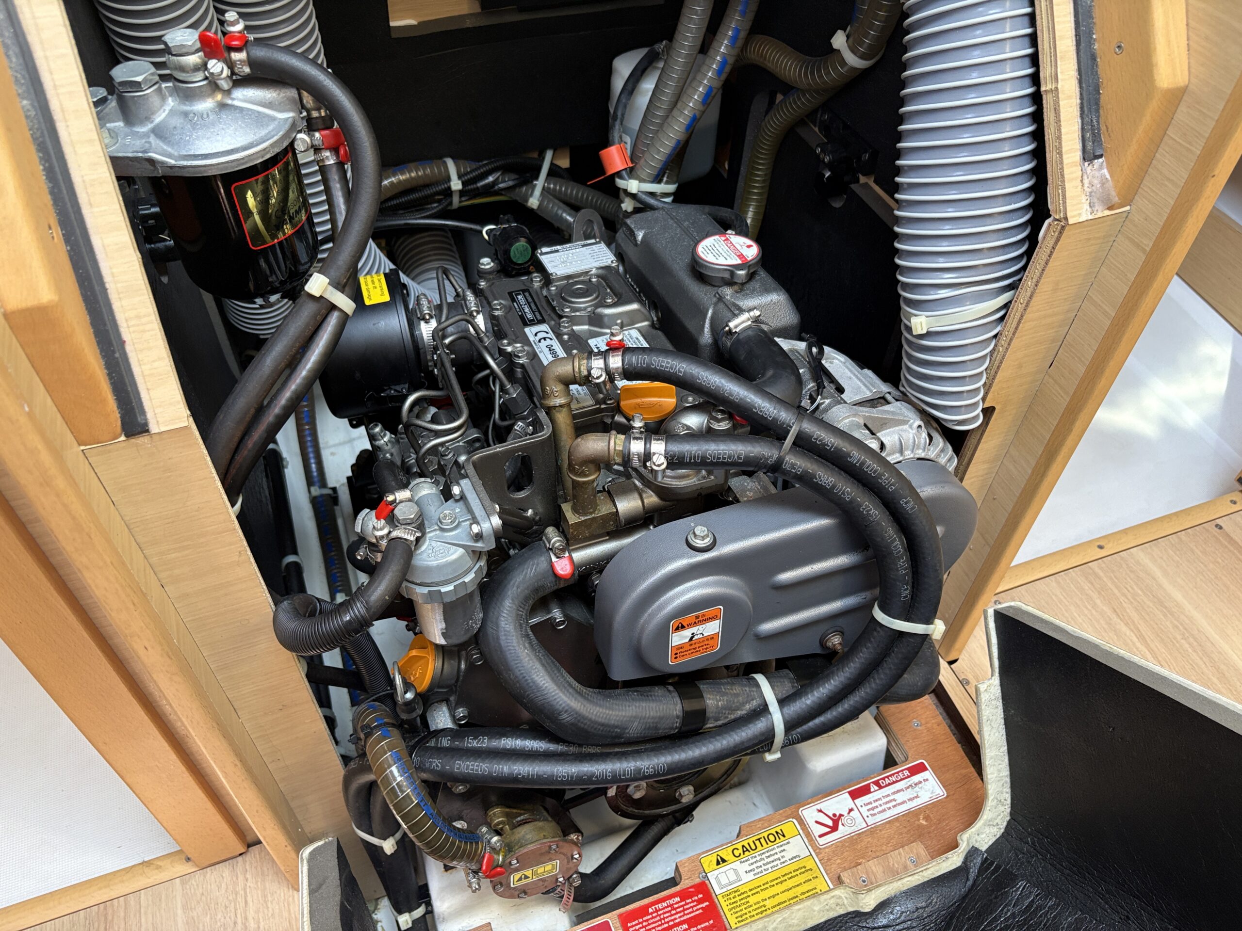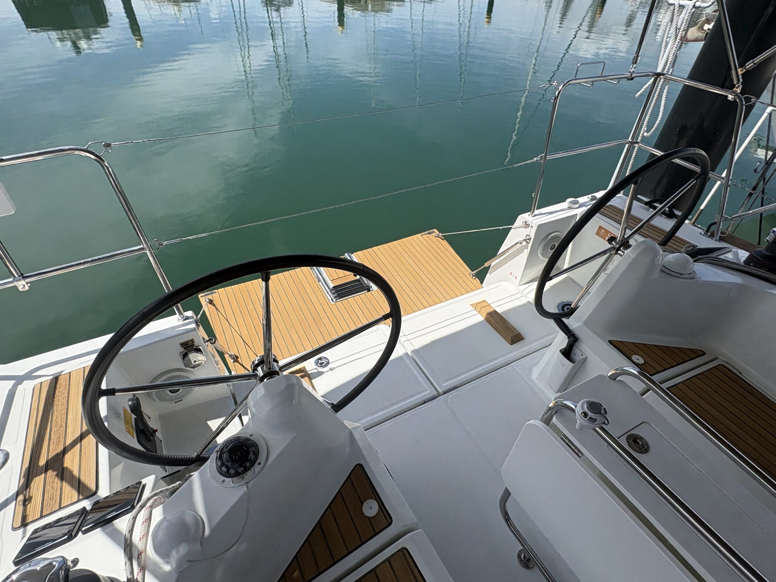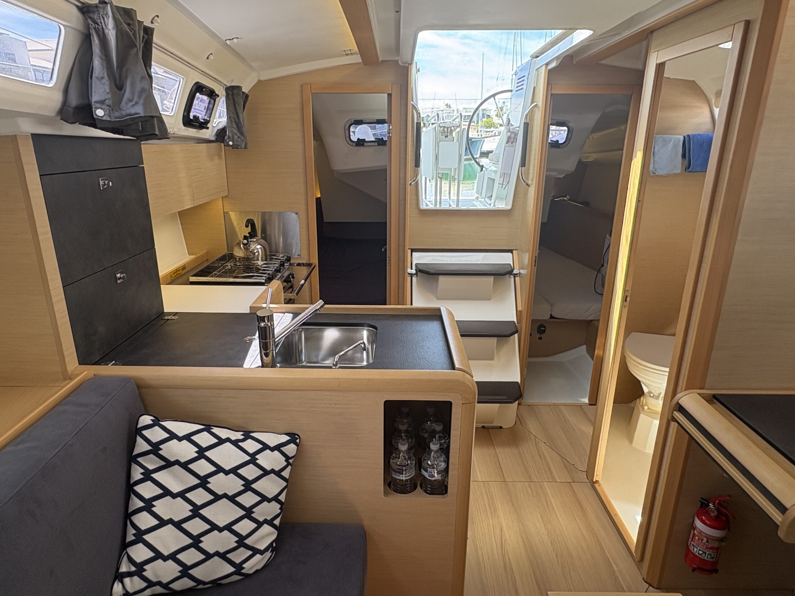 Designed with simplicity and efficiency in mind, Andrea features an in-mast furling mainsail and self-tacking jib, making sail handling straightforward whether sailing solo or with family and friends. A bow thruster provides added confidence when manoeuvring in tight marinas, while the Raymarine electronics package delivers reliable navigation and clear information at the helm.