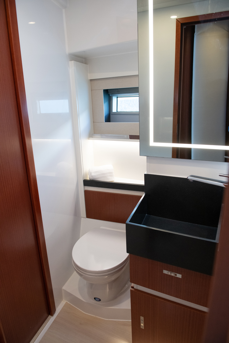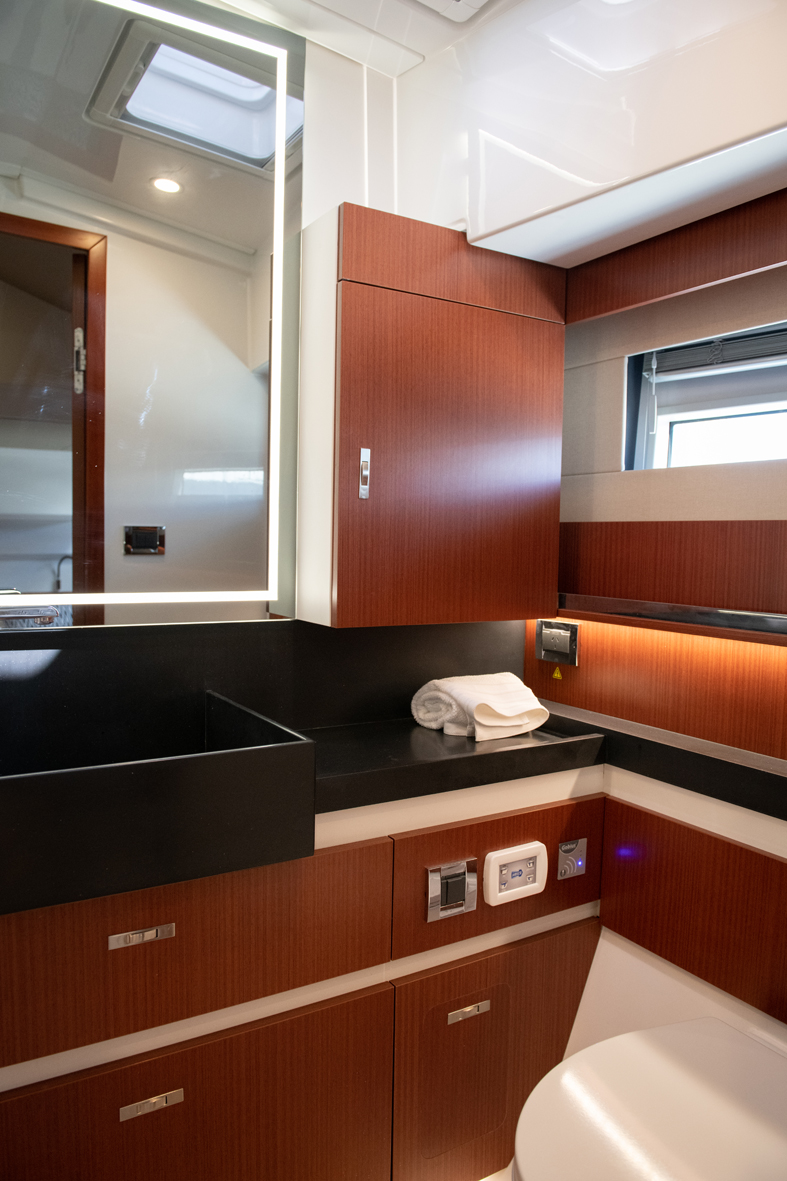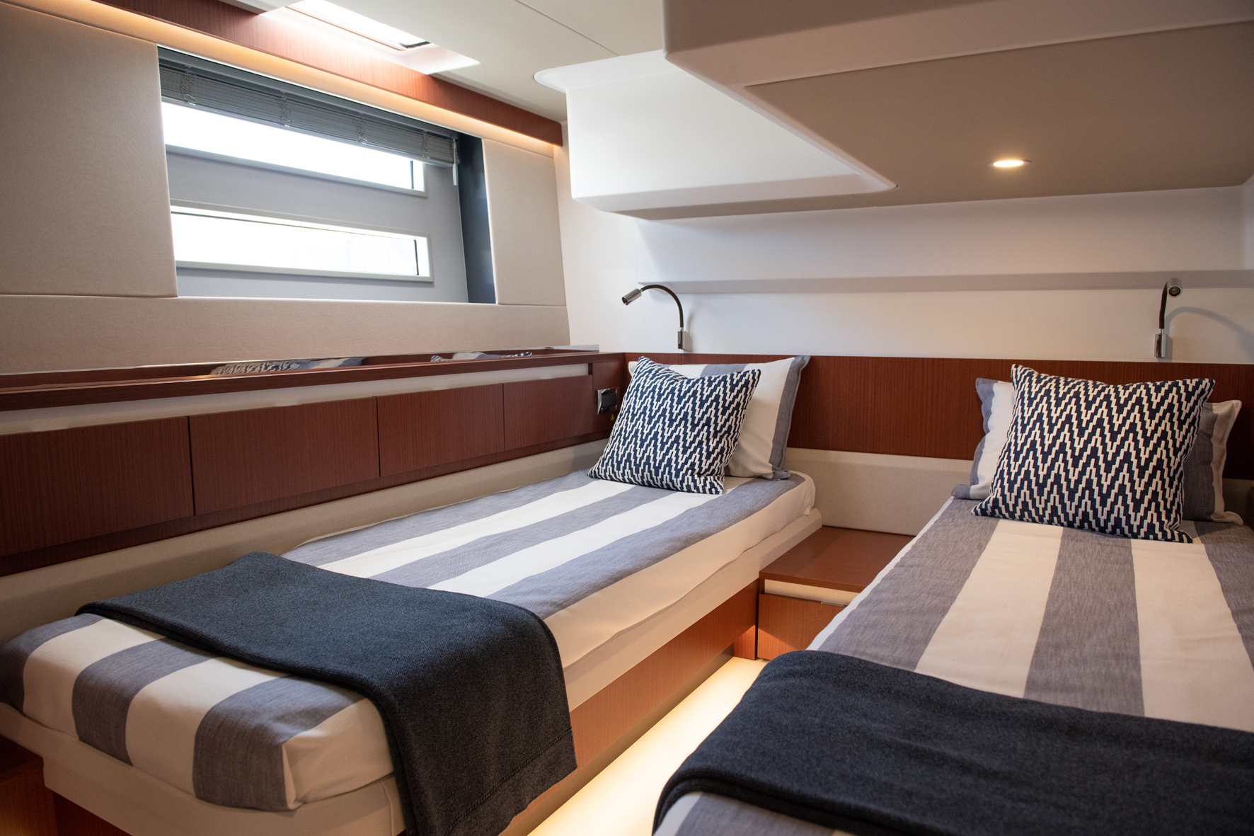Below deck, Pauline offers a tranquil retreat for extended cruising or elegant coastal living. The luxurious owner’s suite and two guest cabins each feature private ensuite bathrooms and separate showers, ensuring every guest enjoys comfort and privacy. The craftsmanship and attention to detail are evident throughout, from the premium finishes to the intelligent use of space that enhances both functionality and flow.