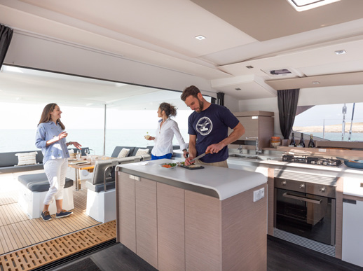 The trick is that the two aft-most cabins have their own companionways that emerge through an L-shaped plexiglass hatch onto the aft deck. Separated from the rest of the interior, these cabins would be ideal for older children or guests wanting their own space. They are proving popular with charter models.