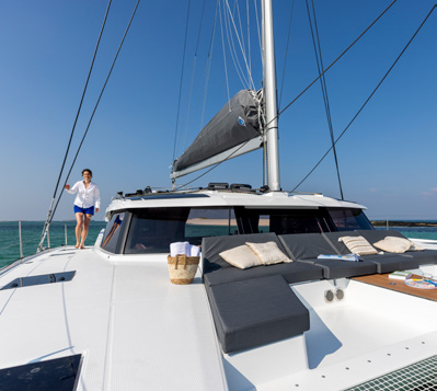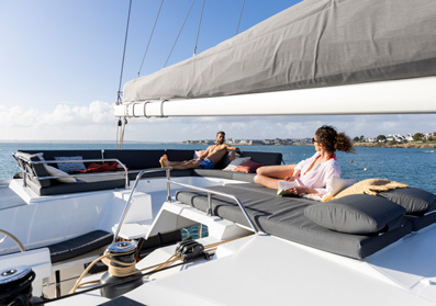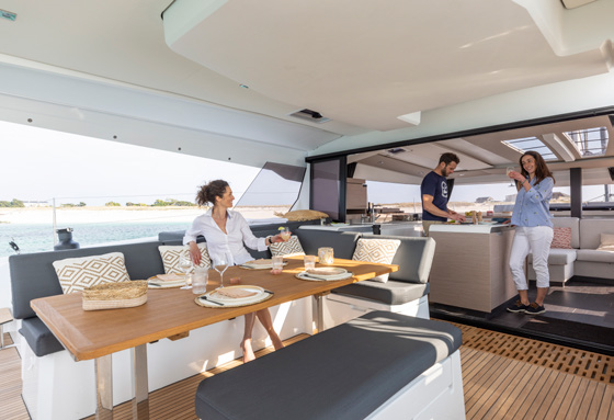 Perhaps this is another reason that the model has been named ‘˜Aura’. ‘œThe name evokes a halo of light, a vital force, and positive energies,’ explained head of marketing Hélène de Fontainieu who has proposed the name of every single one of the yard’s new models for 15 years. ‘œThis new catamaran signed by Fountaine-Pajot becomes the symbol of the commitment of the shipyard in its environmental transition.’