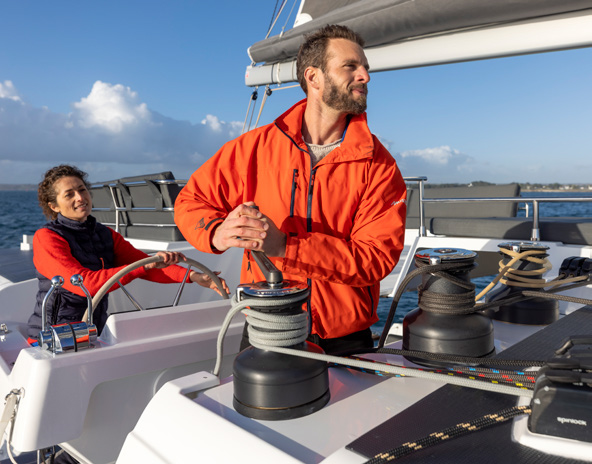 We were soon skimming southwest on a beat towards the glittering Ile d’Oléron. To make the most of the 95 square-metre square top main, we opened up the foot a little using the mainsheet traveller. We also toyed with the trim of the 59sqm genoa, whose sheeting point on the coachroof gives a nice tight sheeting angle for upwind work.