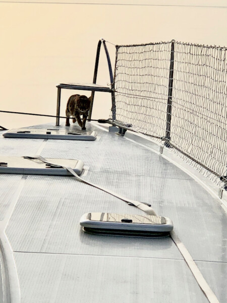 Next morning we crossed in what started in perfect flat conditions with a nice breeze on the beam, which made it perfect to use the headsail with one motor. The conditions lasted for a couple of hours and then it all turned into a churning foaming mess. Waves were breaking over the side and Shelley thought we had a problem with a bilge but it was a rather large wave breaking on the starboard hull. I slowed to 3 knots to try to stop the ghastly roller coaster. 3 knots means it will take us a month to get there but at least we will be not subject to the discomfort. We are on a catamaran so its usually pretty good stability, I’m laughing at how that did not seem like that in the moment. The Deva cat takes up a position in the centre of the salon where it is most comfortable, after her one day of seasickness in the beginning she now takes it all in her stride.