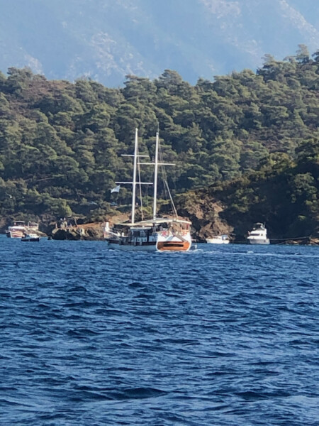 We motored into Fethiye, around the numerous weekend sailors and the tourist gulets. There was a mono I thought was anchored but it was drifting along in 100 metres of water with 2 blokes stark naked jumping off the back. Lithe young fellows they were not. We altered course to avoid them and their wobbly bits.