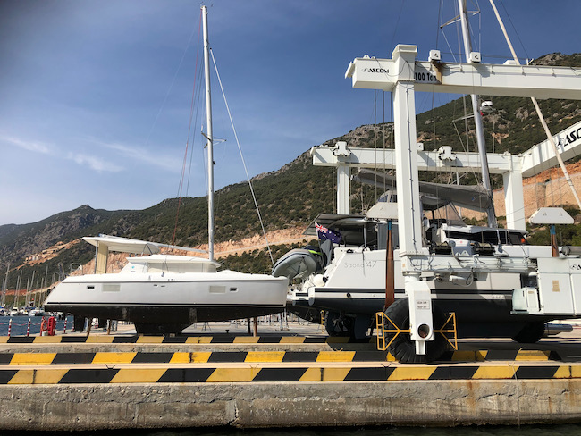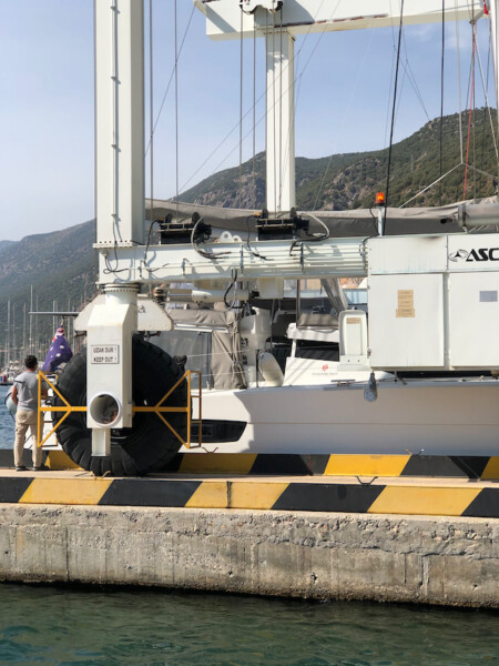 But first a stop in KaÅŸ for a week at one of the sister marinas of Finike. Our buddy boat had to have a haul out. It sounds very easy but involves manoeuvring the boat into a very tight concrete space and they put a sling around and pull you up with a whopping great lift thing.