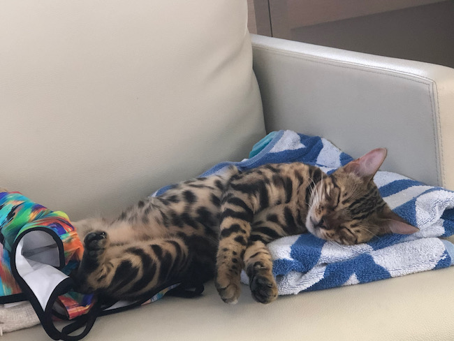 I jump back onto our boat and wash her with warm fresh water. We warmed towels in the microwave and I wrap her in them to dry her and stop her shivering. 1 hour later she has totally recovered and is not the least bit grateful.